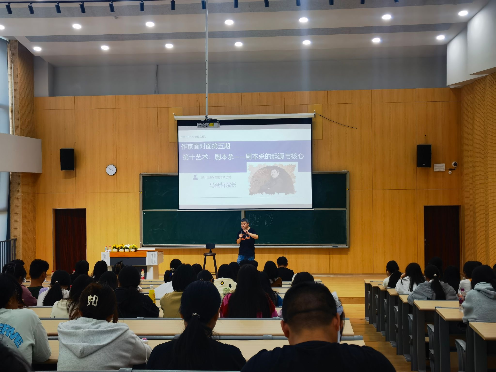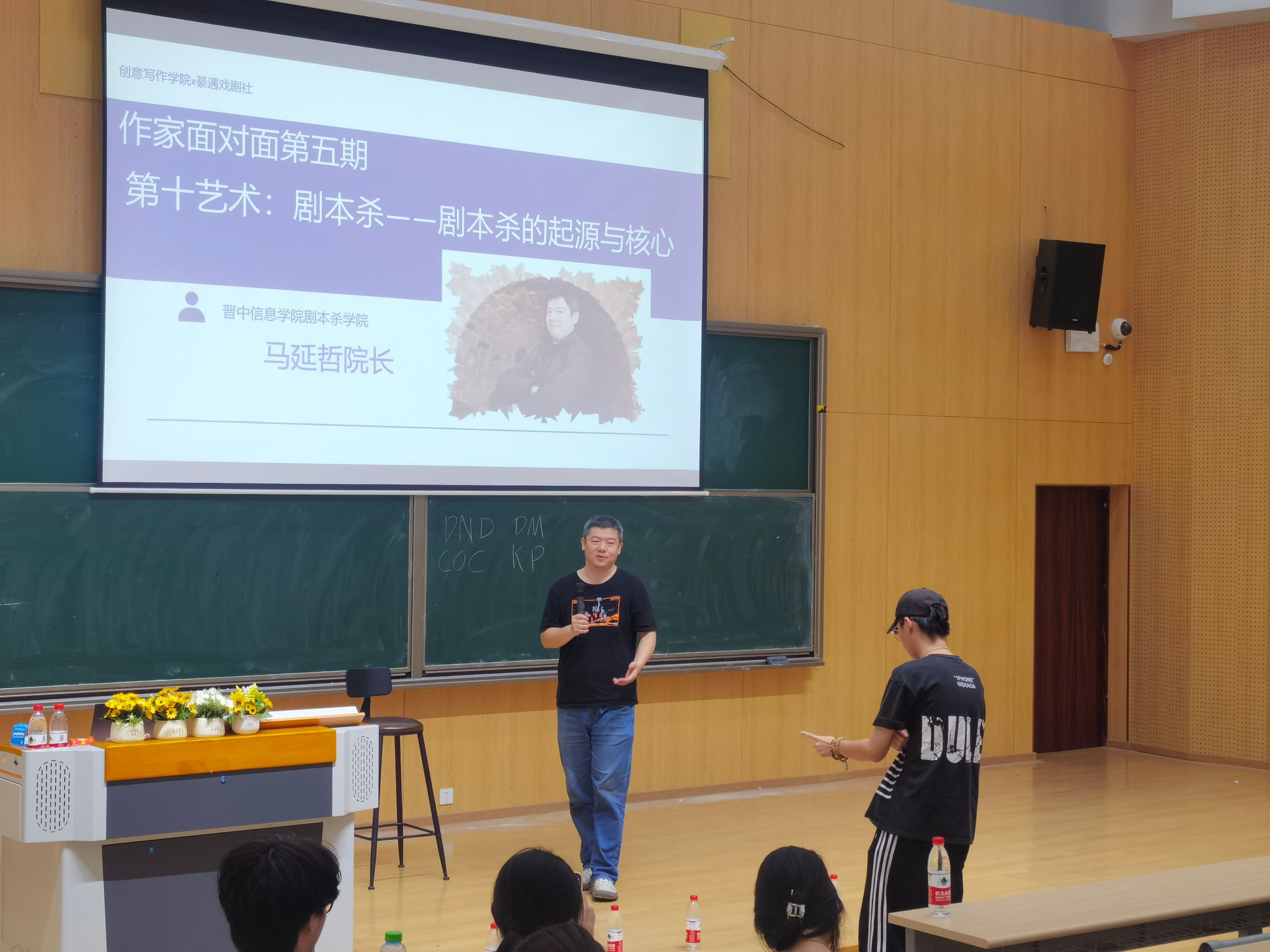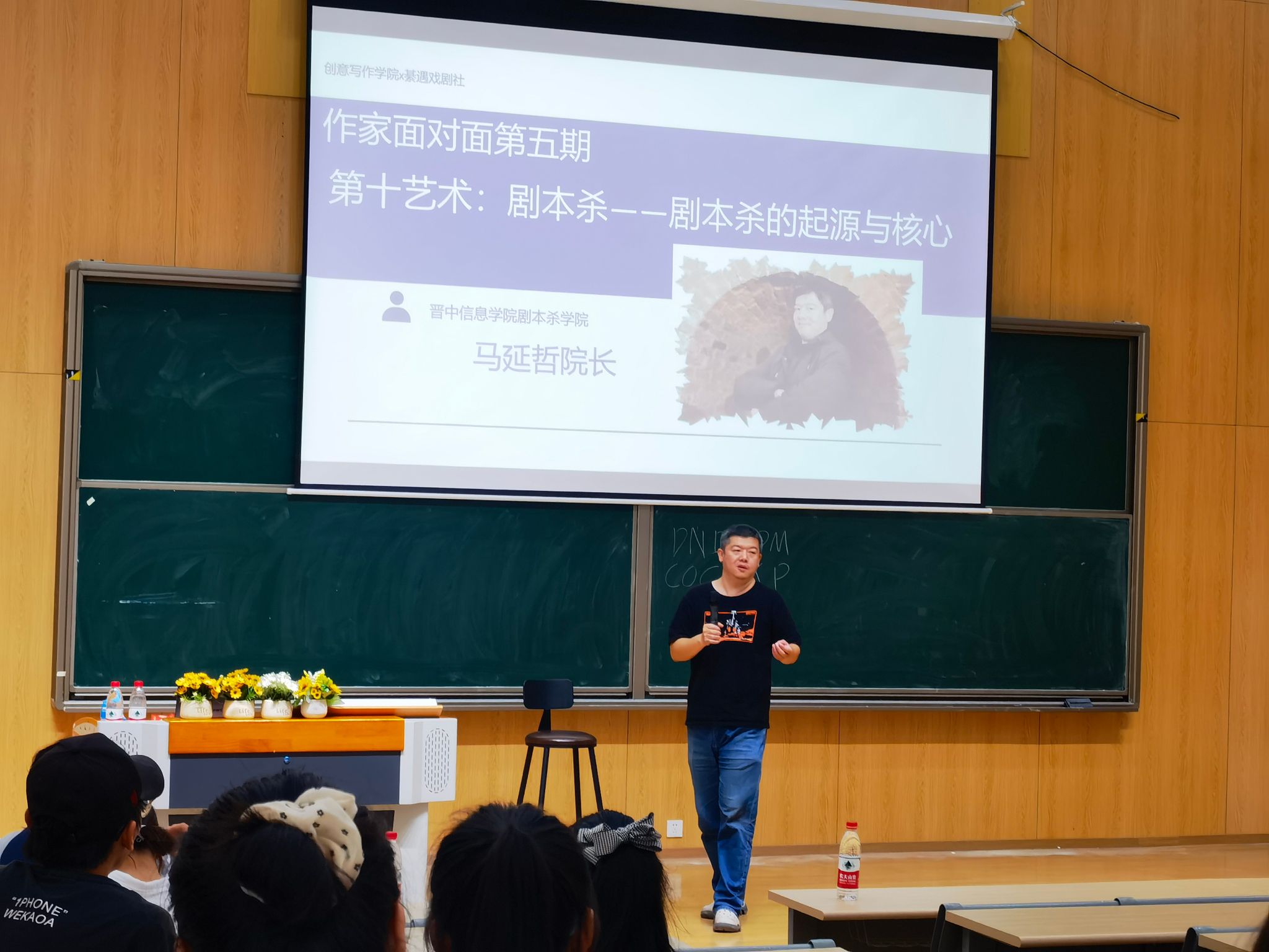 10月17日下午,綦江校区创意写作学院“作家面对面”第5期活动在玉棠书院阶梯教室进行,由著名作家、晋中信息学院云端剧本杀学院马延哲老师来进行《剧本杀——剧本杀的起源与核心》文学讲座。全场与会的同学,都被这场讲座紧紧抓住了,尤其是爱好剧本杀的同学,更是见到了剧本杀界的“真神”马老师而激动。创意写作学院綦遇创意戏剧社承办了这场活动,社长王宏波、副社长王玲,演艺部部长刘毅增等同学多日来一直在工作,指导老师丁一钒、王恒绩全程指导并协调,使得活动取得圆满成功!