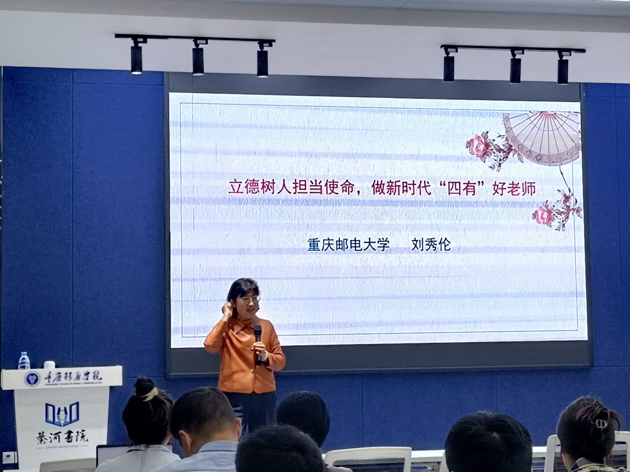 培训过程中,重庆邮电大学刘秀伦教授以“立德树人担当使命,做新时代‘四有'好老师”为题,做了一堂生动的主题报告。“道,所行道也”,“德,外得于人,内得于己也”希望新老师遵守教师职业道德,加强学习,了解学校的各种规章制度和管理要求,学习学校教育、教学模式,提高教书育人能力,齐头并进,以学生为中心,努力成为学生的良师益友,做学生生活的“知心人”、健康成长的“引路人”、道德行为的“示范人”。持续深化“三全育人”工作,落实立德树人根本任务,助力学生全面发展,争做新时代的“四有”好老师和素质教育的排头兵。