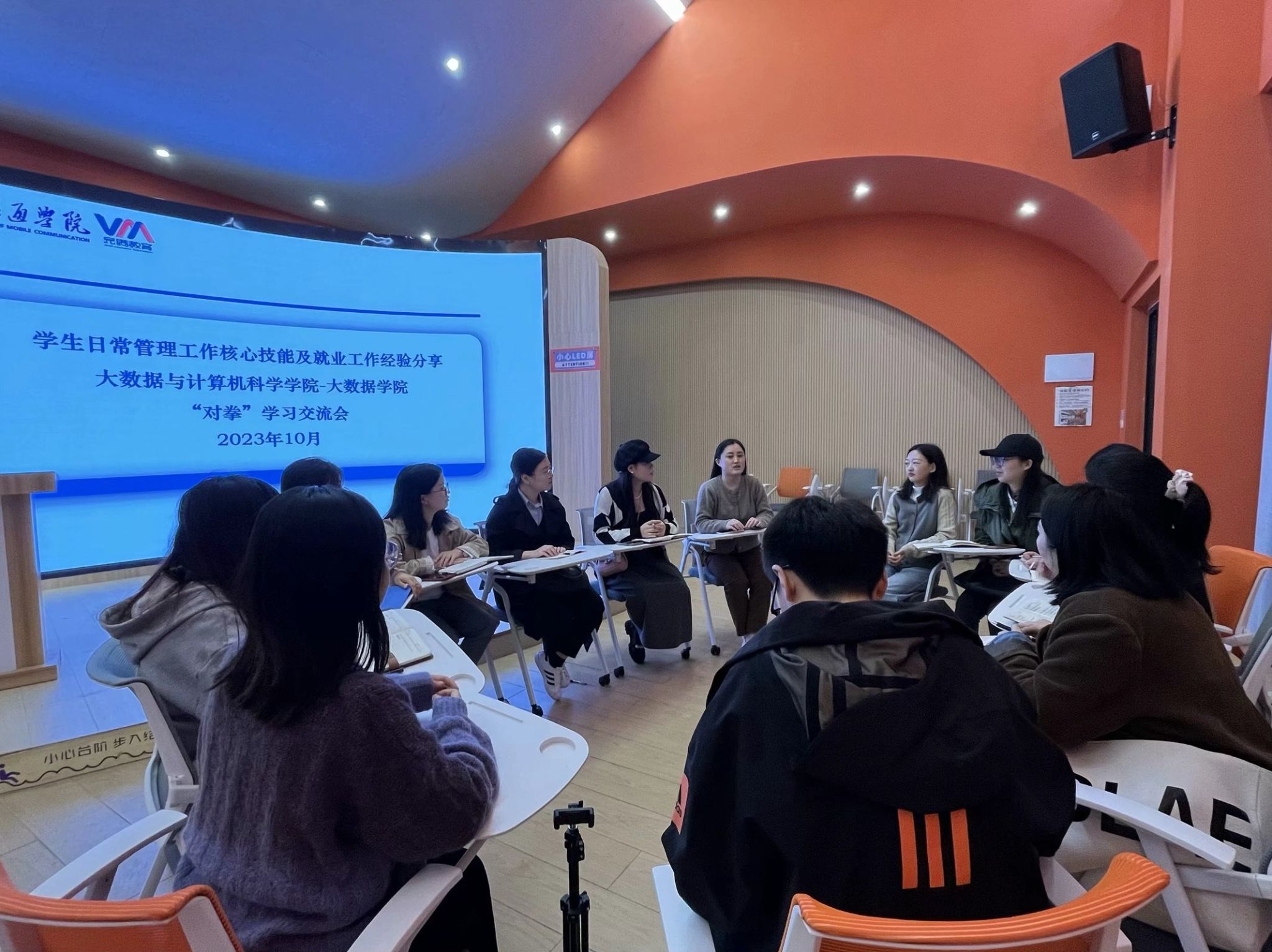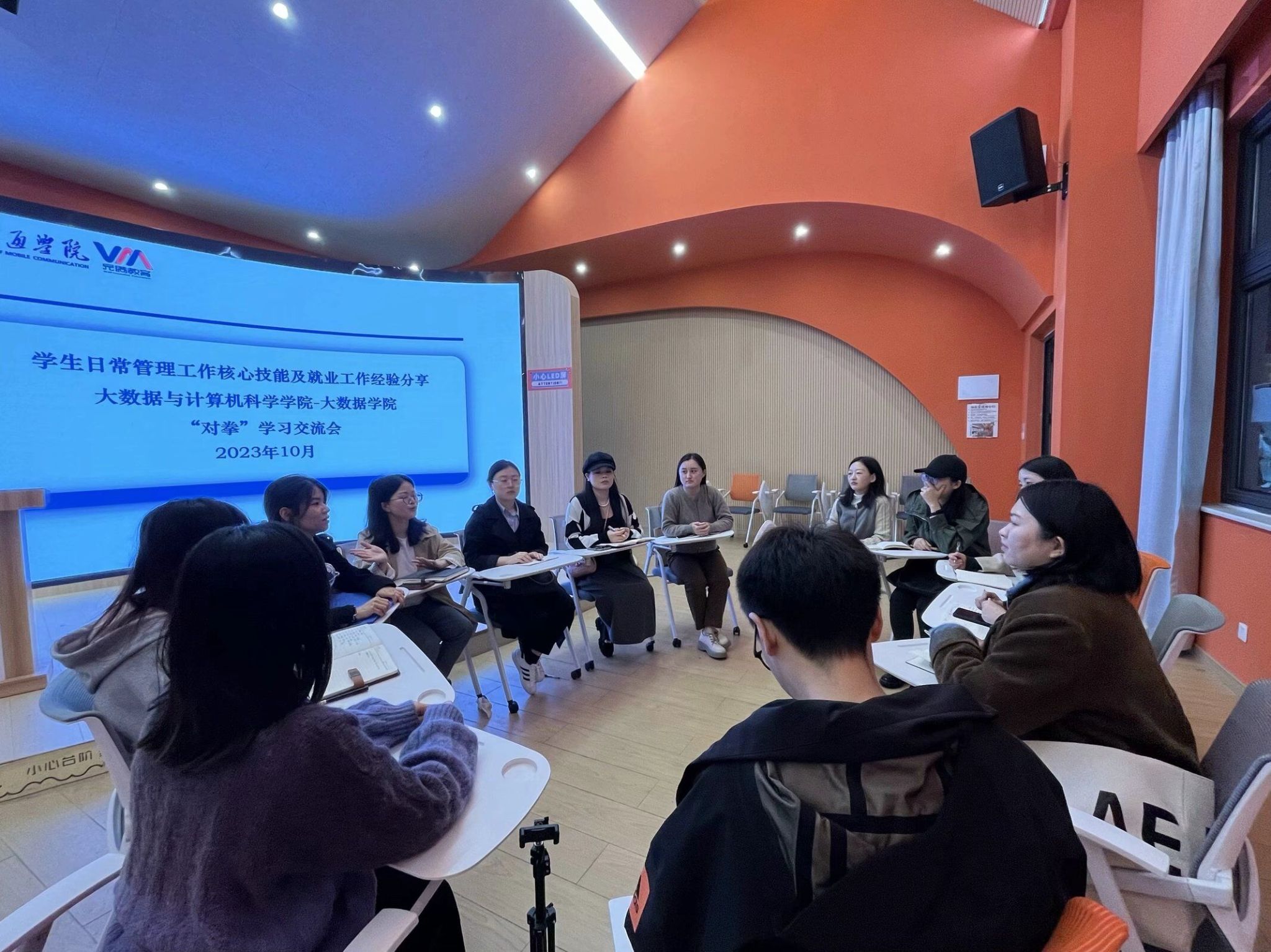 为增进双校区间的交流融合,分享交流学生工作经验,切实提高学生日常管理工作核心技能,10月25日下午18点,大数据学院与大数据与计算机科学学院在古剑书院含光报告厅开展了双校区学院的“对拳”学习交流会,学院学工副院长阙小梅老师、团总支书记兰宇老师、学工办主任李进老师、就业创业办公室主任周义巧老师以及合川校区、綦江校区全体辅导员参加了交流会。