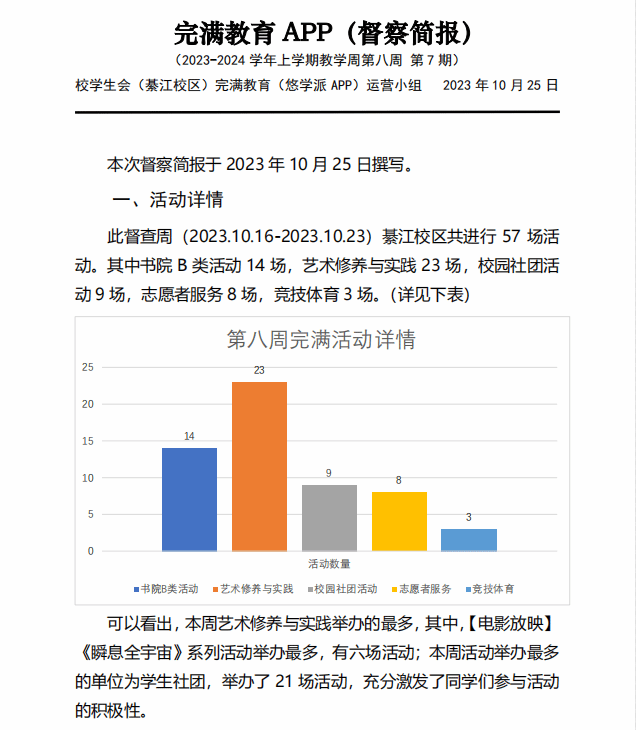 校学生会学习部,他们在完满教育“悠学派”APP常态化运营中,以“悠学派”为抓手,做好完满教育学分工作及活动质量规范督查工作,组建专业化运营团队并制定常态性运行机制,使悠学派管理运营更加规范化,为此每周更新督察简报,目前已8期,每月更新学分公示,目前已2期。作为同学们的完满教育学分保卫者,他们始终把同学们的使用感放在第一位,以打造一个更好的平台,让同学们能够积极的参加到完满教育日常活动当中去展现自我、锻炼自我、实现自我。不仅如此,他们还在每一次的工作中总结经验,努力发挥自己的才干,并将我们的赤诚之心融入学习与生活中,更好地服务于同学。