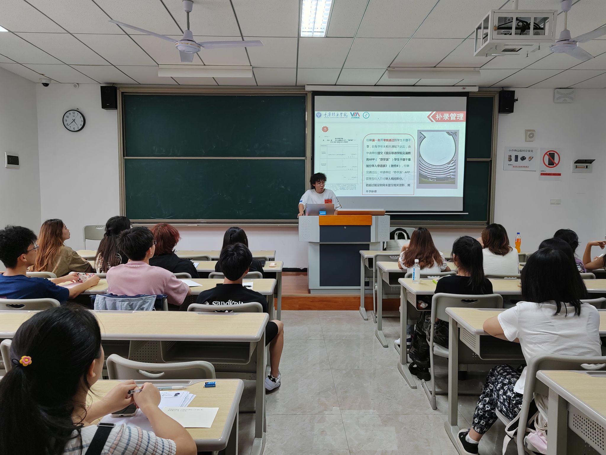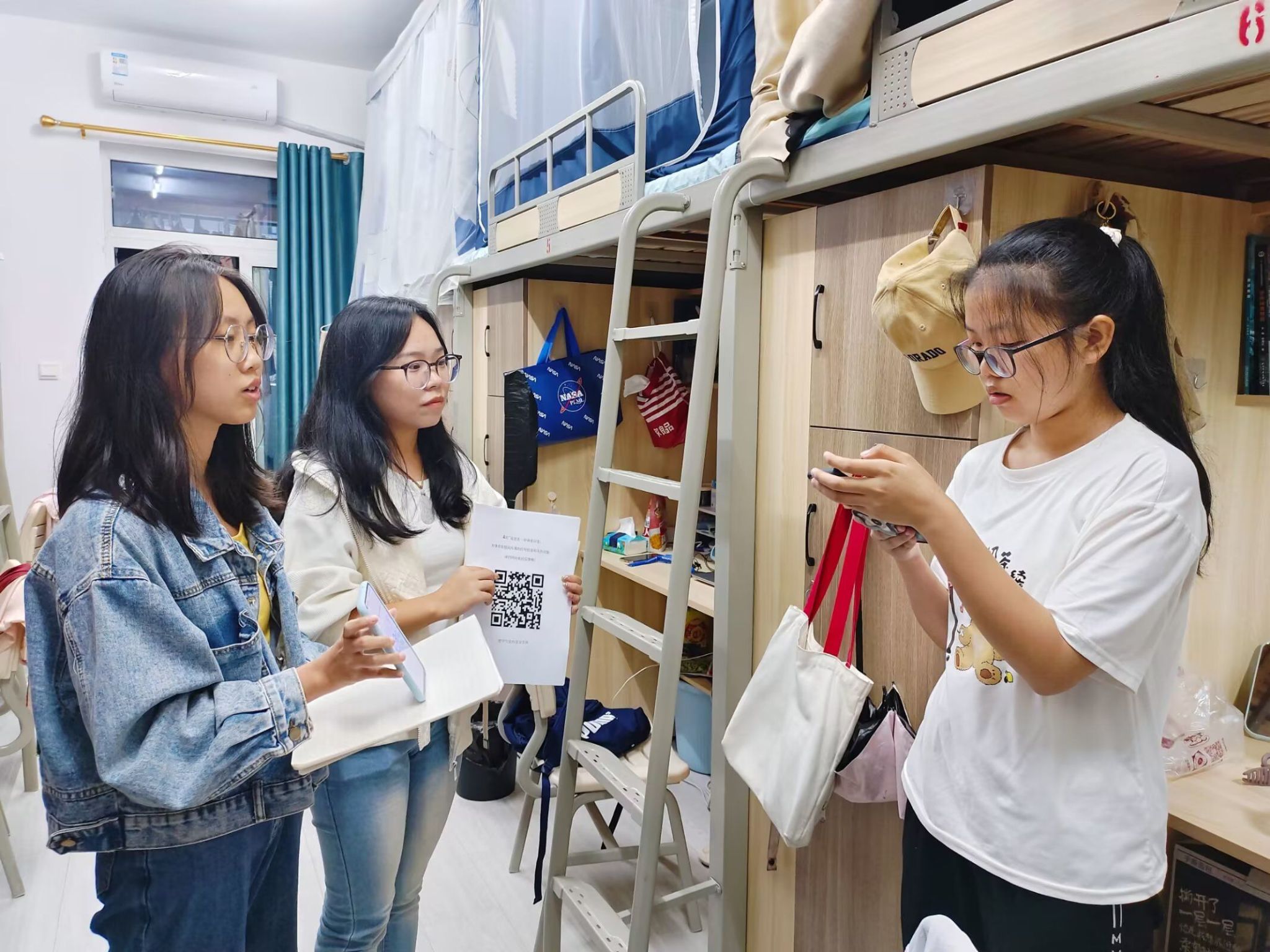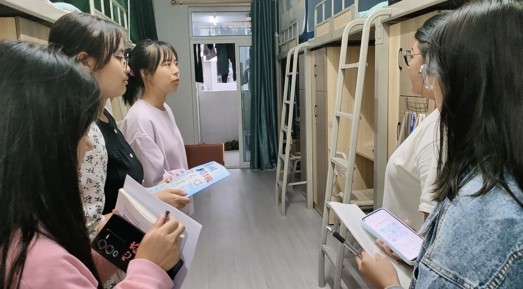 不仅如此,为更好保障学生宿舍安全,帮助同学了解住宿规范与反诈知识,校学生会权益女生部与宿舍管理中心合作开展了“关怀入寝,温暖入心”-校学生会开展新生查寝工作,给同学们讲解了最新的反诈知识与宿舍电器使用规范,保障每位同学的住宿安全。