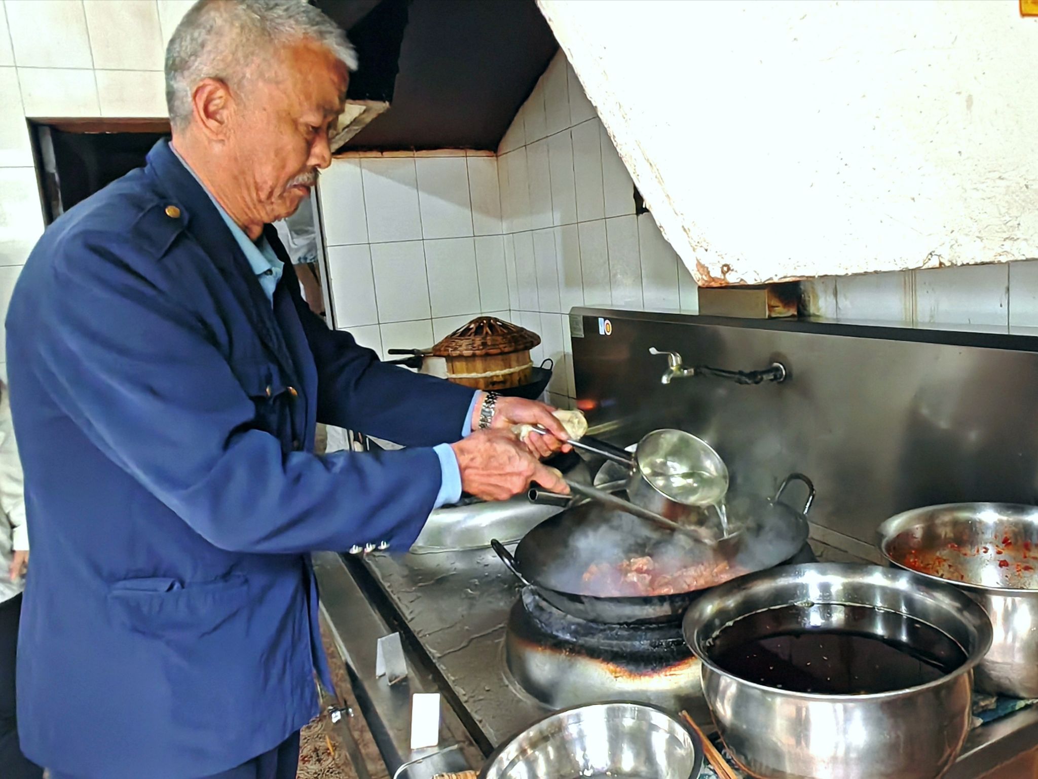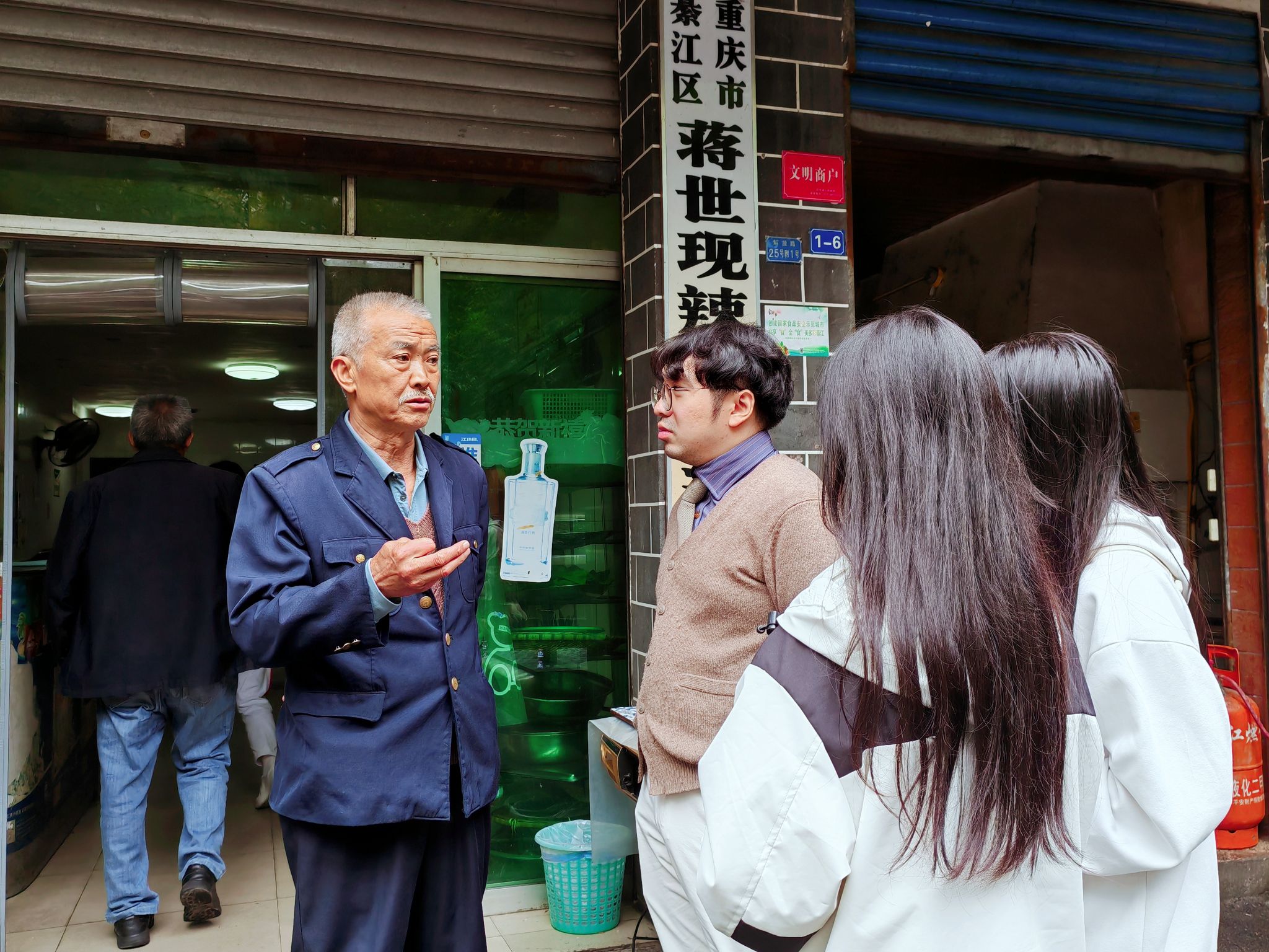 第一站,是位于赶水政府门口的“赶水蒋家辣子鸡”。技艺传承人蒋世现老先生对调研小队表示了欢迎,并介绍了“蒋家辣子鸡”的创业历程与食客故事。
