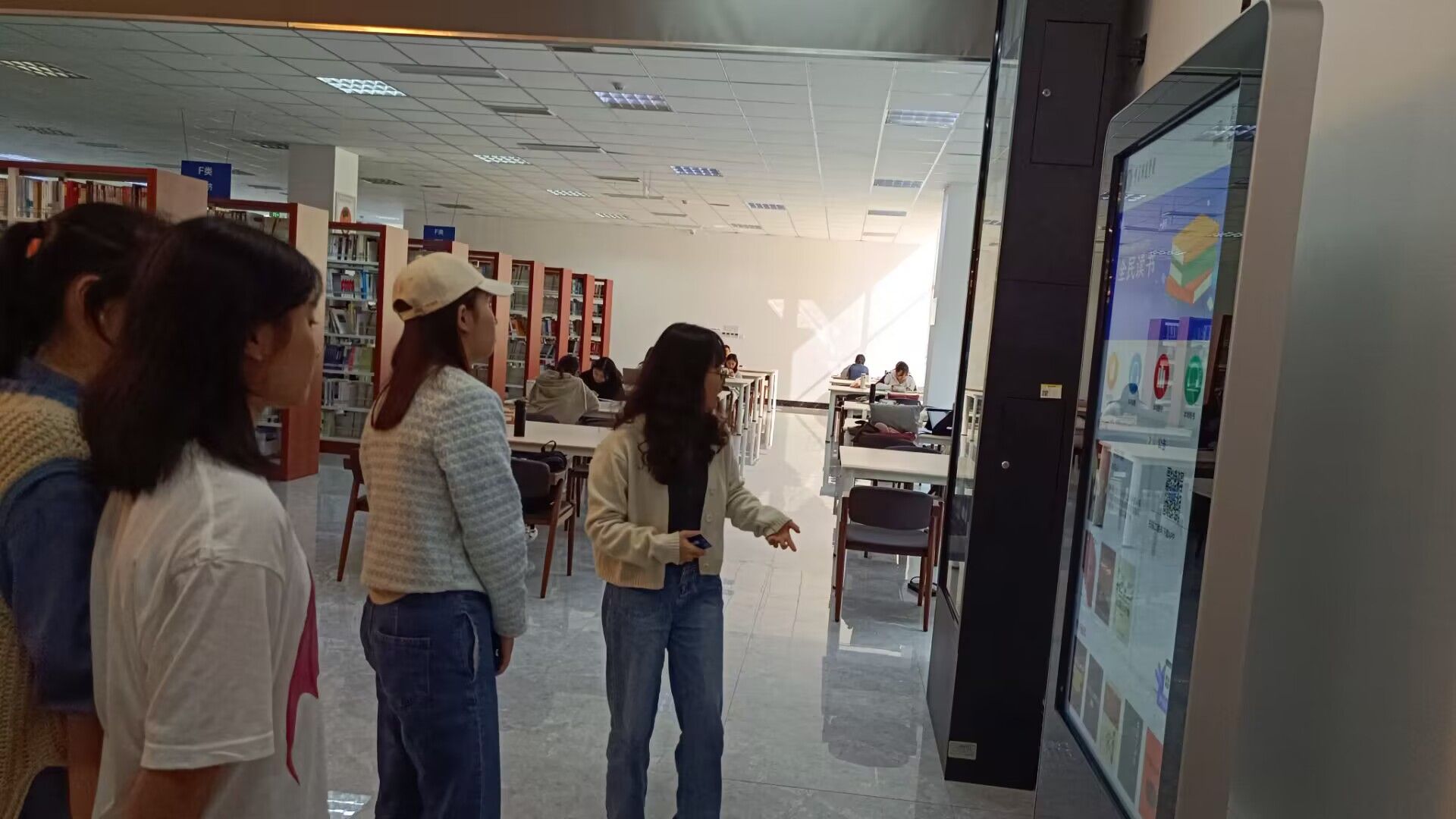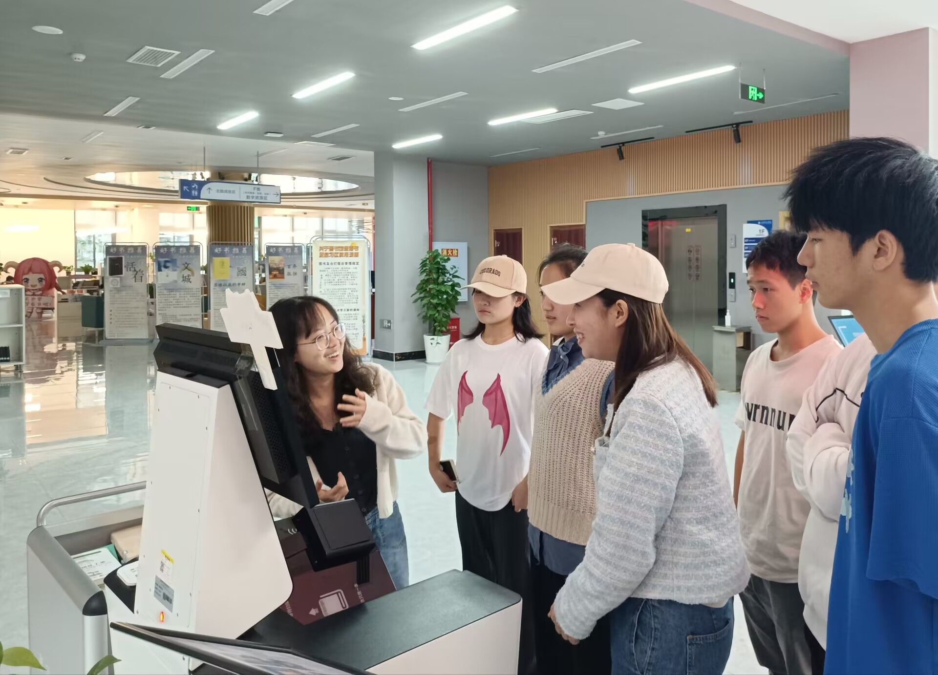 紧接着图书馆老师带大家移步到离服务台最近的自助借还机旁,并问到“有人知道这是干什么的吗?”同学们看到上面有个很大的“借”字,便不约而同地说是用来借图书的,老师点头示意正确,然后又告诉同学们这个设备不仅可以借、还图书,还可以看到自己借阅的图书是否归还、缴费等一些基本作用,老师便细心地为新生们演示了如何正确使用自助借还机设备;了解了借还书籍的方法后,老师又带同学们移步到了图书馆一楼的查询机旁边,然后告诉了大家如何使用这台查询机,并让同学们进行了实操。这时有细心地同学发现了在查询机旁边有个很高的设备,便询问老师这是什么?老师又告诉大家除了咱们馆藏纸质图书外,图书馆还有独特的数字资源设备,譬如电子书借阅机、电子图书“瀑布流”,并向大家具体演示了详细地使用方法。