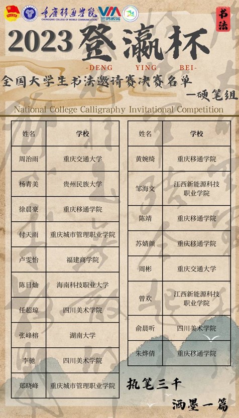 为了给大家提供一个关于书法的交流平台,一个供大家展现自我才华能力的舞台,2023登瀛杯·全国大学生书法邀请赛面向各大高校热爱书法的同学展开作品召集,硬笔、软笔2个专项书法赛道,经过赛事组委会推送专业评审团评选,双赛道共选出129名同学进入复赛环节。