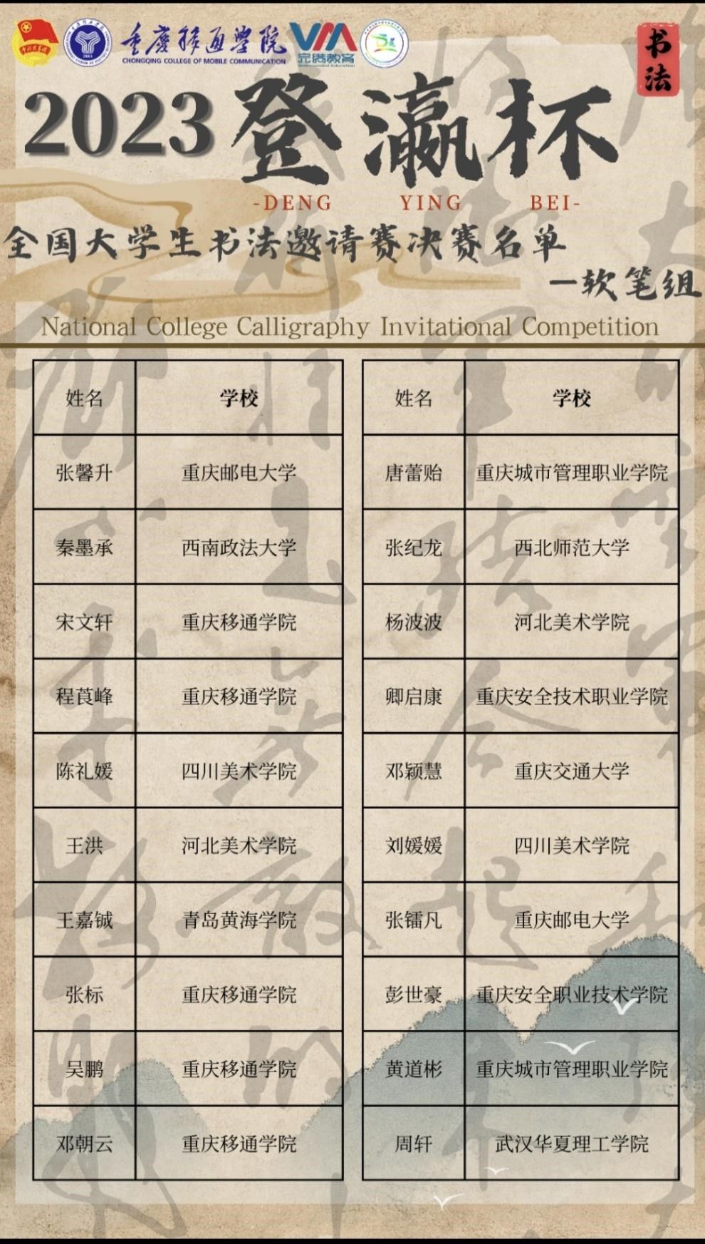 2023登瀛杯·全国大学生书法邀请赛作为重庆移通学院綦江校区举办的首届全国书法赛事,努力打造传统系列品牌赛事,致力成为中国书法文化的推动者和引导者,希望能通过此次赛事在各大高校大学生群体中形成积极影响,使其成为中国书法的新鲜血液,推动书法文化的传承和发扬。人生如书法,泼墨挥毫,一笔一捺皆为恣意。从横竖撇捺传承人生之精神,作为拥有五千年历史的文化宝藏,书法将走进更多人的生活,绽放时代精神。
