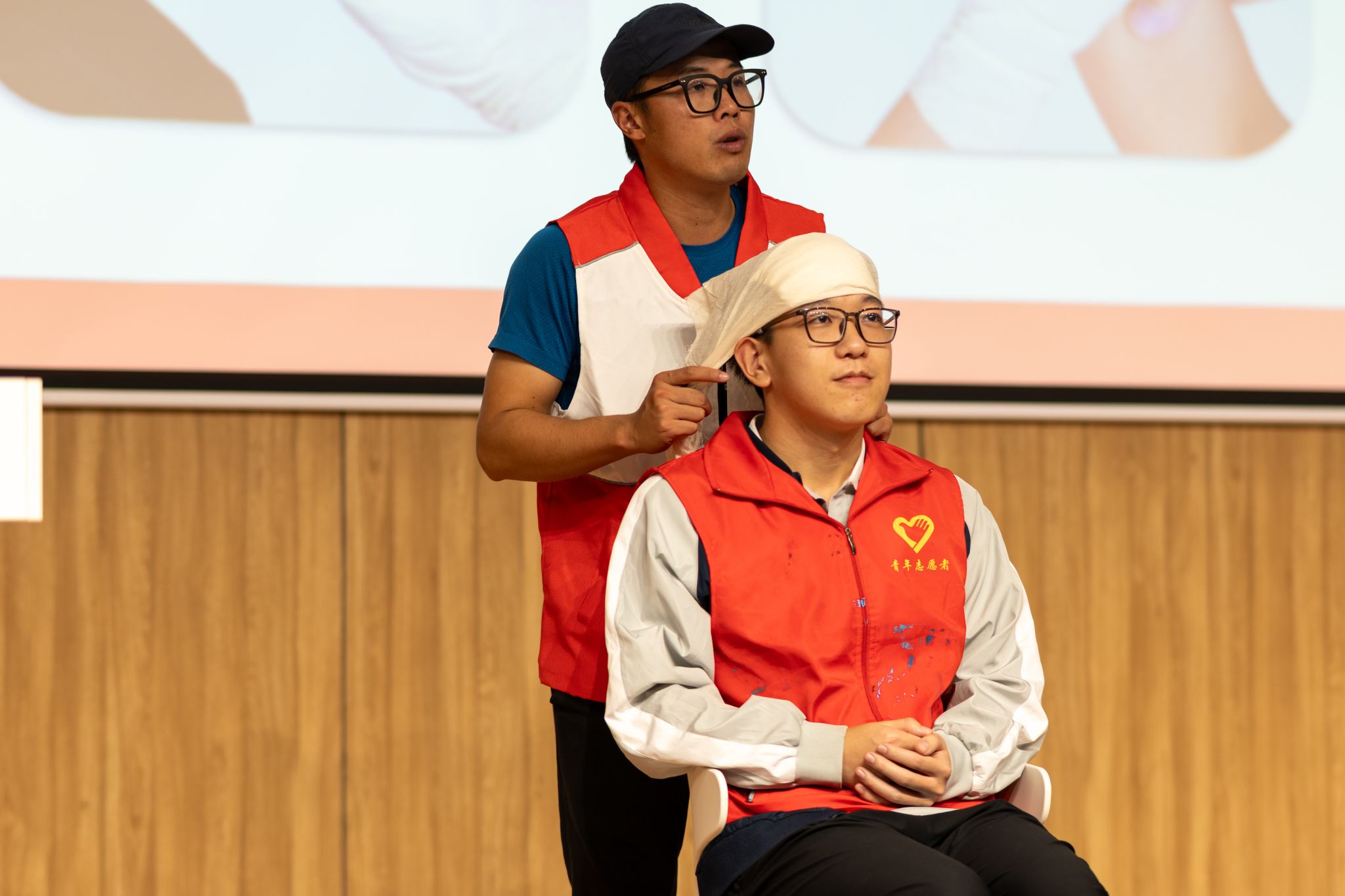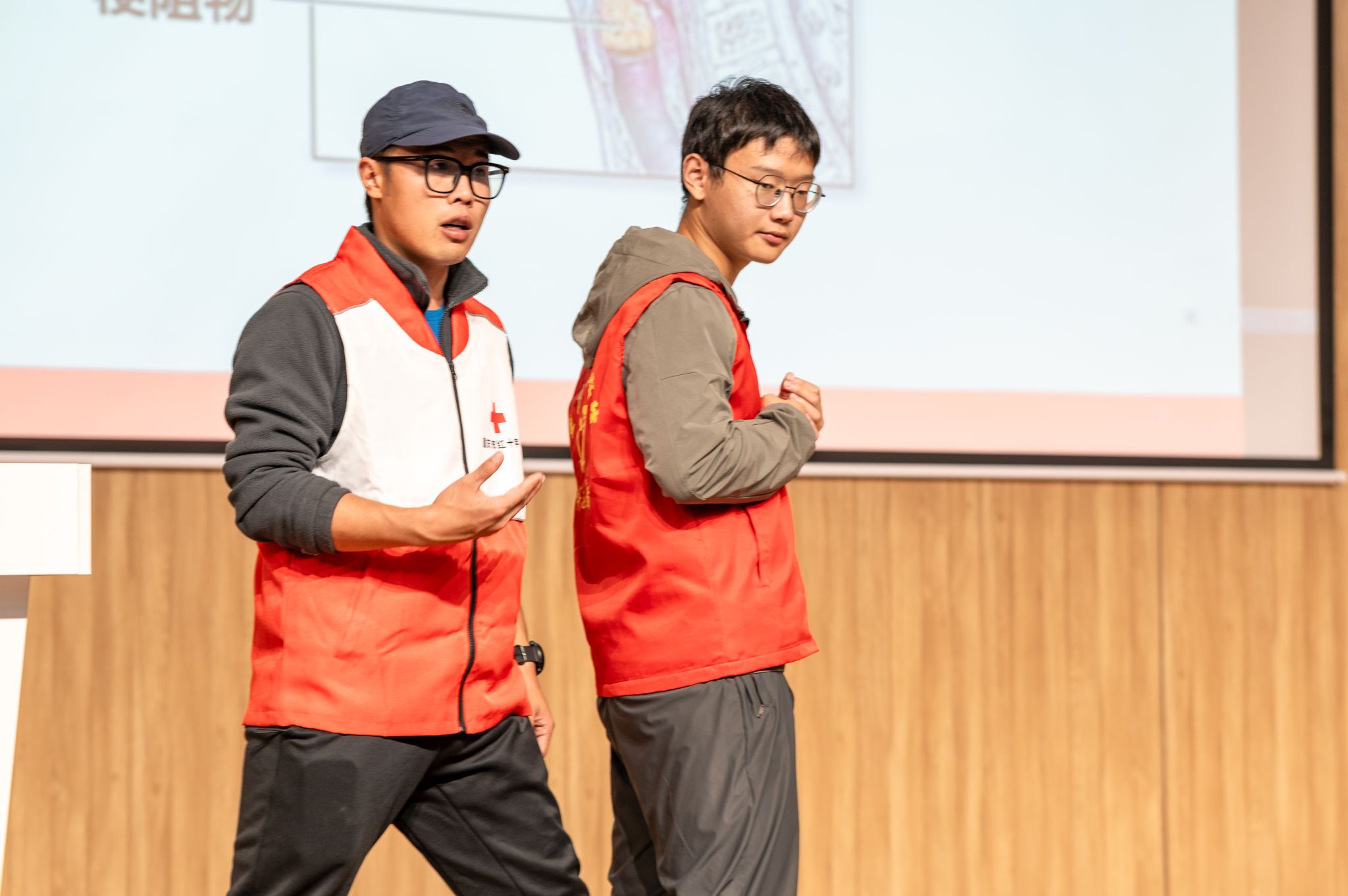 为确保同学们能够更好地掌握实际操作技能,本次急救讲座还增设了实践操作环节。首先由段超老师展示心肺复苏救护、气道梗塞急救法以及创伤救护四项技术的基本操作方式。随后,同学们踊跃上台进行情景演练,在段老师的指导下进行心肺复苏、止血处理、骨折固定等实践训练,段老师强调包扎时要注意绑带的紧度,过紧会影响血液循环,过松则无法起到固定和保护的作用,整场实践结束后,同学们也更加清楚如何在实际突发情况时使用最合适的急救方法。本次培训利用“理论+实践”的方式全面增强了同学们处理突发事件和紧急情况的应急救援能力。