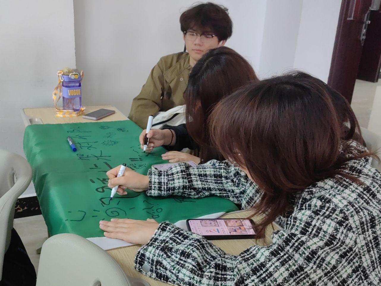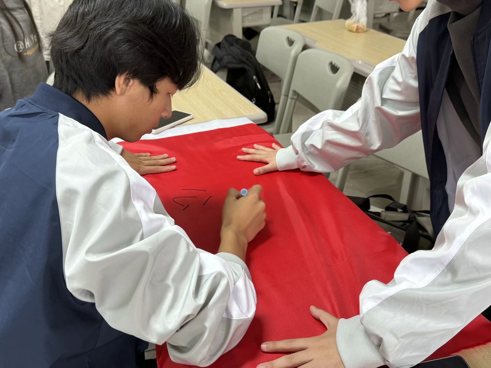 “你看,我们队画的虾不错吧!”“我们队一定要想个出其不意的队名。”中午一点,在仁者楼411教室,参加活动的同学们正在热火朝天的进行团队文化建设。各小队根据自己的队名,设计队旗、口号并选出小队长。每个队伍的旗帜都别出心裁,亮眼的队名、醒目的口号以及充满想象的绘画设计,无一不展现同学们对本次活动的极大期待。各小队集结完毕后,在校学生会工作人员的带领下前往校门口乘车,一同前往古南街道春光村。路途中,各小队激动的讨论着本队的作战计划,誓要拿下第一,做最会捉虾的小队。