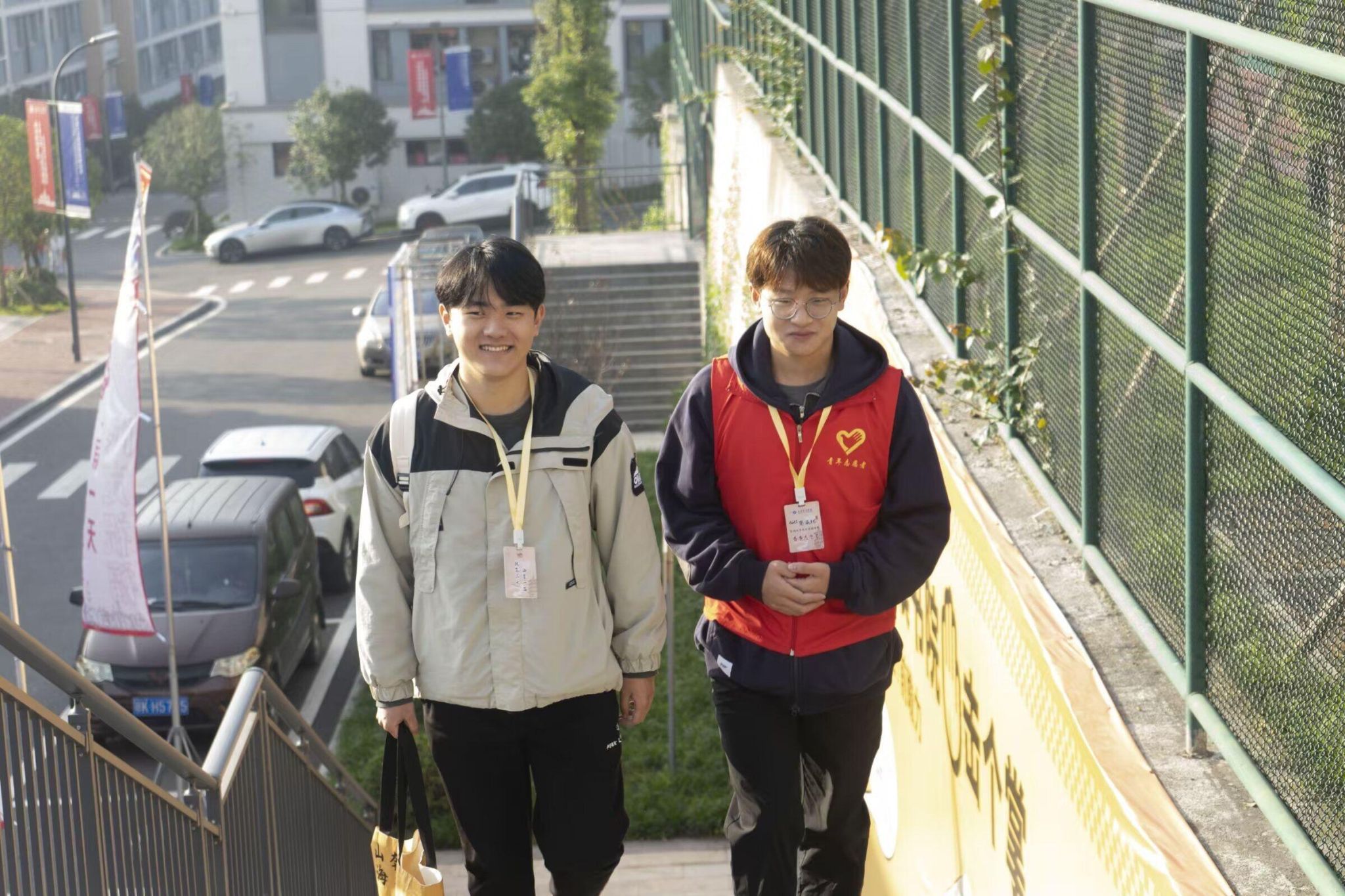 清晨,志愿者们提前到达赛事场地,身着红马甲,以饱满的热情迎接五湖四海的参赛选手,带领参赛选手登记注册,志愿者全程跟随服务成为选手“小闹铃”。在志愿者的陪同下,选手们参观校区,体验学习氛围,了解我校“四位一体+双院制”人才培养模式,对我校“完满教育”育人理念有了进一步认识。考虑到参赛选手的身体状况及天气影响,学校还特意为选手提供休息区域,保证选手们在赛场上的极致发挥。
