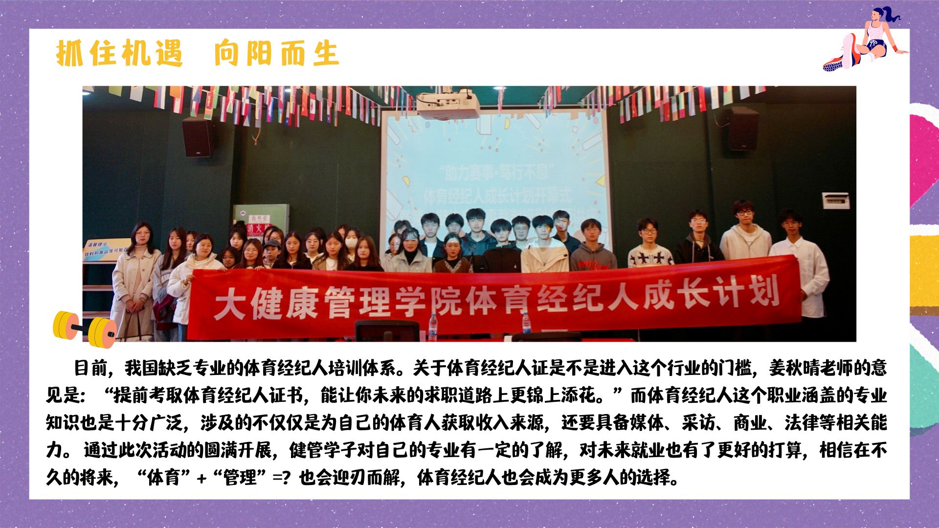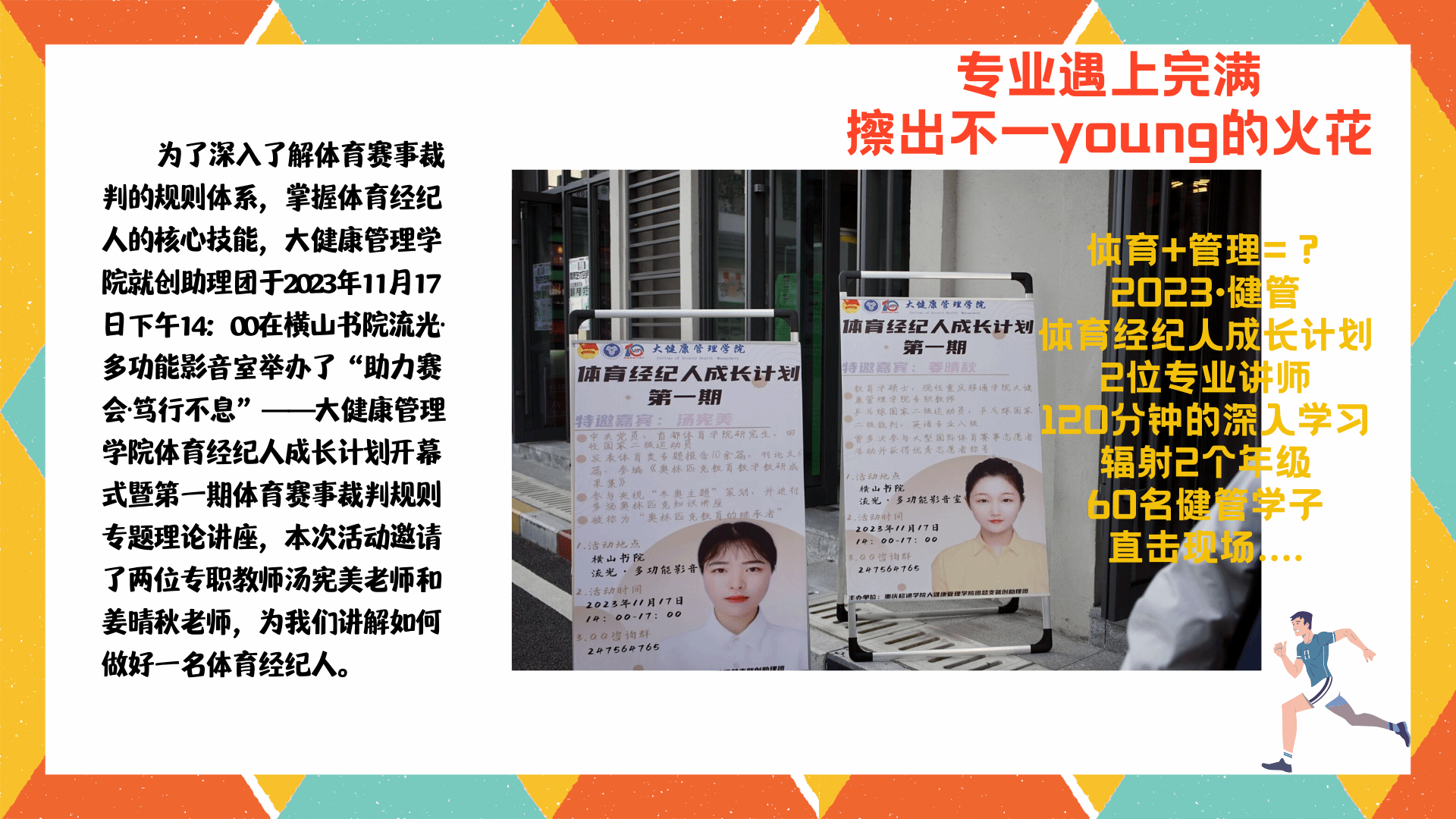 专业技能精进,新一代年轻人的希望在更远、更美好的路上,希望健管er们坚定选择的初心,梦想成真,唯有实干!自此“体育+管理=?体育经纪人成长计划开幕式暨第一期体育赛事裁判规则专题讲座”圆满结束!我们下期再见!