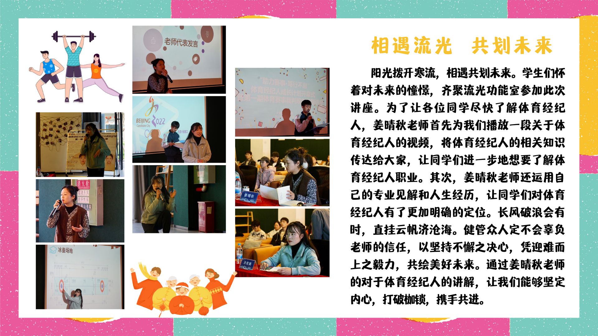 阳光拨开寒流,专业碰撞完满,相遇共划未来。由大健康管理学院团总支就创助理团举办的第二届“体育+管理=?体育经纪人成长计划”活动,于11月17日14:00正式开始。健管er们怀着对未来的憧憬,齐聚流光功能室参加此次讲座,希望在本次活动中能以我辈之力助体育强盛,以体育之力助国家富强。接下来,带大家一起走进本次活动吧!