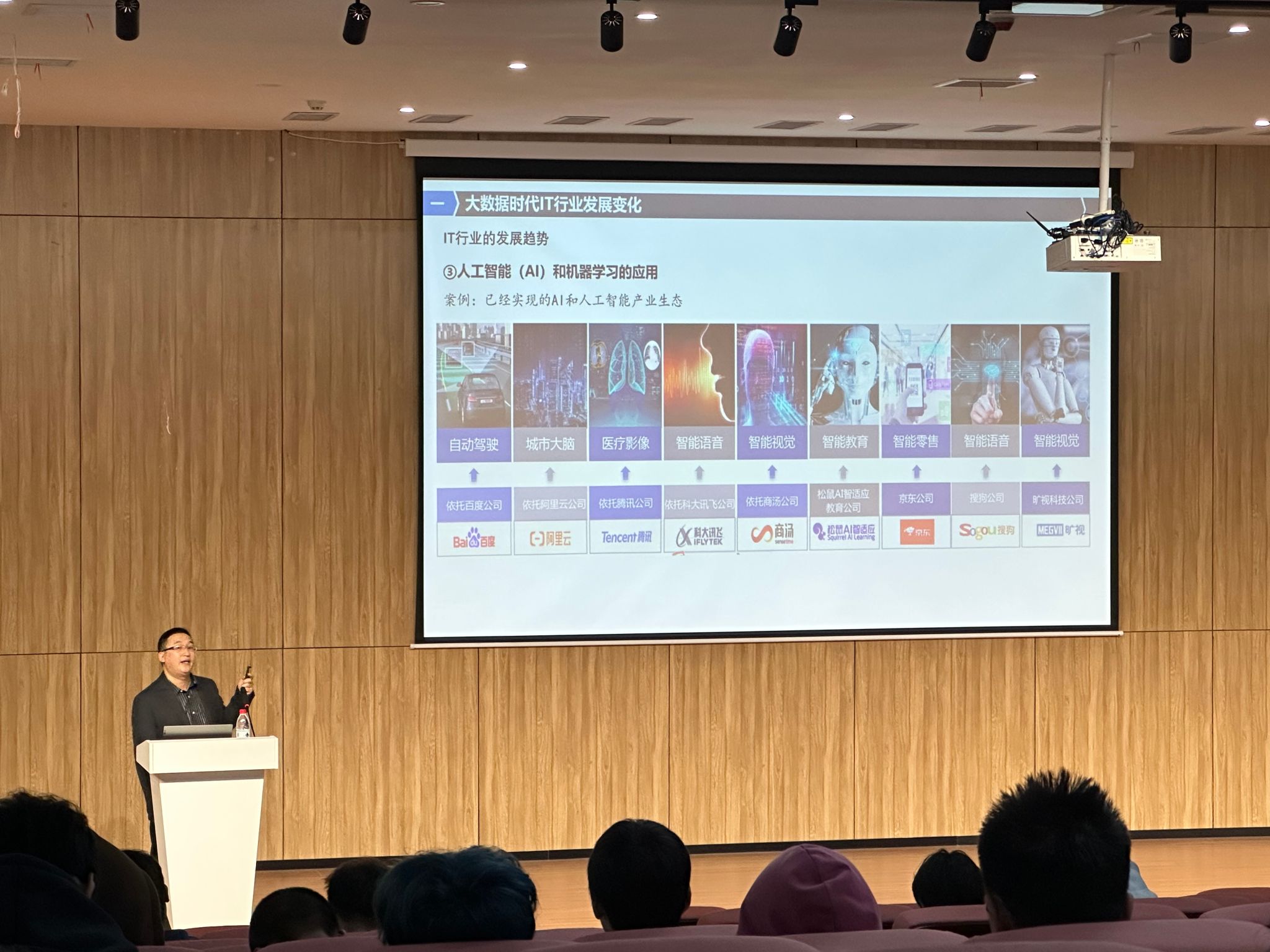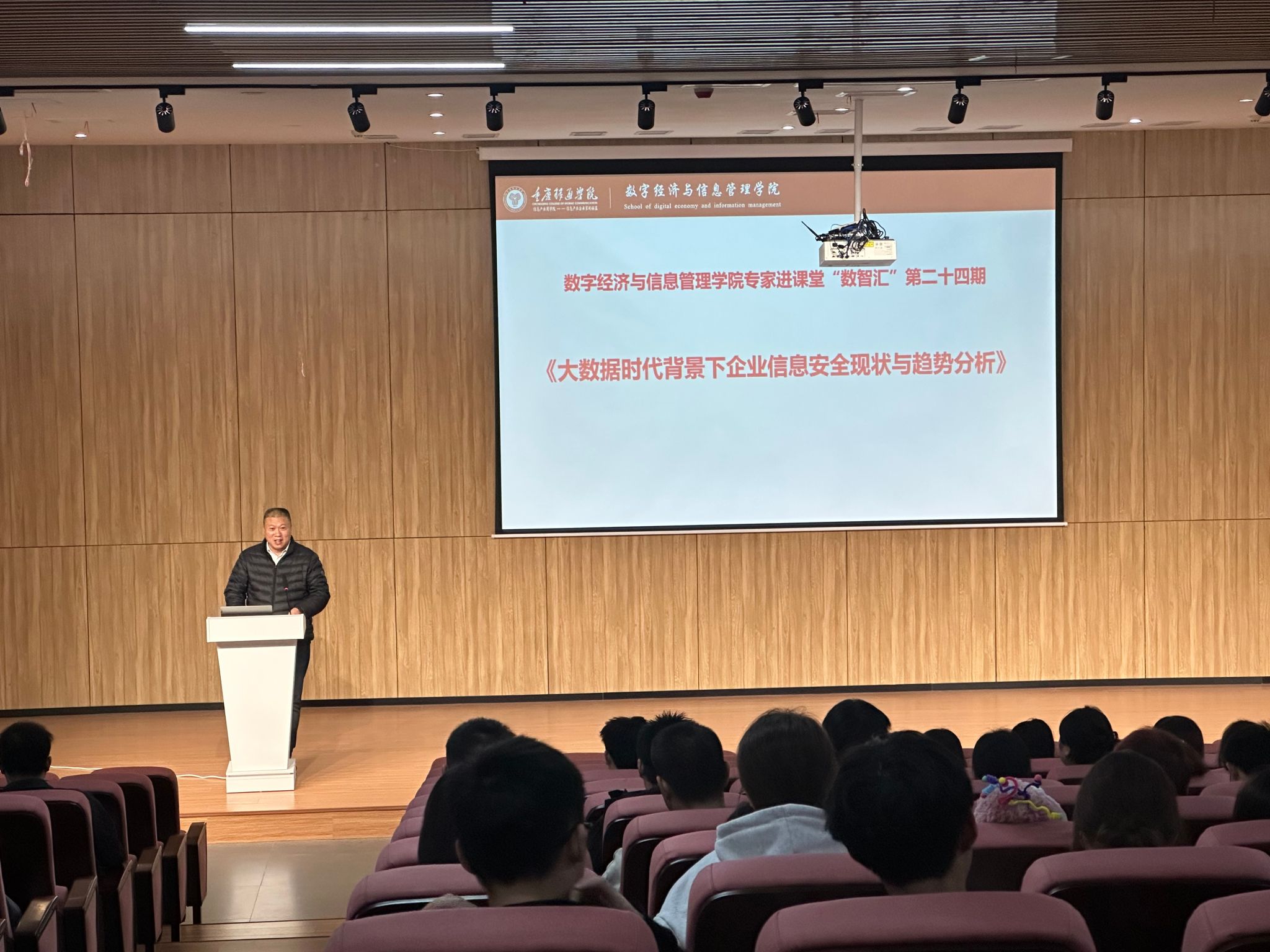 随着大数据、人工智能、云计算等技术的快速发展,不管是企业的商业模式还是人们的生活方式都出现了新的变化,大数据时代为我们带来了机遇的同时,也带来了信息安全方面的挑战。为了帮助同学们更好的了解企业信息安全的现状与发展趋势以及企业对IT人才的需求情况,11月15日下午,在贤者楼131多功能报告厅,举办了以“大数据时代背景下企业信息安全现状与趋势分析”为主题的企业专家进校园专题讲座。本次会议由潘显兵院长主持,特邀上海超硅半导体网络安全部负责人,顾兴钊老师作为主讲嘉宾,为我院学子在职业发展的道路上聚新赋能。参与本次会议的主要有信息管理教研室专任教师代表、学院学生代表。