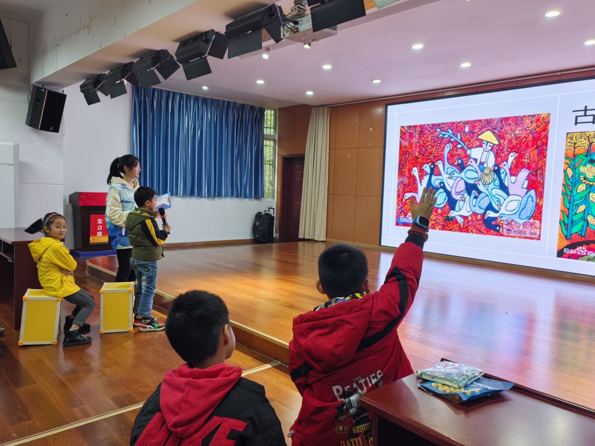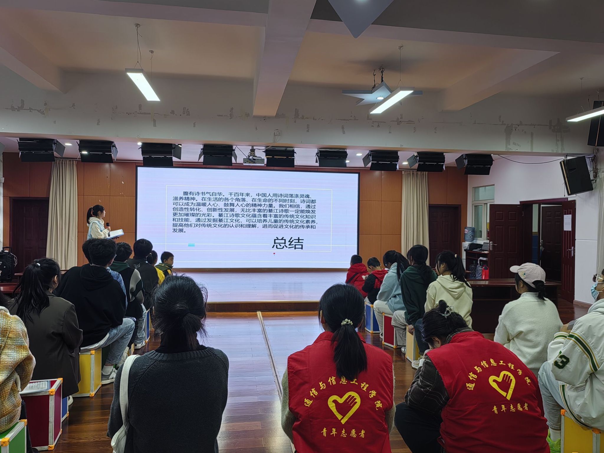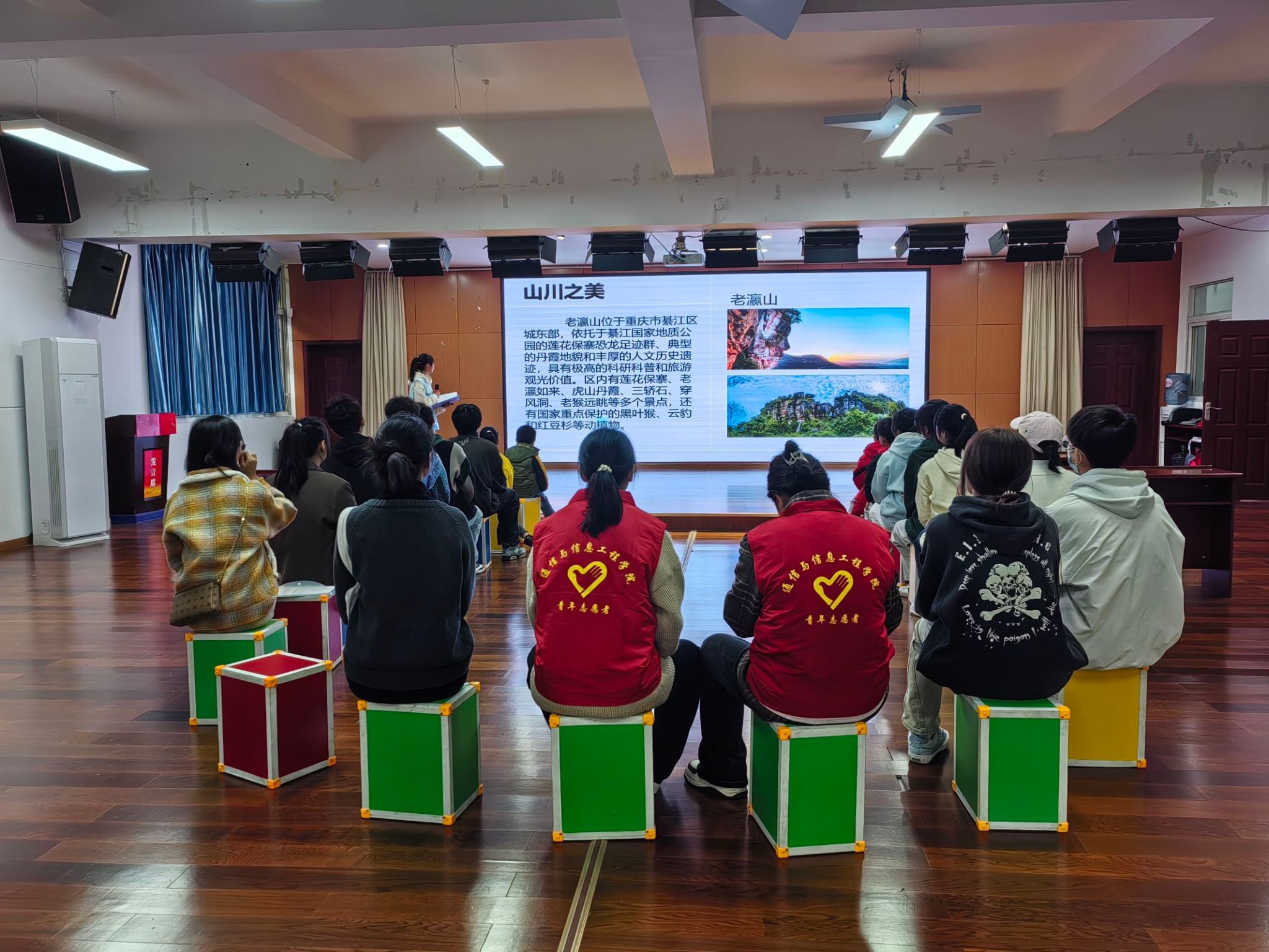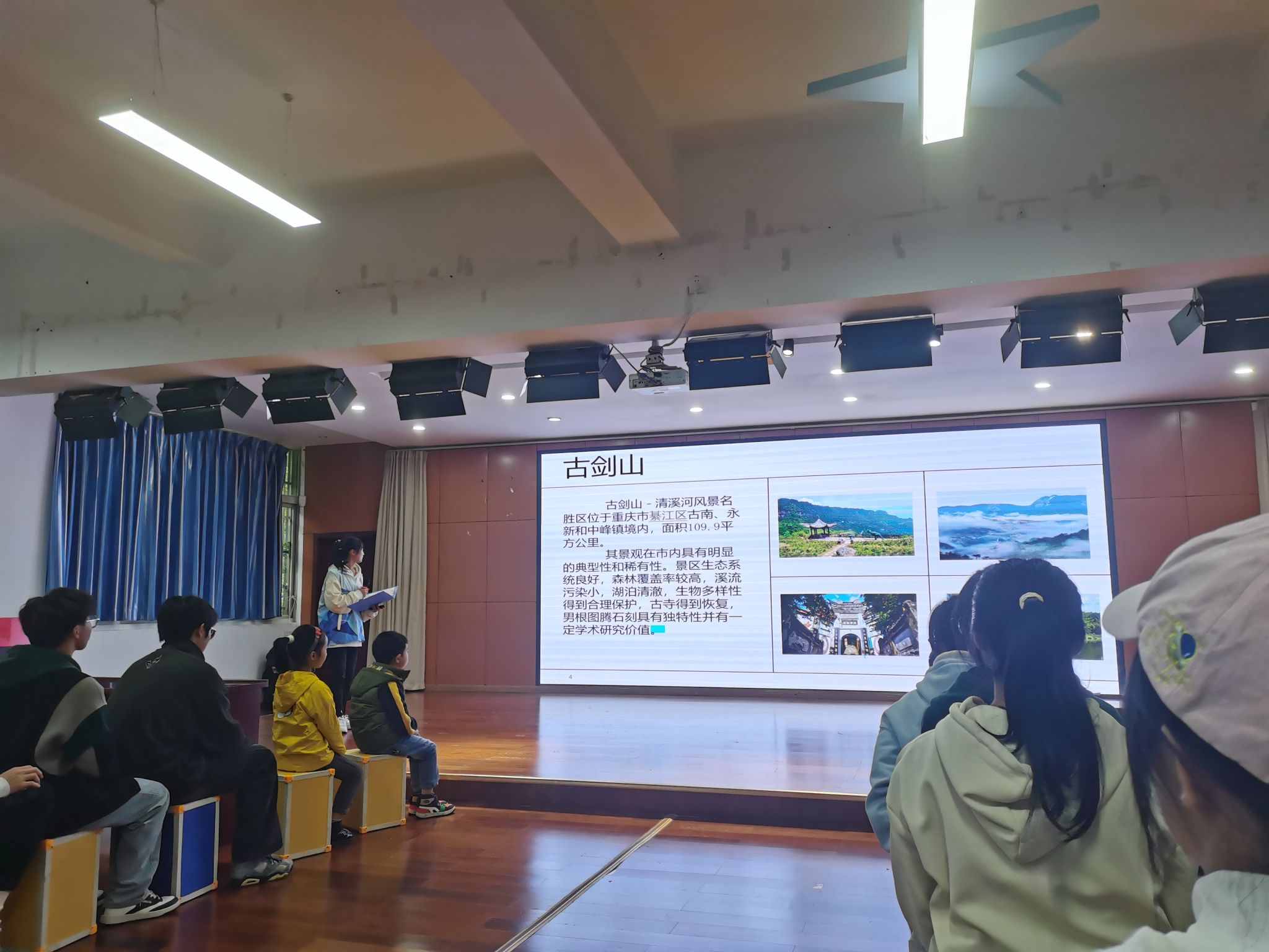活动伊始,由志愿者们介绍此次主题活动目的及意义,并由支队队员刘向容同学作为活动主持人来为孩子们普及綦江文化,感受綦江之美。刘向容同学为孩子们介绍綦城之美,其美有三,其一、山川之美——老灜山、古剑山;其二、古镇、古画、古乐之美;其三、古韵之美——诗歌。在主持人的带领下,孩子们领略了綦城的美,体验了綦城的文化。