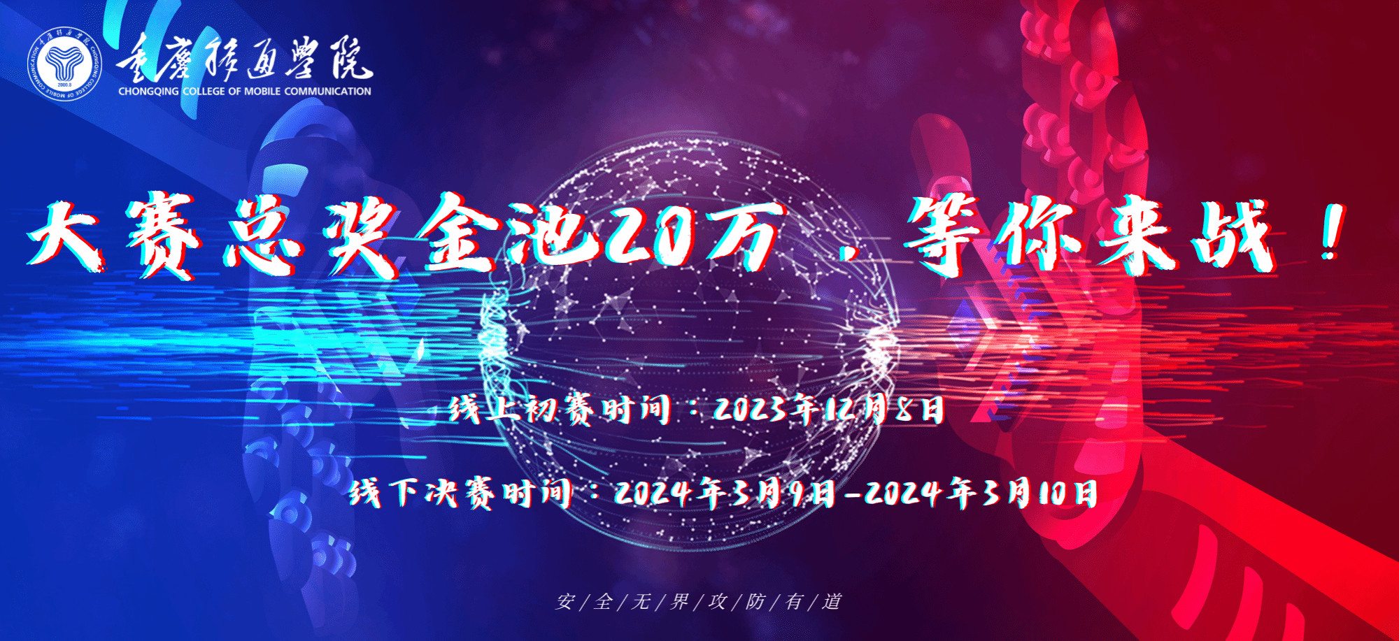 本次大赛在重庆移通学院綦江校区举行,分为初赛和决赛两个阶段,初赛通过线上CTF夺旗赛的形式进行选拔,排名前20支队伍入围决赛(同一单位最多入选2支队伍)。决赛将采用线下AWD攻防对抗赛的形式进行比拼,设一等奖 (1支队伍)、二等奖(2支队伍) 、三等奖(4支队伍),优秀奖(13支队伍)。