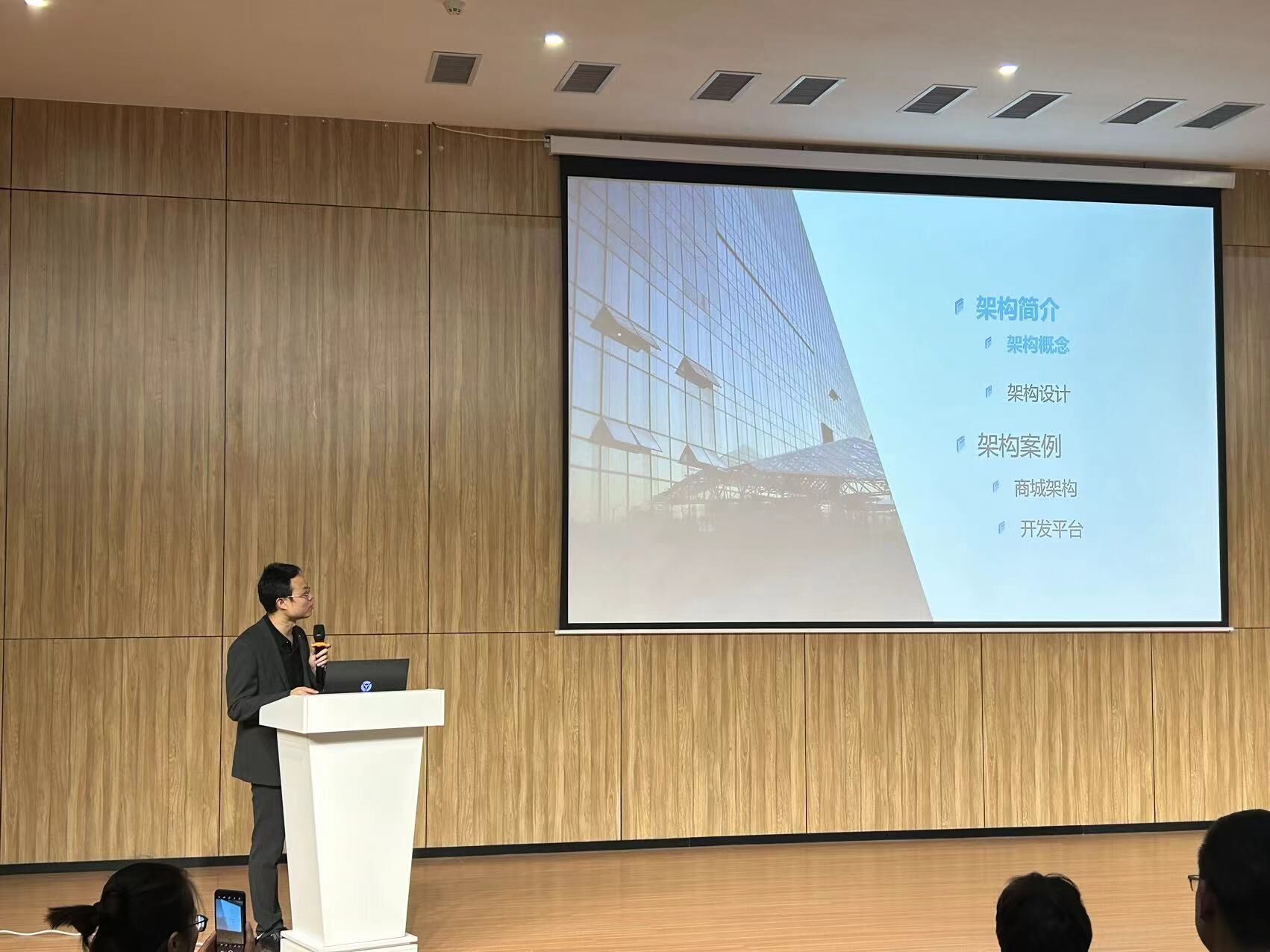 讲座上,何国勇先生结合自己的实际工作经验,分享了在实际项目中遇到的挑战以及解决方案。他从架构简介与架构案例两大板块出发,为同学们讲解了软件工程的基本概念、软件开发过程、架构设计的重要性以及实际案例分析等。