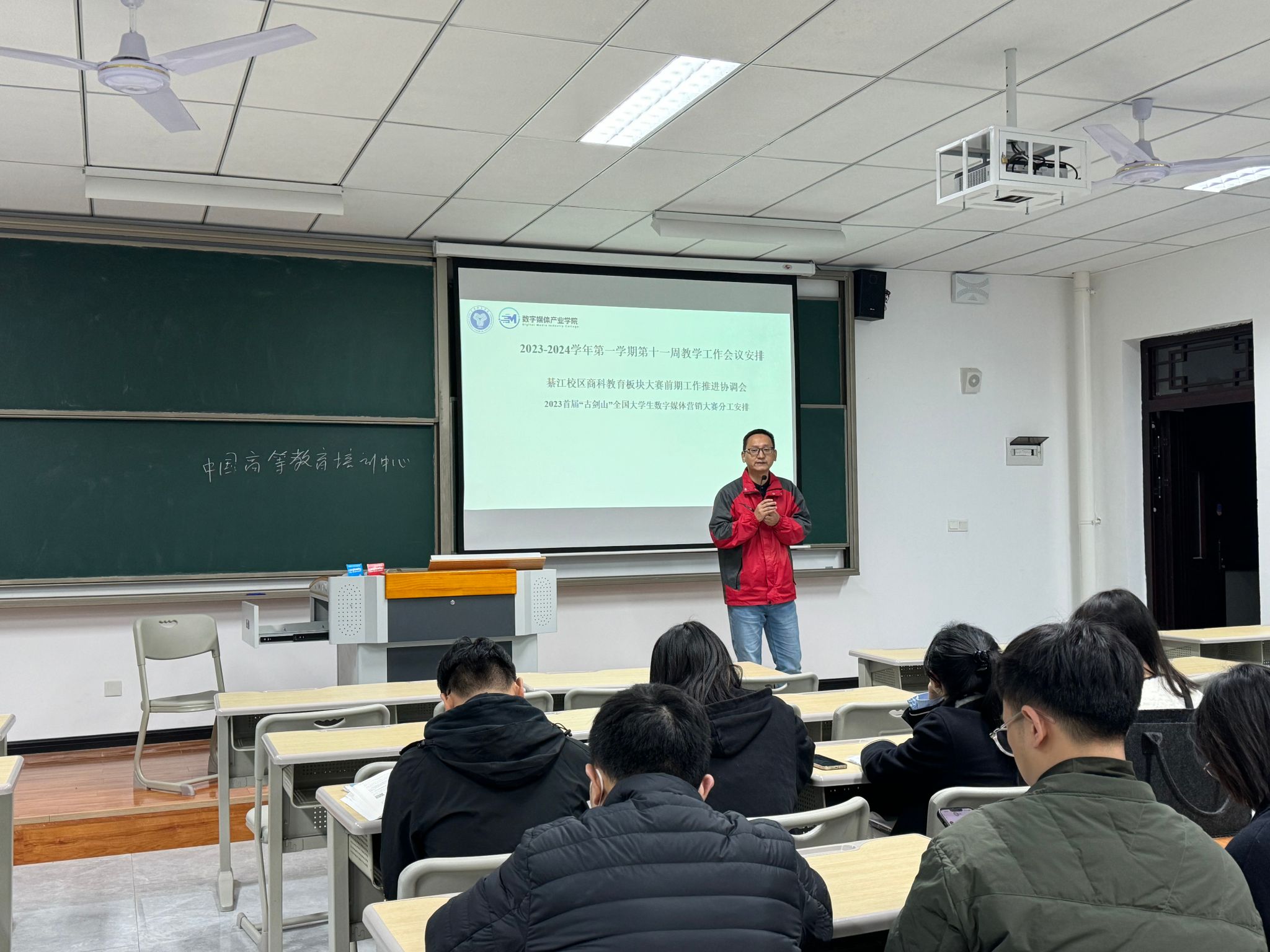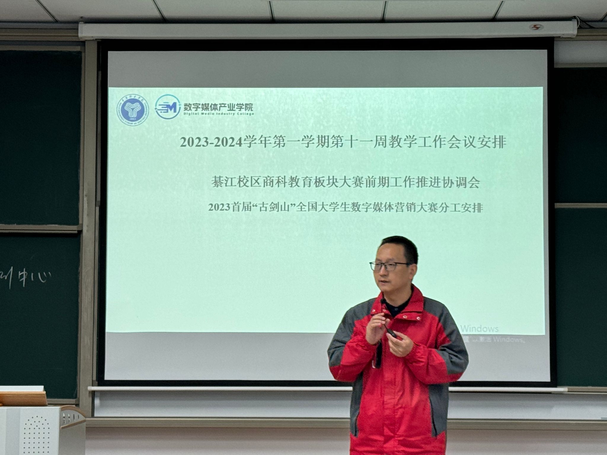 第二项议程由淬炼商学院副院长范保珠主持。范保珠院长重点提到的是即将在綦江校区举行的新商科教育板块大赛的前期工作推荐协调,这是一次筹划已久的协调会议,旨在确保赛事的顺利进行。范保珠院长也鼓励了新商科教学部各位老师积极支援2023年首届“古剑山”全国大学生数字媒体营销大赛工作。2023年首届“古剑山”全国大学生数字媒体营销大赛是数字媒体产业学院举办的为提升大学生数字媒体营销专业技能水平,激发大学生创造性思维,培养大学生在数字媒体时代下的团队合作、组织与管理能力,从而实现数字媒体领域的实战型经营管理人才的培养目标。本次大赛面向全国在校大学生,旨在为大学生提供高水平、高规格的学习交流平台。