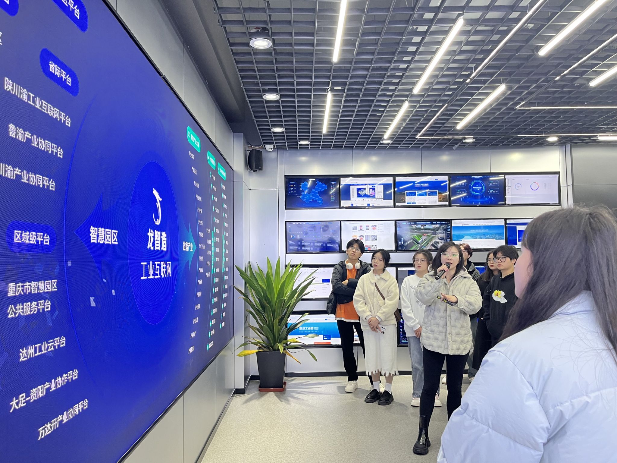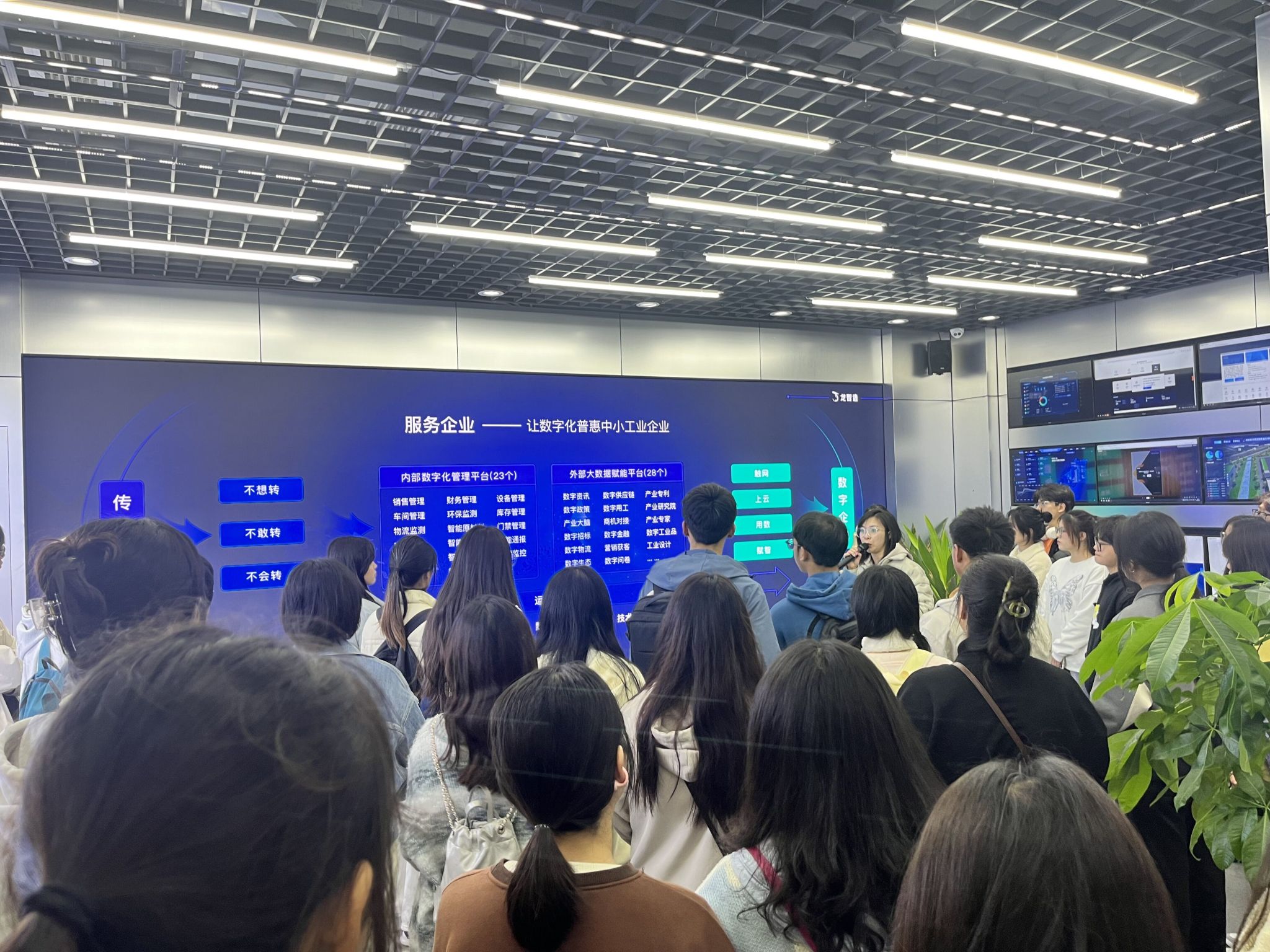 在企业指导老师的讲解和指引下,学生们也了解到重庆龙智造科技有限公司发展的八年历程。2015年探索“互联网+工业”融合模式,开启产业赋能与企业服务之路,建成全国最早一批工业互联网平台;2018年,迎来重庆市“智慧园区”建设大潮,成为全市工业园区服务平台的开拓者与进取者;到2023年,龙智造紧跟工信部数字化转型方针利用深厚的企业数字化转型升级经验,为中小企业的数字化转型赋能。