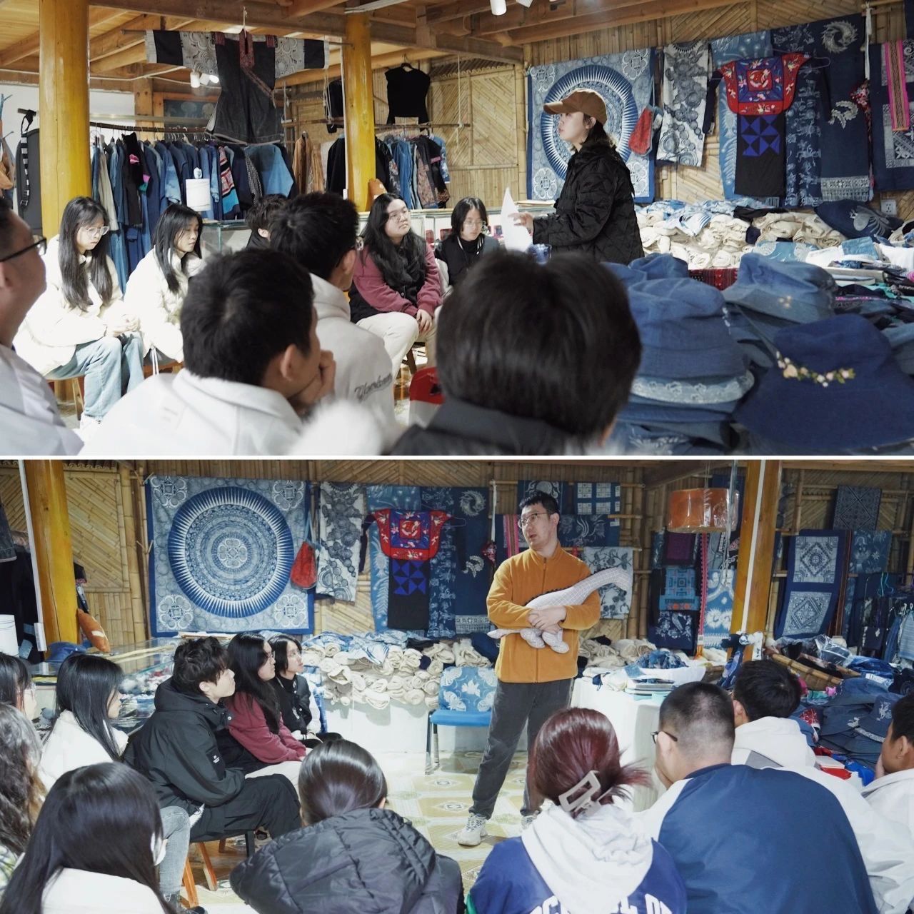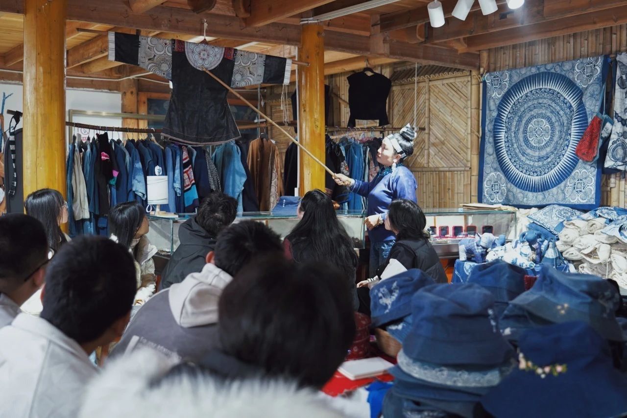 11月26日,我们特别邀请了非遗传承人张世秀老师结合当地的蜡染作品为同学们深入讲解苗族文化的起源、苗族服饰中的设计理念、以及蜡染图案中各种形象的象征意义,特别是在对一件传统且精美的苗族服装的分析中,张老师详细解释了蜡染图案中各种形象的文化背景和意义,让同学们对苗族蜡染文化有了更生动、系统的认识。