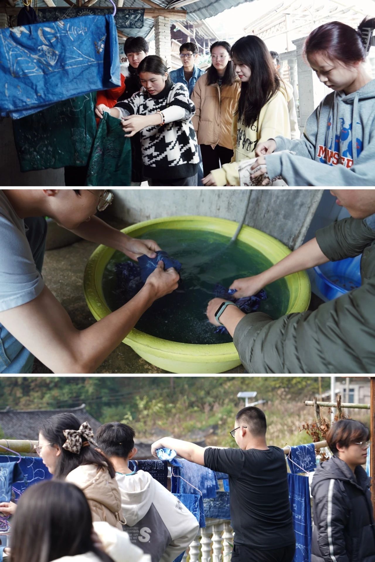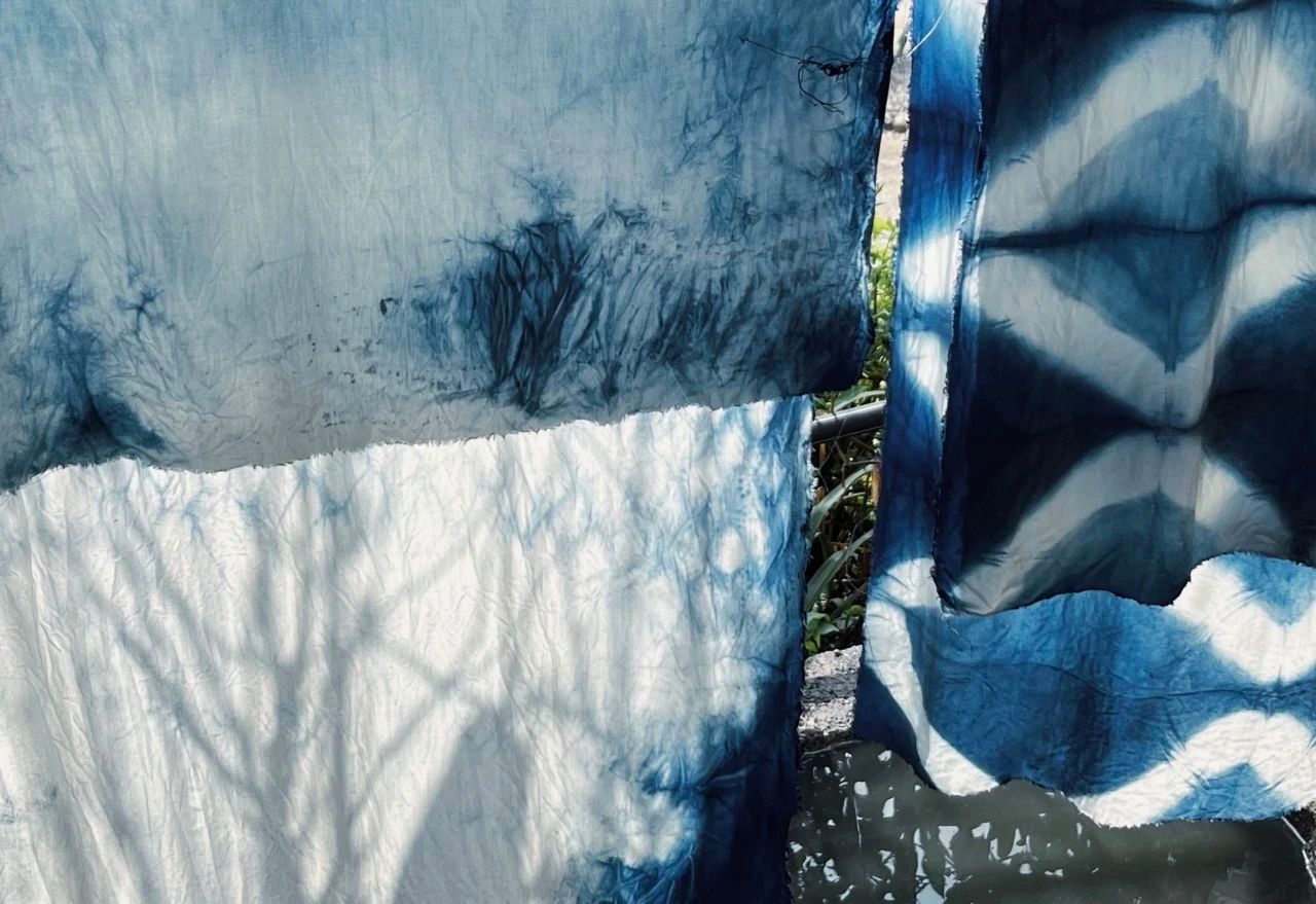 同日,在完成了一轮蜡染的学习和工艺之后,张世秀老师还为大家介绍了扎染的技巧和过程。这一充满随机性和可能性的手工艺方式让同学们了解到了扎染在材料创造上的无限潜力。由此,同学们就地取材,使用竹条、木棍、线绳等材料进行了扎染创作。在经历了详尽的染制过程之后,同学们也体验到了这种富有创造性和随机性的艺术形式所带来的丰富回馈。他们不仅学习了一项古老的手工艺技能,还在实际操作中发掘了自己的创造潜力。