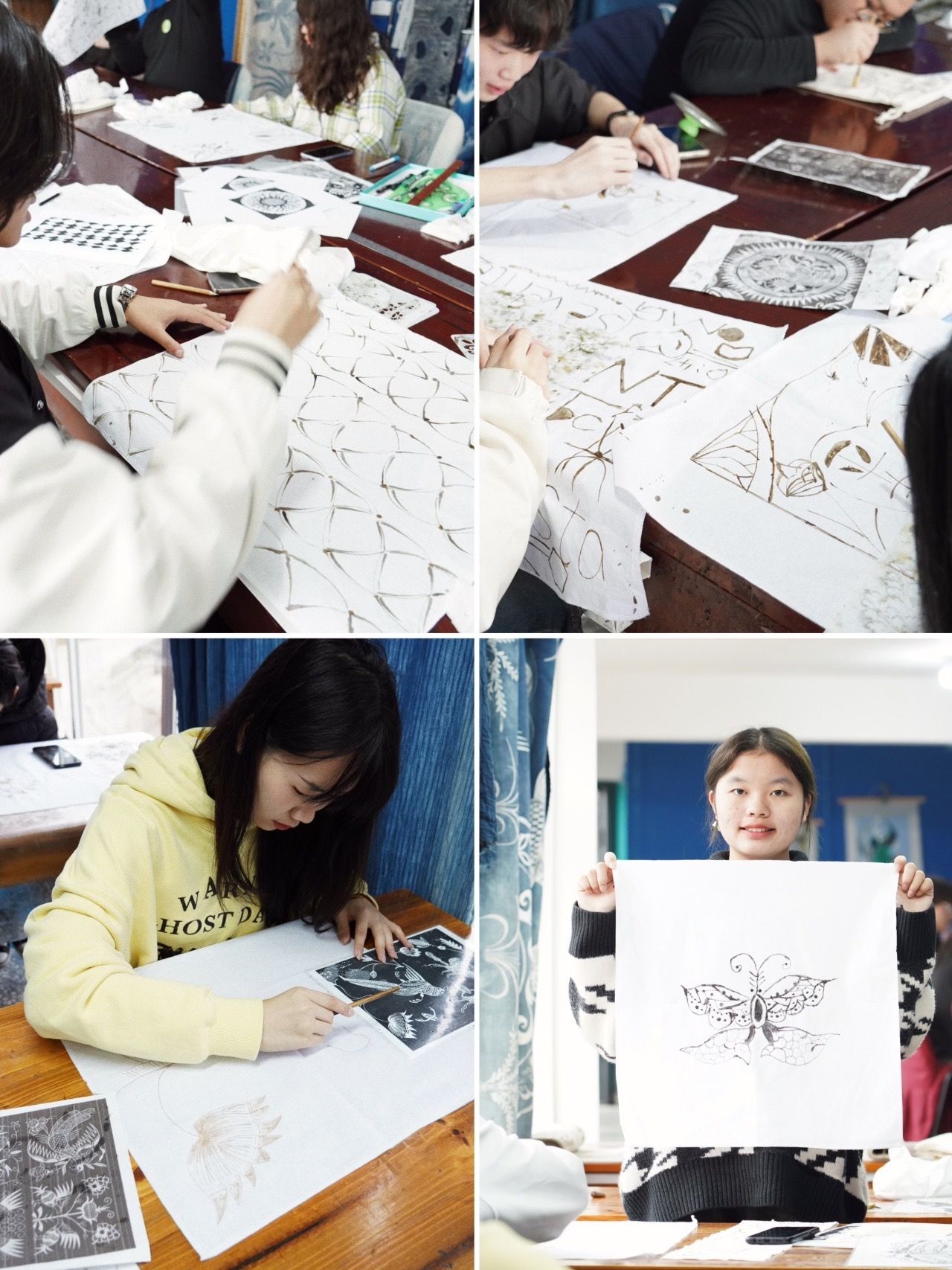 创造与表达环节中,王琎老师总结了前一天的蜡染工作,并要求同学们结合所学的苗族文化和《科幻与想象力》课程的感悟,再次通过熟悉的蜡染工艺表达对本地苗族文化符号的理解。在接下来的时间里,同学们将自己的想象力融入当地的苗族图案中,创作出了各种独特的作品,从田间劳作的人物形象到宇宙探索的幻想,丰富多彩。