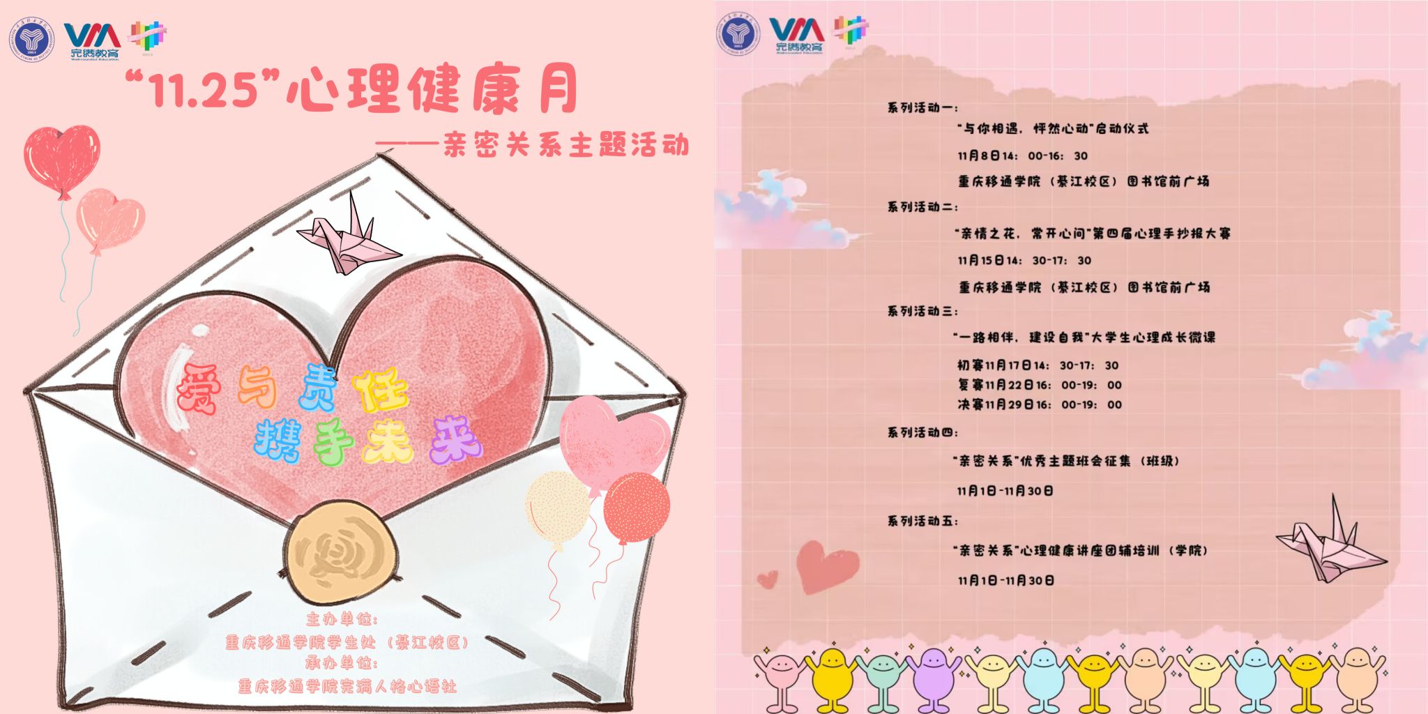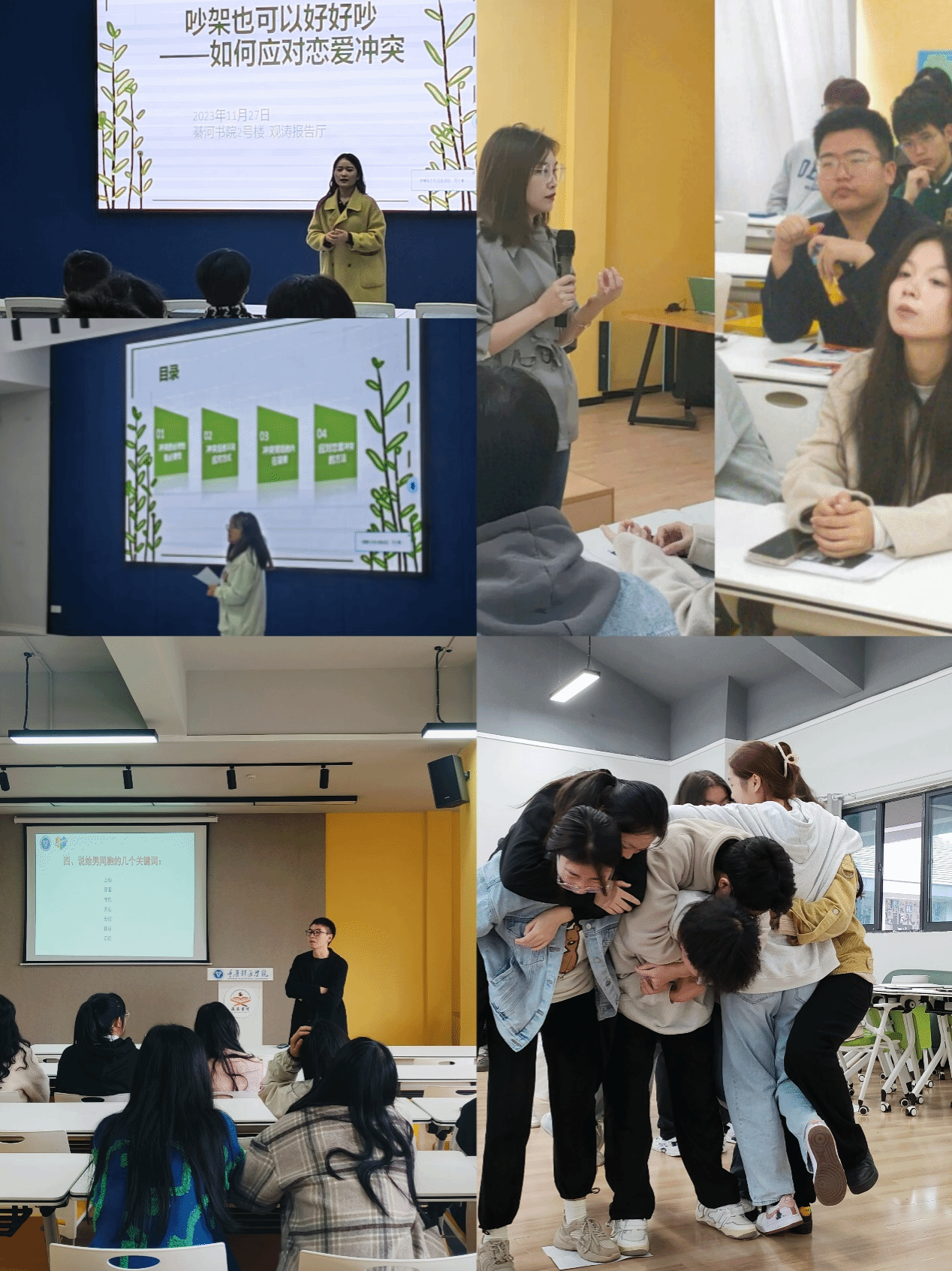 为进一步提高我校学生的心理健康水平,增强其心理保健意识,重庆移通学院綦江校区学生处主办“11.25”心理健康教育月系列活动,以“亲密关系”为主题,围绕“爱情、亲情、友情”开展实践活动、讲座团辅、谈心谈话等内容,宣传和普及心理健康知识,促进个体完满人格的发展。