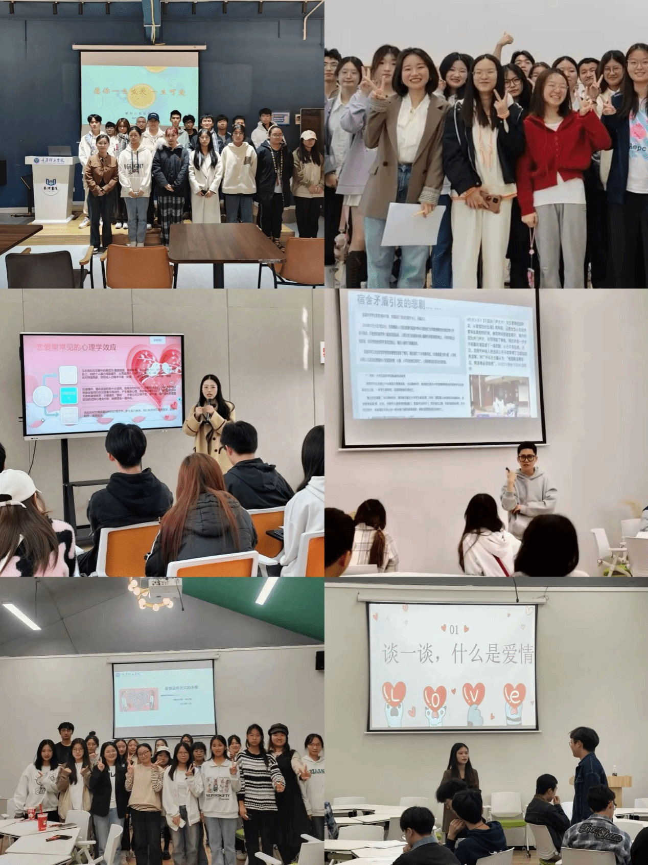 在“11.25”心理健康月活动期间由学生处心理健康教育与咨询中心对接各二级学院开展以“亲密关系”为主题的13场心理健康讲座。专兼职心理教师在系列讲座中以互动问答、团辅体验、案例分析、知识讲授等方式分别对爱情、亲情、友情进行了多方面讲述,对维度激发个体积极的情感体验。例如兼职心理教师阙小梅老师在“爱情这件天大的小事”讲座中以“90”后和“00”后喜欢的偶像剧为引,为同学们剖析正确的“恋爱观”;兼职心理教师温朝一老师在“寓”见美好,一见钟“寝”讲座中用“理想中的宿舍”问答,讲述了同学们该如何维护好和谐的寝室环境;兼职心理教师邓艳老师在“解忧读书会”中用董卿的例子让同学们明白了一个和谐、宽容并且相互信任和支持的家庭氛围的重要性。系列讲座充分体现了学校对学生心理健康的重视,通过寓教于乐的方式,宣传和普及心理健康知识,促进学生自我成长与发展。