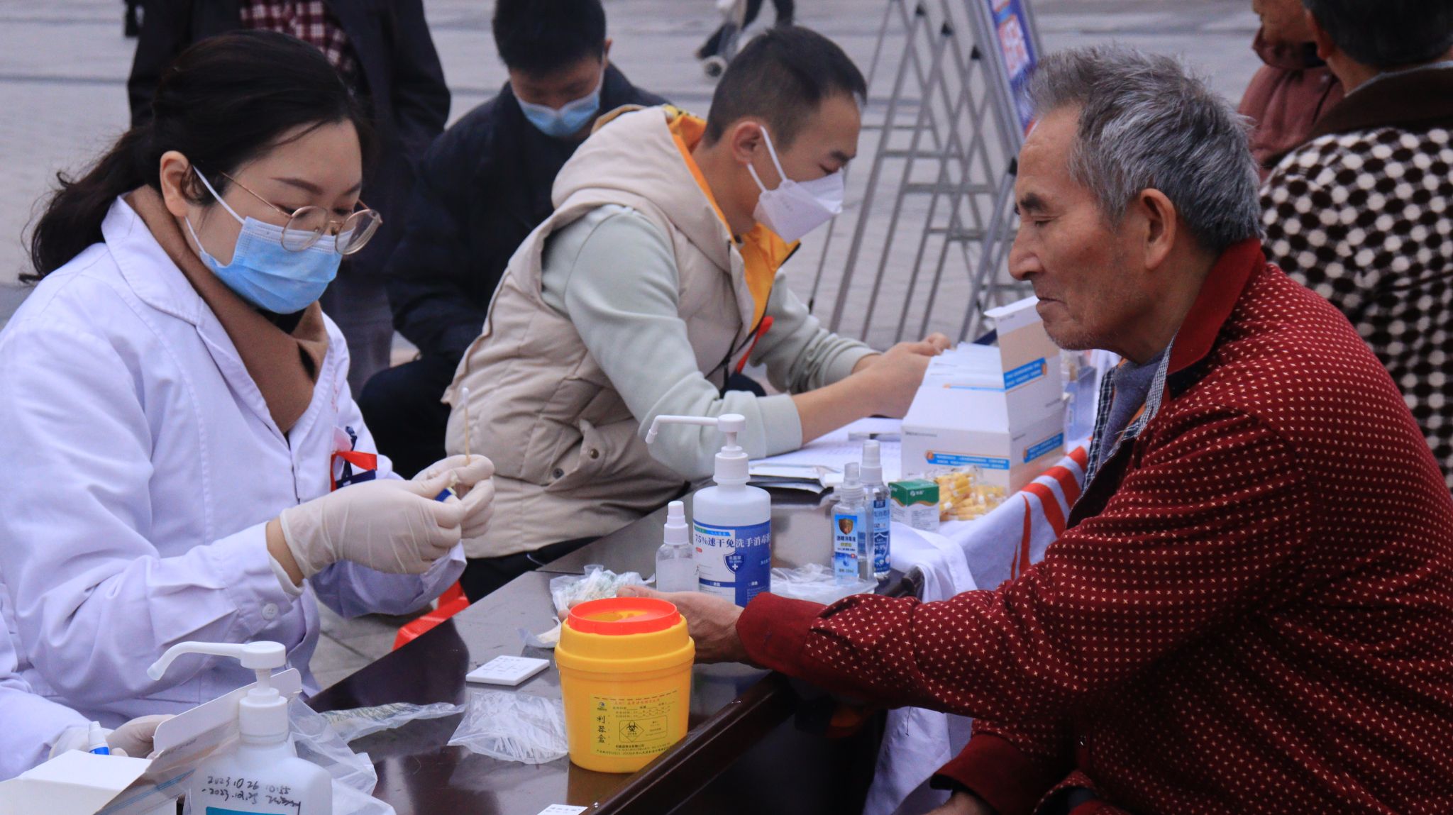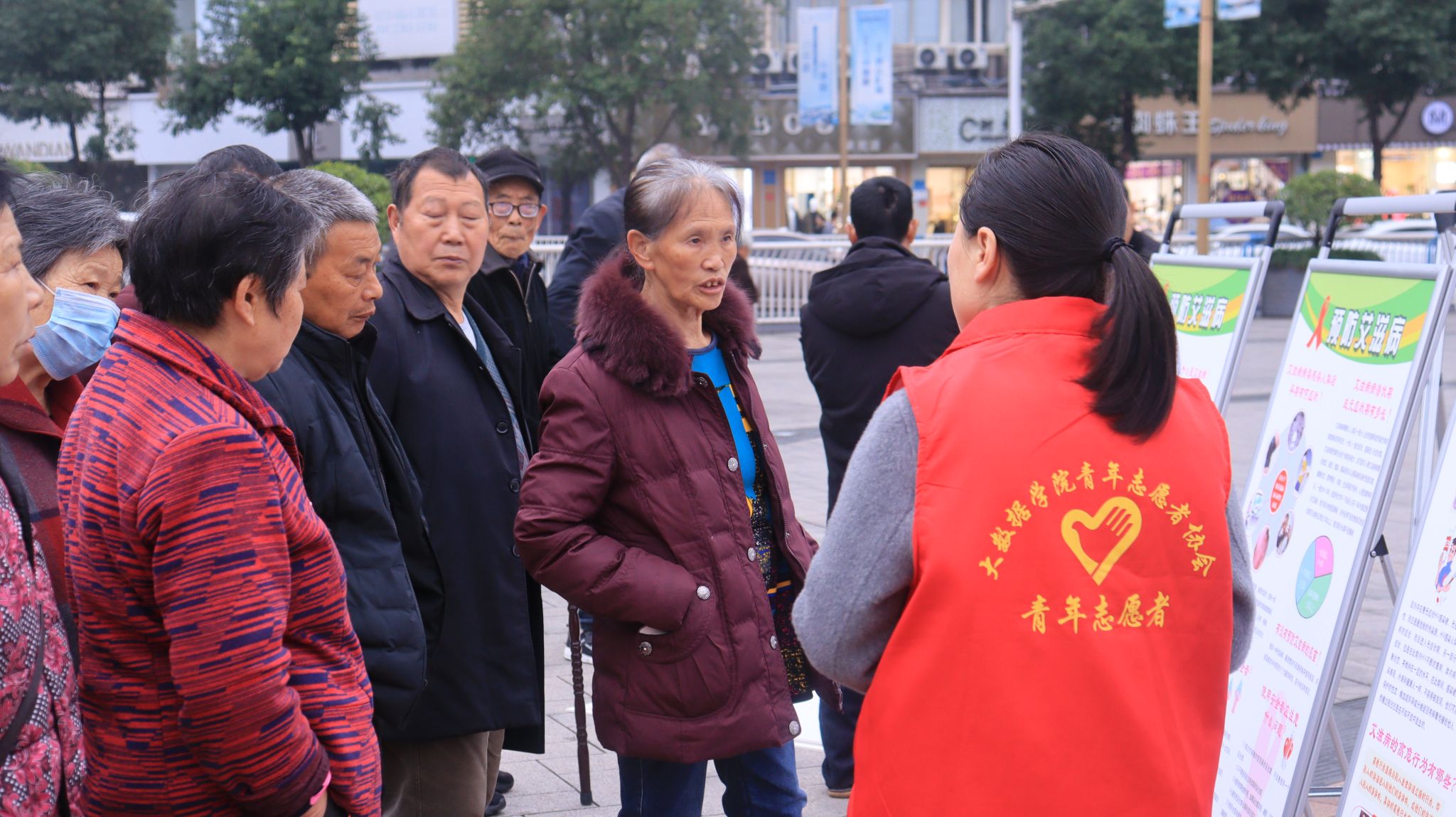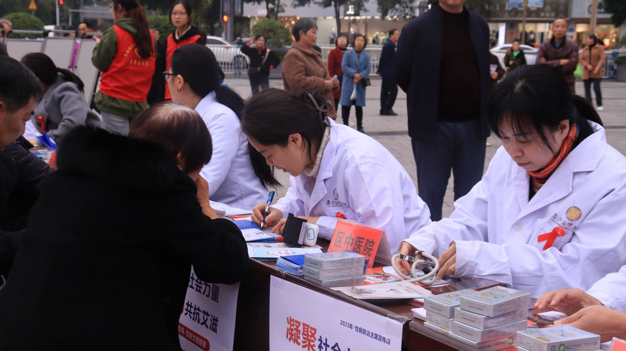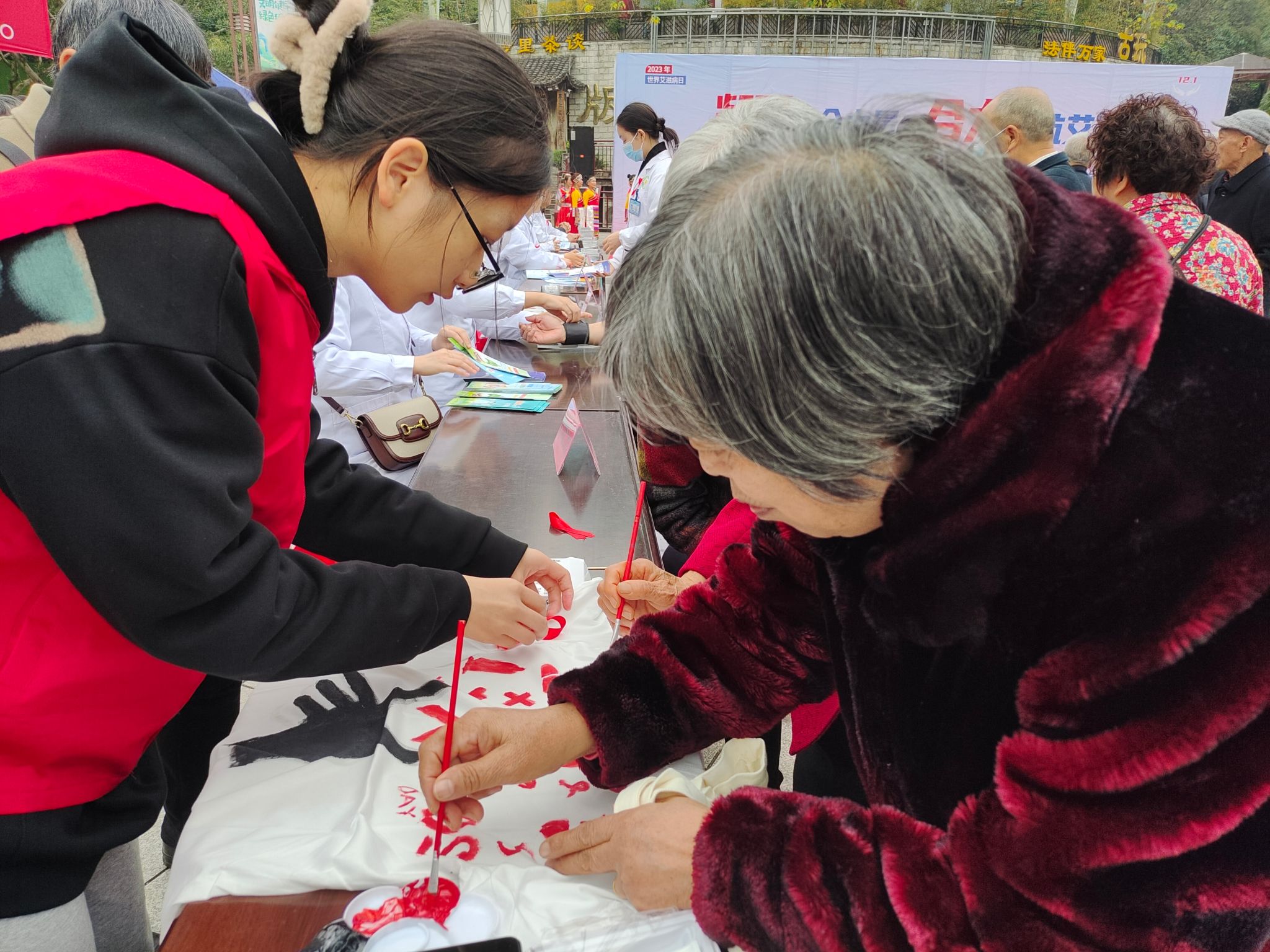 聚焦活动现场,志愿者们主动为老人提供帮助,为老人讲解艾滋病防治相关知识,为老人的健康出一份力;带领老人作画,为艾滋病患者送去一点温暖与关爱。更有綦江区中医院参与其中,他们为老人测血压,关注老人健康,共同构建健康无“艾”社会。