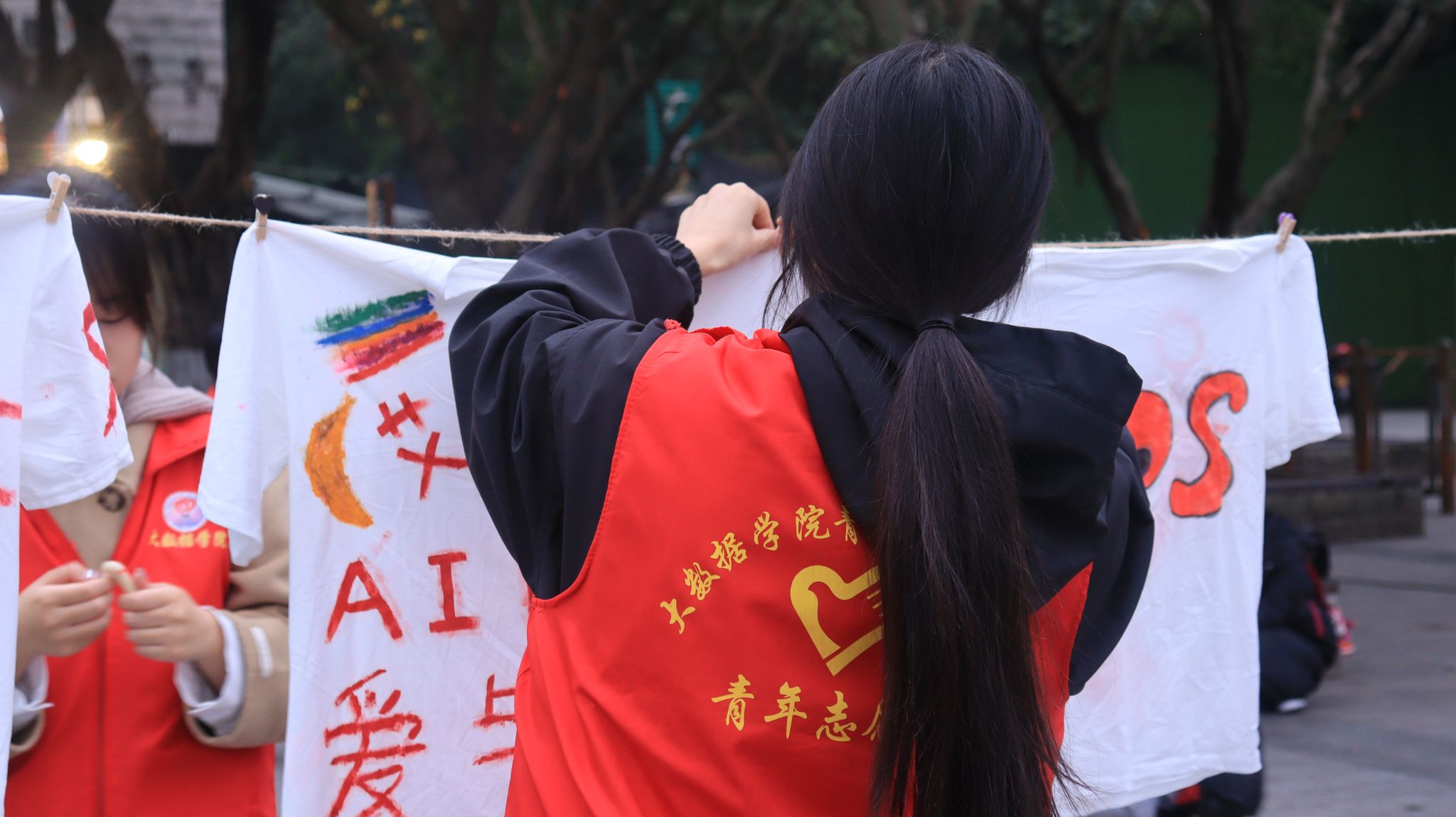怀揣着一颗对防艾事业赤诚的心,志愿者们早早地在校门口集合,个个神采飞扬,对此次活动充满了期待。经历一个小时的车程,志愿者们终于来到了目的地版画广场。志愿者们各司其职,为活动现场做最后准备。一件件展开的文化衫、一张张排列整齐的画报是创作者对艾滋病患者最真挚的关爱,也是对艾滋病防治知识最好的宣传与讲解,用最简单的图画和最朴素的文字将艾滋病防治知识直观地展示给每一位参观的观众,进一步让广大群众了解和认识到艾滋病的危害以及防范的重要性。