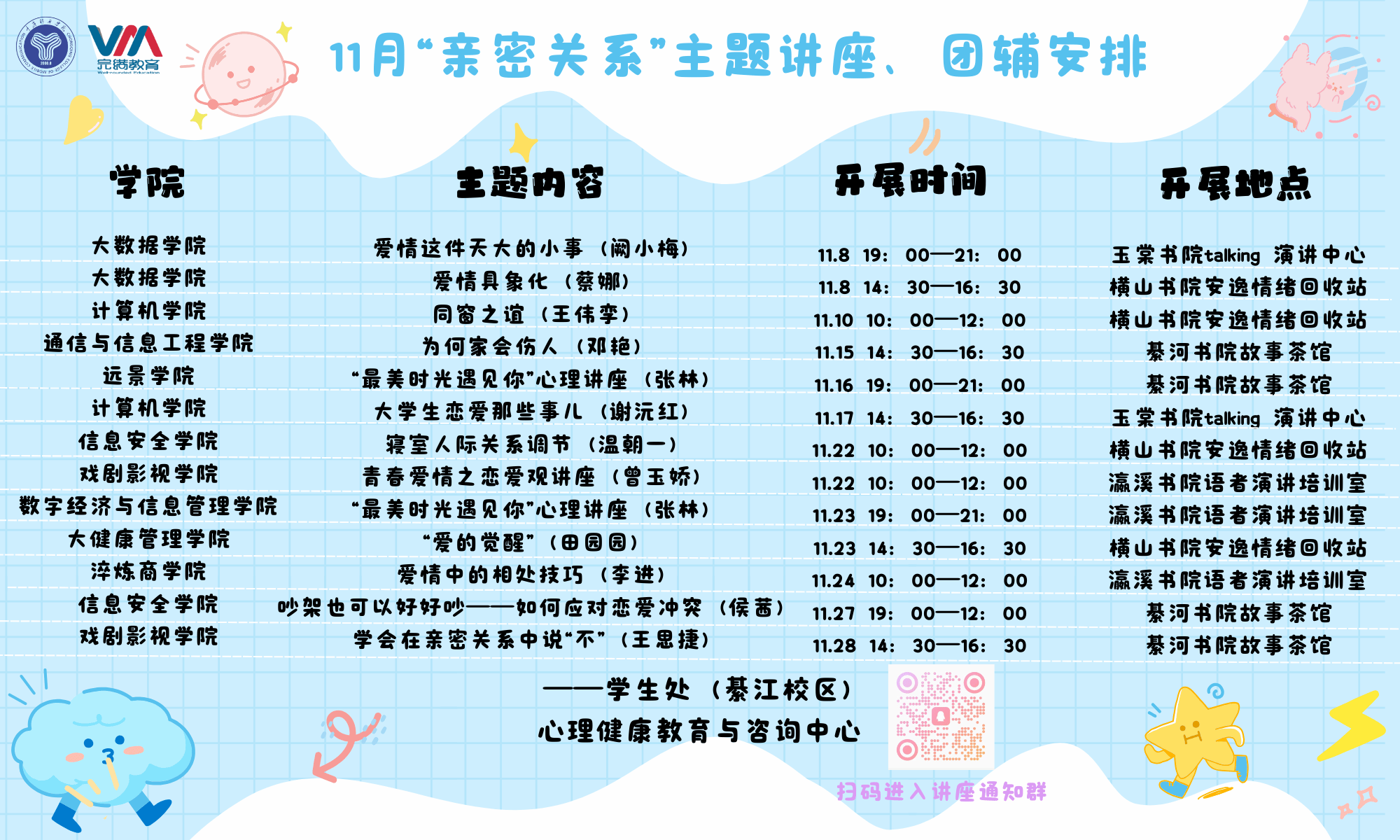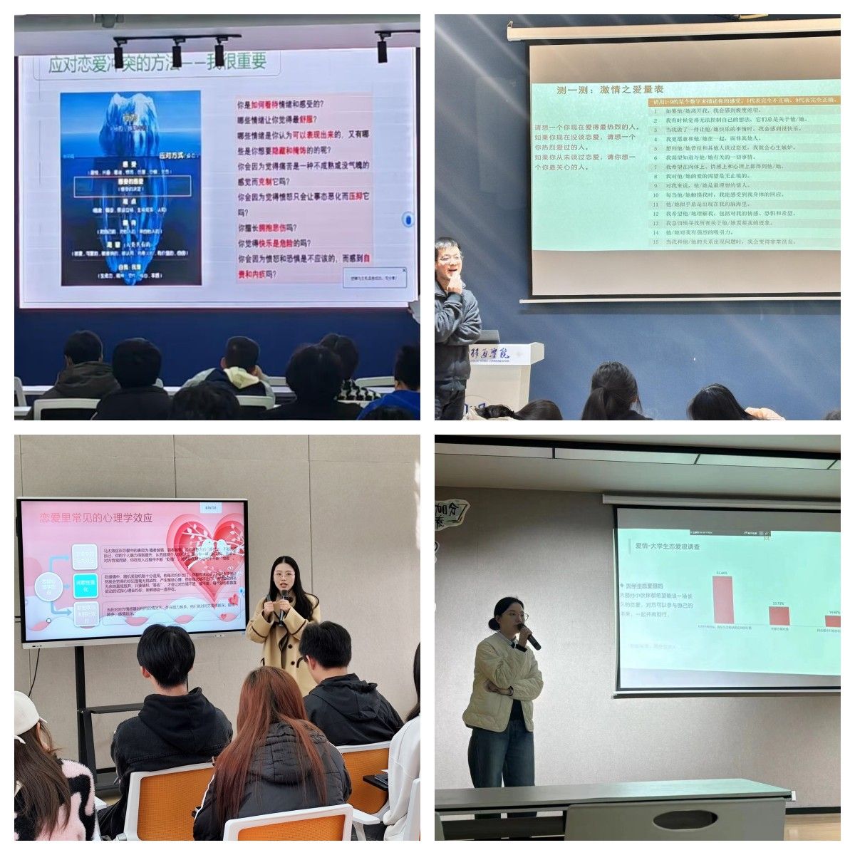 为了提升大学生的人际交往和社会适应能力、提高大学生对亲密关系的正确理解,以及促进他们在情感、心理和生活方面的成长与发展,感受到责任和幸福的滋味。学生处心理健康教育与咨询中心于11月3日至11月30日期间,对接各个二级学院,举办了13场主题为“亲密关系”的心理健康讲座,以亲情、爱情和友情为核心内容,引导同学们深刻认识到亲密关系的重要性,并帮助他们解决在人际关系中遇到的各种问题。