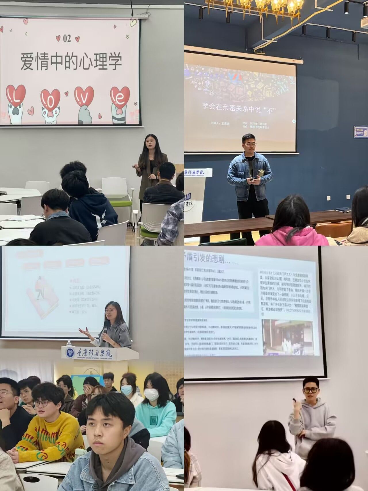 好的亲密关系是人生的充电桩,但获得它却困难重重,有时甚至会带来难以愈合的创伤。因此,老师们通过具体的例子和实践经验,生动而具体地讲述了在亲密关系中保持独立和自尊的重要性,并教授了有效沟通、解决冲突和建立信任的技巧。听完讲座,同学们都收获颇丰,计算机学院学生刘佰山表示:老师的讲解让人对亲密关系有了新的认识,也更有信心处理好亲密关系中的矛盾和冲突;通信与信息工程学院学生陈思润表示:会将所学到的方法运用到之后的人际交往中,改善和朋友、亲人之间的沟通方式。