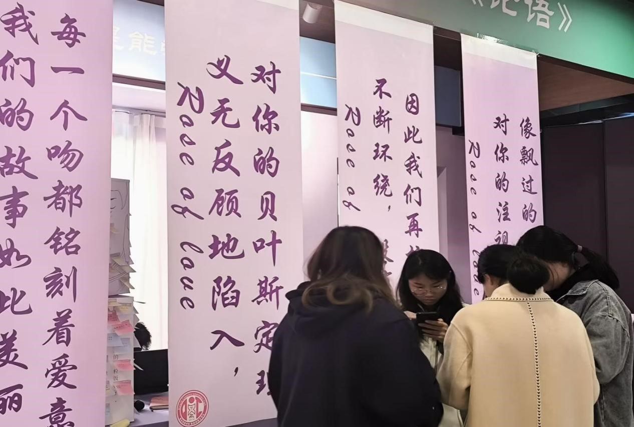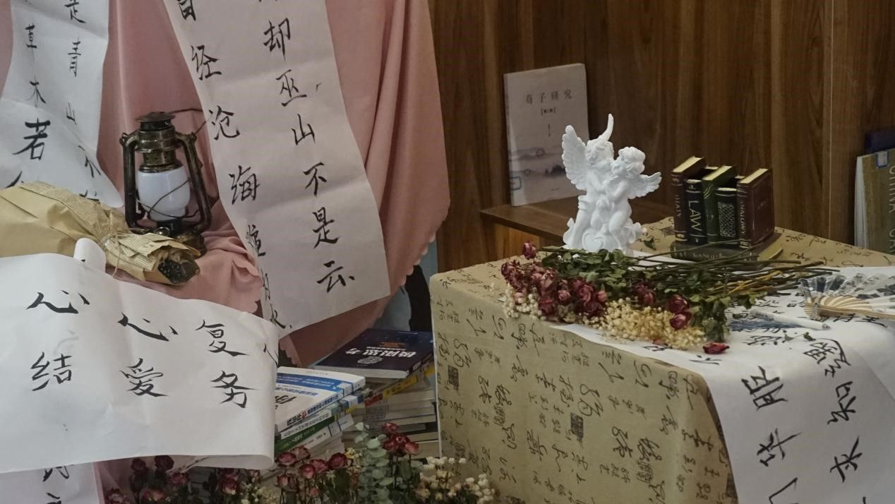 活动开始前,社团工作人员精心布置观影场地。书吧周边不仅挂有摘录自同学们情书内容的竖条横幅,内部还有集精美干花、复古装饰物、手写情诗摘录于一体的精美展示台,为同学们营造了一个优美的观影环境和浪漫的文学交流环境,致力打造沉浸式体验。
