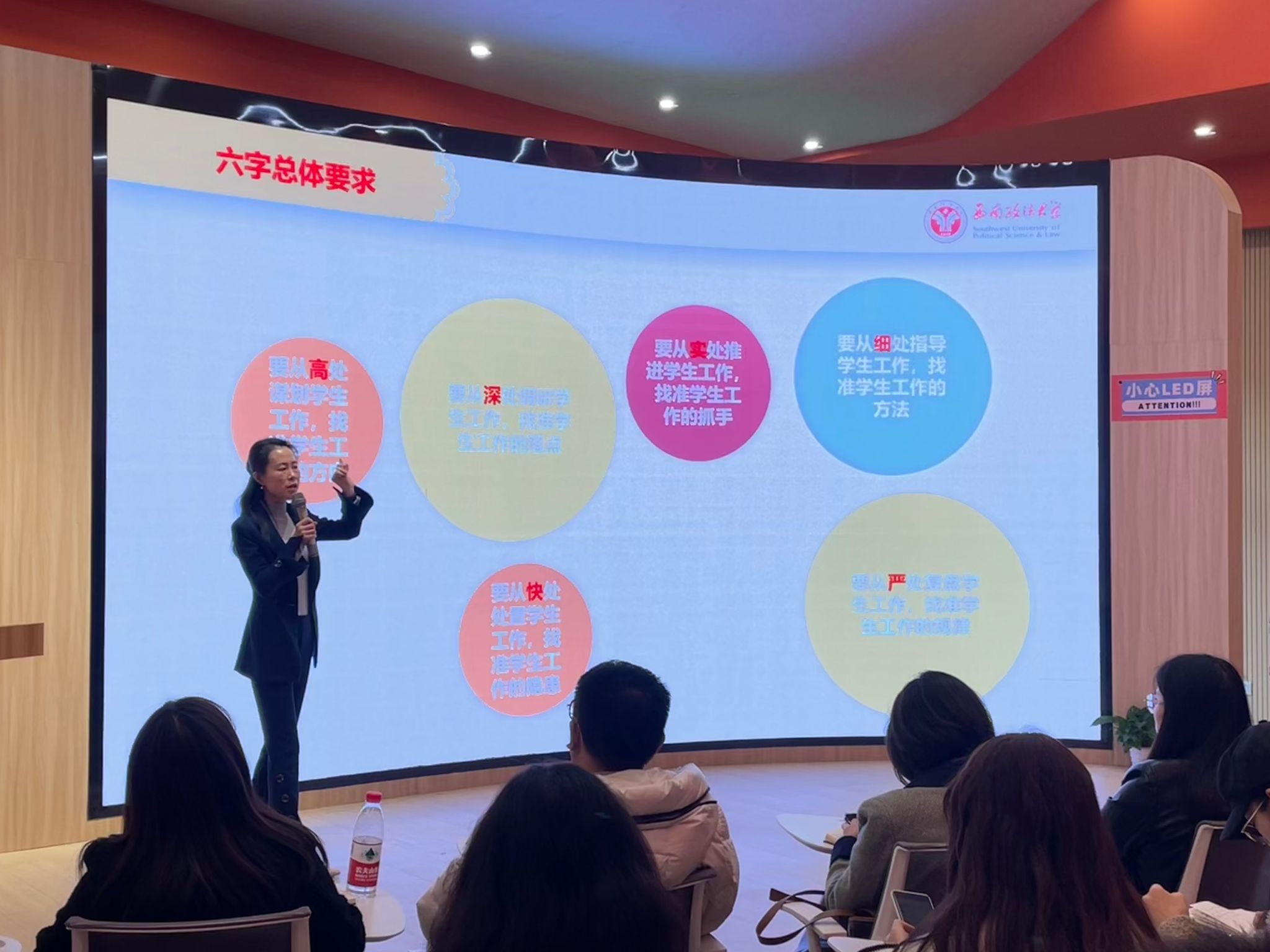 青年辅导员是高校辅导员队伍中的一支重要力量,他们是学生思想政治教育工作的骨干,承担着学生日常思想政治教育和管理工作的组织、实施和指导。为进一步提升青年辅导员的职业素养和工作能力,加强辅导员队伍建设。12月7日,由綦江校区学生处主办,“海燕·领航”辅导员工作室承办的第24期登瀛论坛“高校青年辅导员应持续用心用情用力做好学生工作”于古剑书院·含光报告厅举行,本次登瀛论坛由西南政法大学继续教育学院党委书记肖丽霞主讲,各学院辅导员参加,大数据学院学工副院长阙小梅主持。