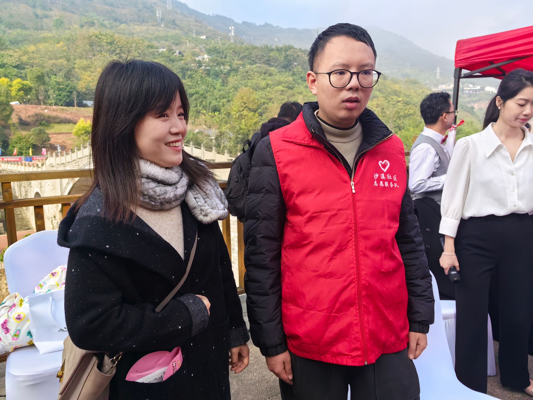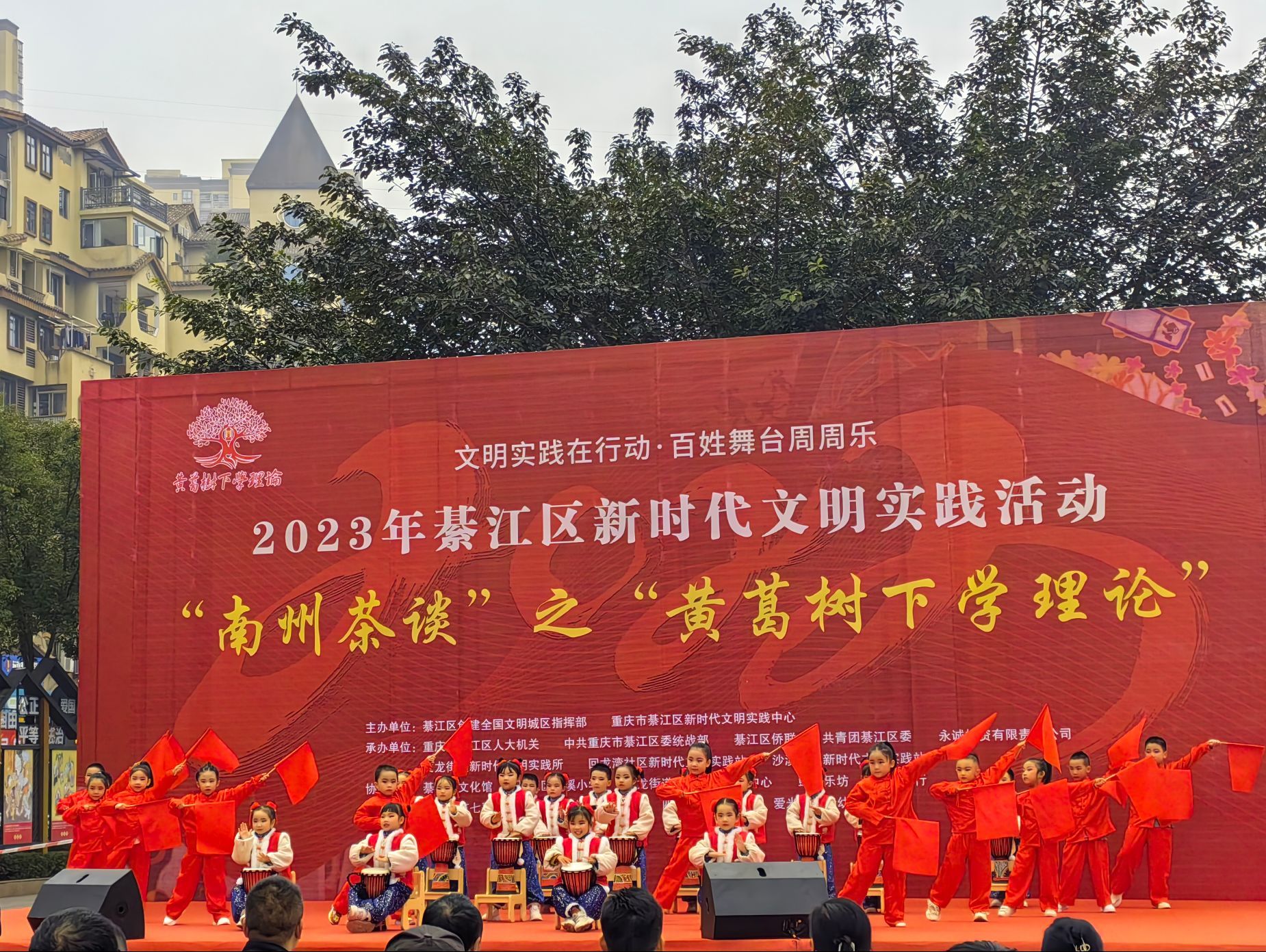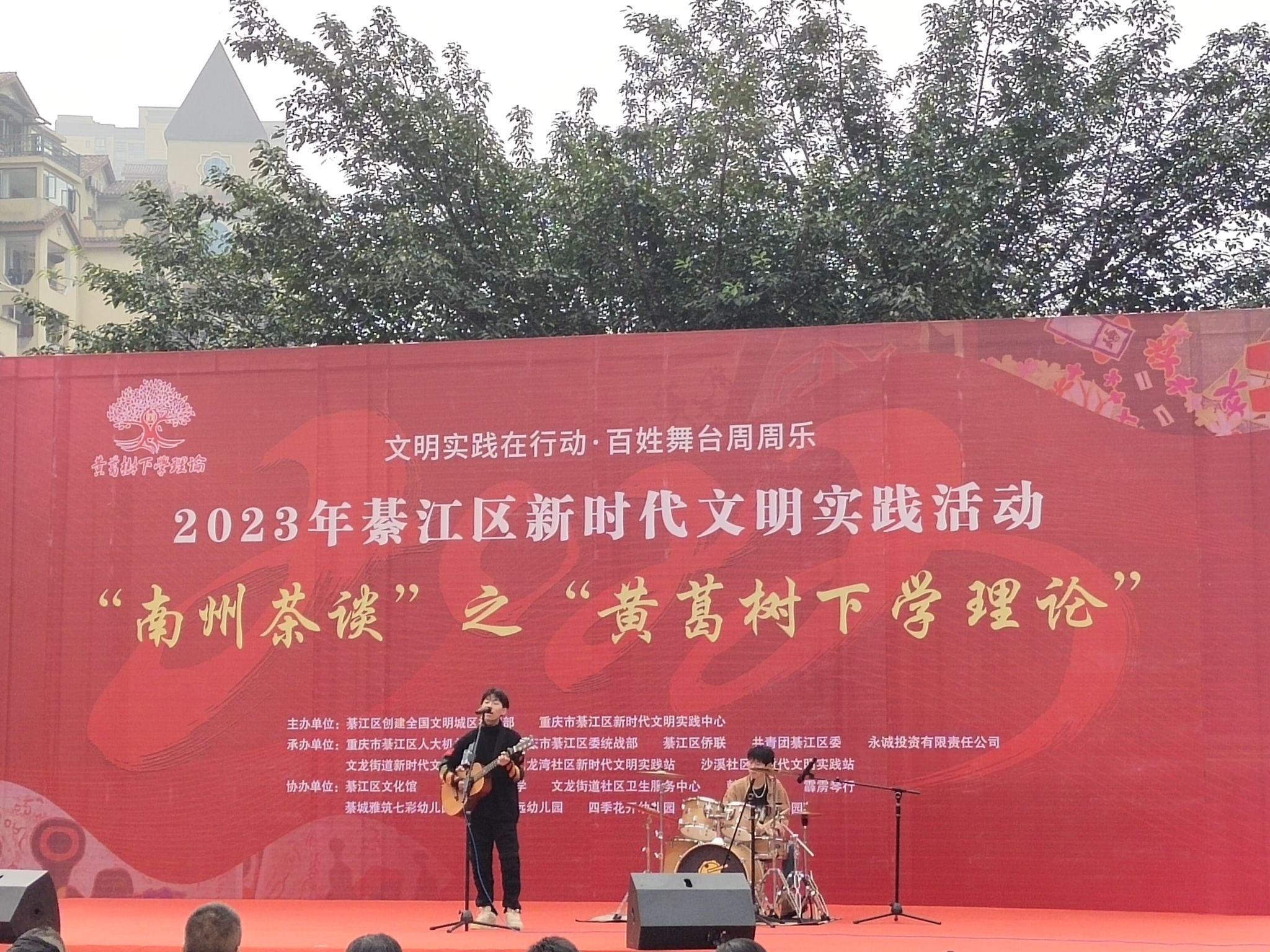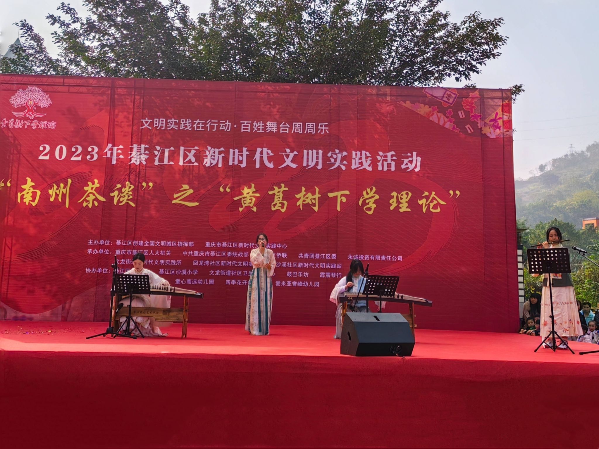 12月7日綦江区沙溪公园正在开展一场别开生面的文艺汇演,上千名群众齐聚于此。精彩纷呈的表演节目交替上演,欢呼声、鼓劲声此起彼伏。为展现“利刃新发”之势,传递青春朝气,重庆移通学院信息安全学院青年志愿者协会联合文艺部,前往文龙街道沙溪公园助力“文明实践在行动,百姓舞台周周乐”2023年綦江区新时代文明实践“南州茶谈”之“黄葛树下学理论”活动。