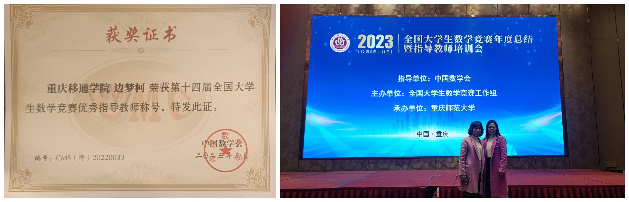为积极响应实施学校“领航者培训计划”,提升公共基础教学部数学研室教师对全国大学生数学竞赛的组织和指导能力,提高学生学科竞赛获奖率,公共基础教学部副主任陈玲率领数学教研室主任边梦柯参加了12月9-10日的《2023年全国大学生数学竞赛年度总结暨指导教师培训会》线下会议,此次会议中,边老师荣获中国数学会颁发的第十四届全国大学生数学竞赛“优秀指导教师”称号。