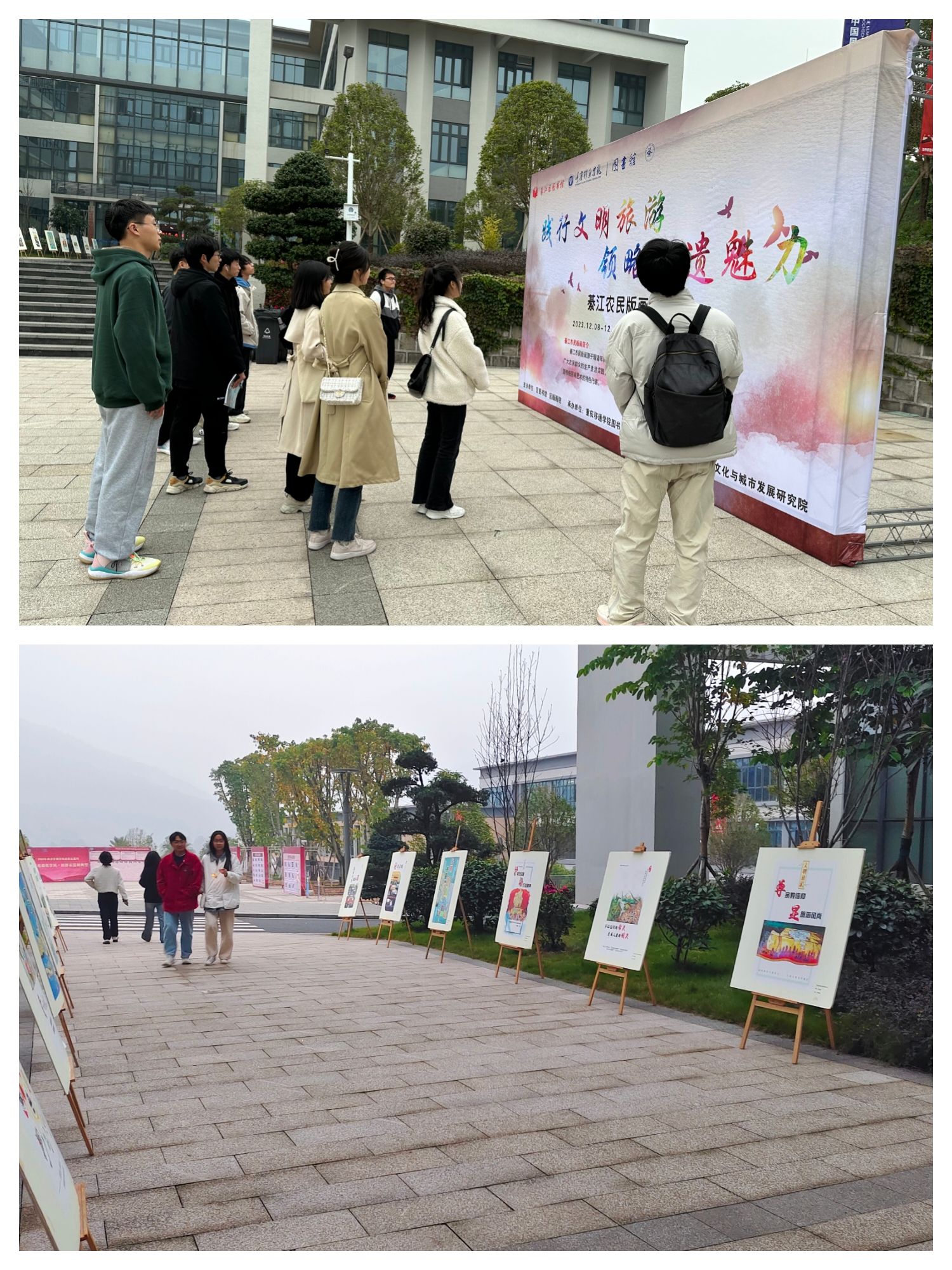 为推广传统文化,传承传播非物质文化遗产,让同学们对非物质文化遗产有更形象、直观地认识和了解,从而进一步提高大学生群体对非物质文化遗产的保护意识,重庆移通学院图书馆联合綦江区图书馆、綦江区版画院以及地域文化与城市发展研究院于12月8日至12月10日,共同举办了一场名为“践行文明旅游,领略非遗魅力”为期三天的綦江农民版画展,此次艺术盛宴在重庆移通学院图书馆广场隆重拉开帷幕。