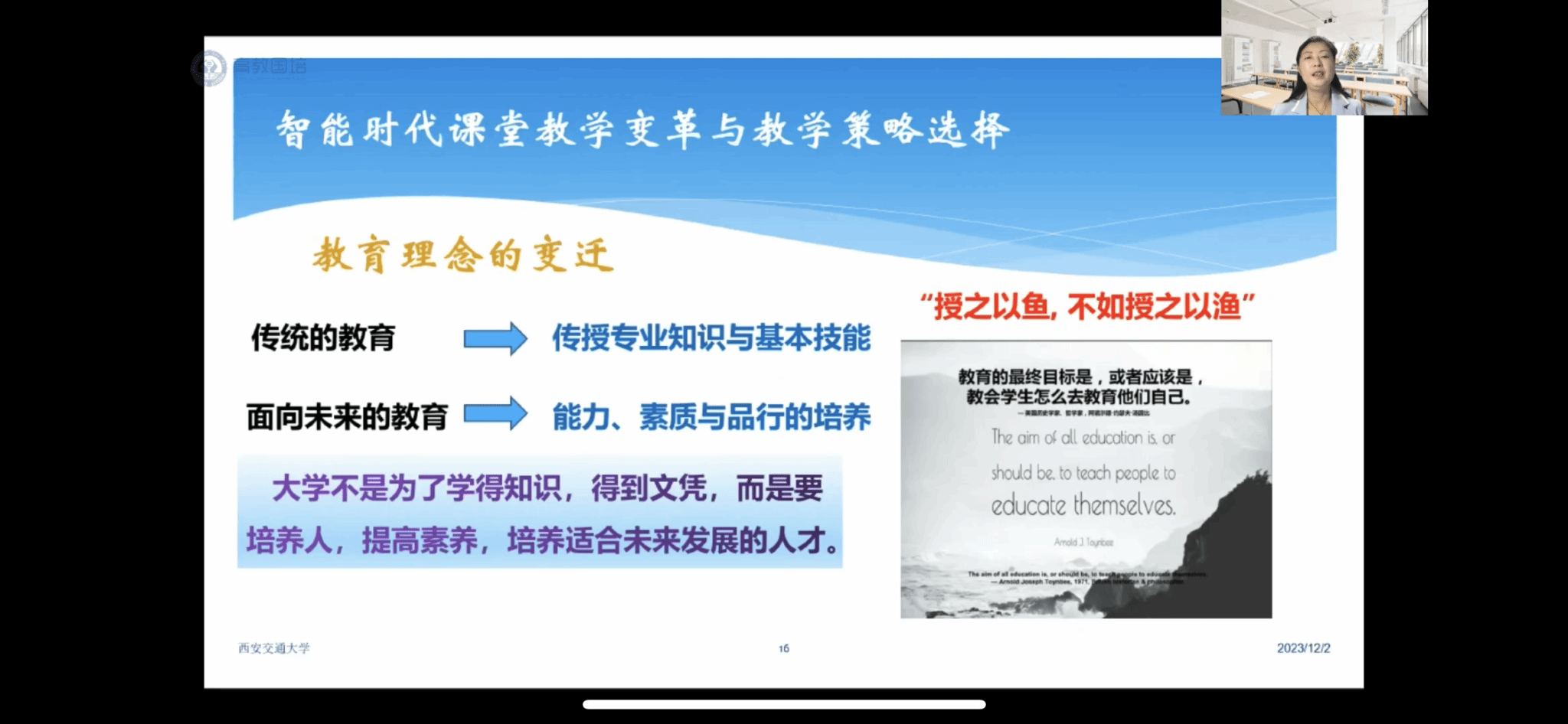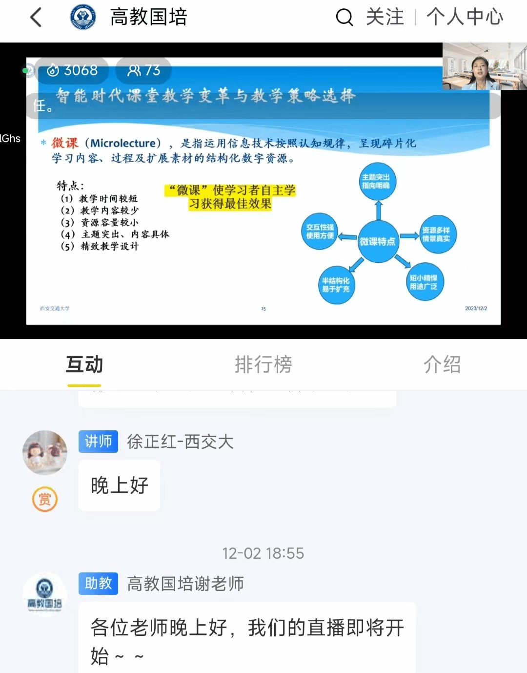 12月2日,由西安交通大学徐正红副教授讲解《核心素养视域下中青年教师角色认知与教学策略选择》,徐教授主要谈到以下内容:中青年教师角色认知和职业规划、一个好老师应该具备的核心素养、智能时代课堂教学变革与教学策略选择、中青年教师面临的现实状况与注意事项。情景模拟教学是一种非常实用的教学策略。通过模拟真实场景,让学生参与到其中,这种方式不仅可以激发学生的学习兴趣,还可以培养学生的实践能力和问题解决能力。在培训中,我学到了如何设计情景模拟教学,包括场景设计、角色分配、问题设置等环节。