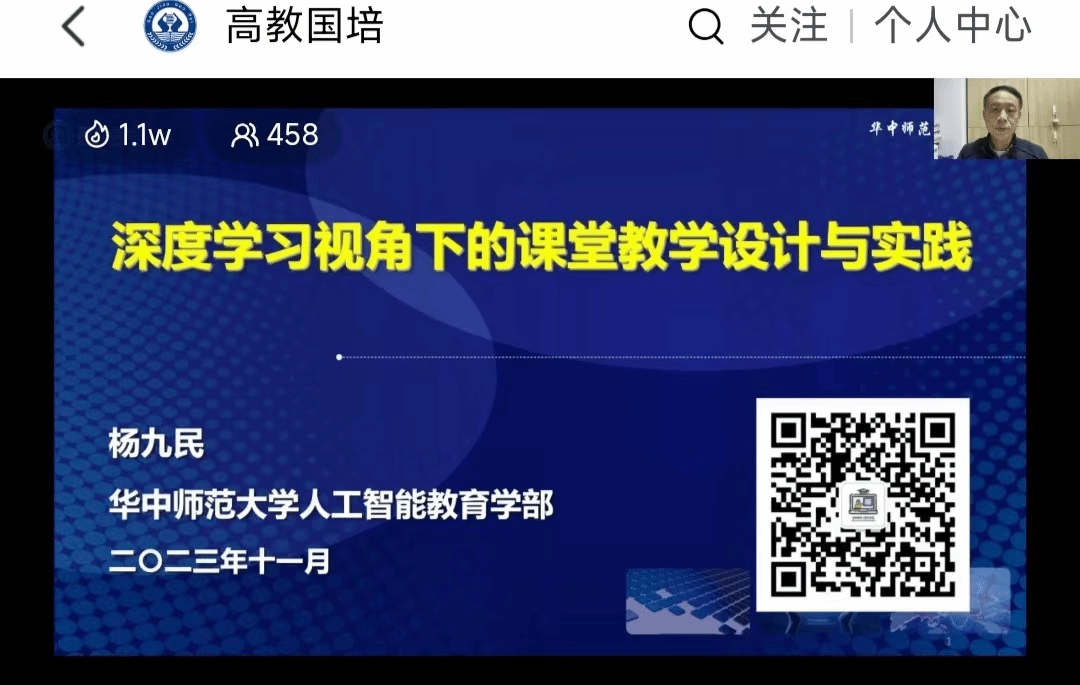 第一天的课程是华中师范大学杨九民教授讲解《深度学习视角下的课堂教学设计创新与模式重构》,杨教师主要谈到五个方面的内容:基于深度学习的混合式教学目标制定、基于深度学习的混合式教学模式设计、基于深度学习的教学设计创新与实践、基于深度学习的多元化评价体系设计、基于深度学习的混合式教学案例分享。他强调以学生为中心的教学理念强调学生的主体性,要求老师在设计教学时,要充分考虑到学生的需求和特点,激发学生的学习兴趣和主动性。