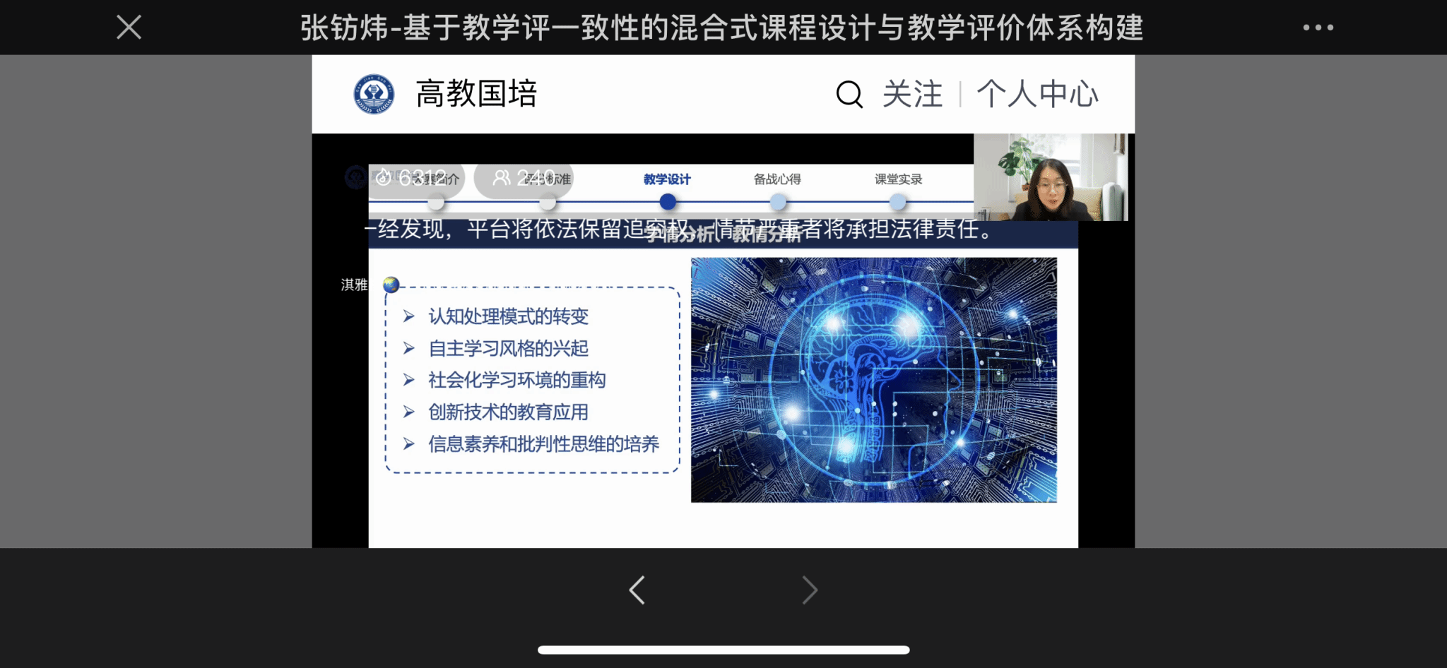 12月3日,由北京大学冯菲老师分享《基于教学评一致性的混合式课程设计与教学评价体系构建》,冯老师主要谈了以下几个方面的观点:混合式教学设计与教学策略解析、混合式教学的教情与学情分析、优质混合式课程设计结构和特征、混合式教学中教学评测具体步骤、混合式教学多元化和过程性评价。