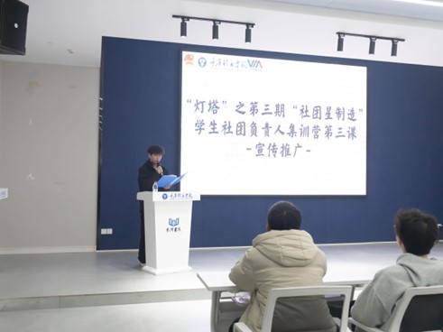 用文字搭建桥梁,撰华章引领宣传。为进一步提高学生社团负责人的宣传与推广能力,书写社团活动的绚丽篇章,12月13日学生社团管理中心于綦河书院二号楼观涛·多功能报告厅开展了“灯塔”之第三期“社团星制造”学生社团负责人集训营第三课——《宣传推广》。
