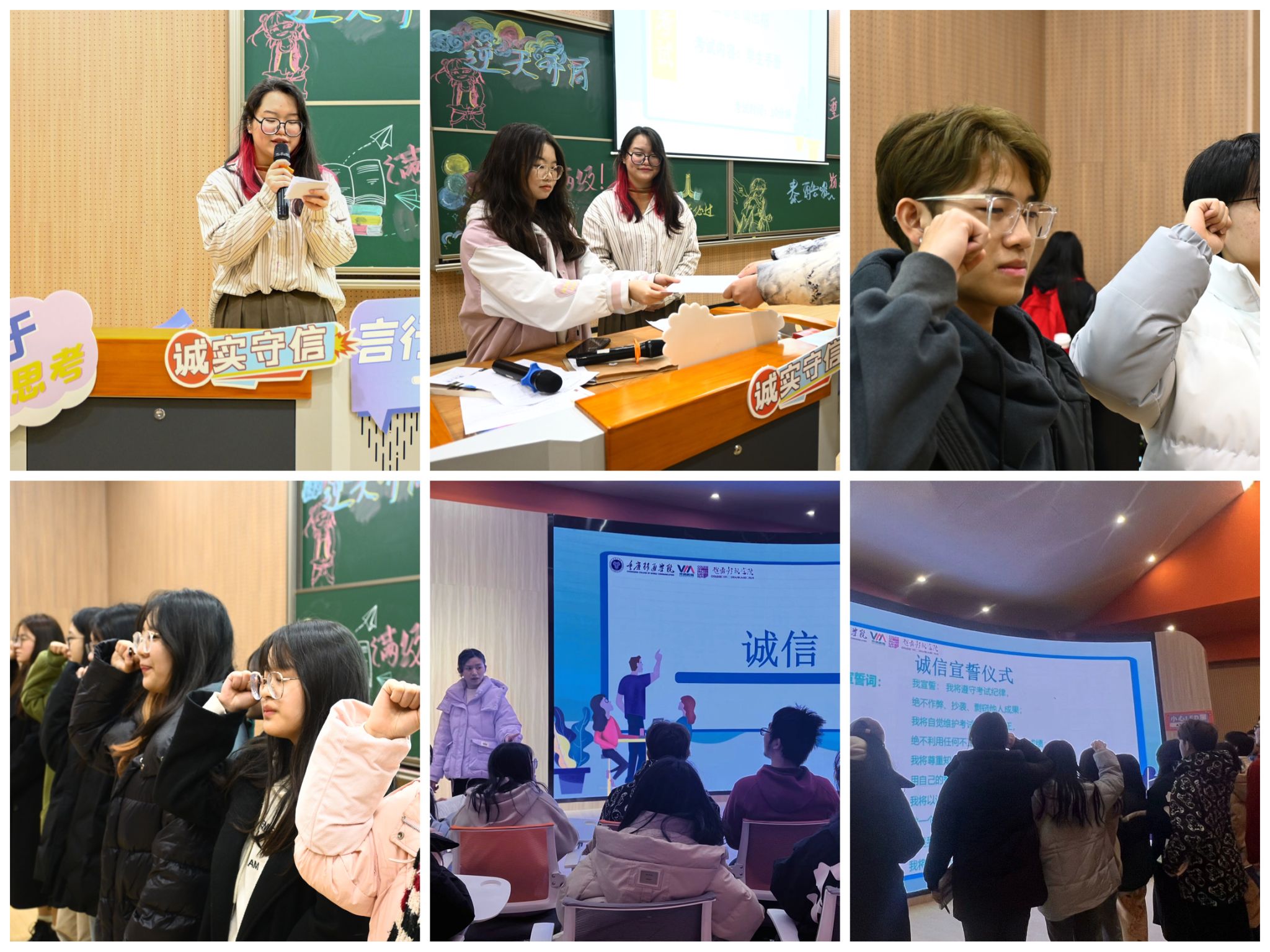 以诚育人,以信立教,环境育人促学风。为深入培育践行社会主义核心价值观,大力弘扬诚实守信的中华传统美德,增强学生的诚信意识,培养学生的诚信品质,戏剧影视学院同股哟班导师组织诚信年级会组织学生宣誓,围绕考风考纪建设、临考心态调整等方面以多种形式开展诚信主题教育,通过学生手册考试强化学生的诚信意识,组织学生到办公室签订《戏剧影视学院学生诚信考试承诺书》,引导学生端正态度、严谨求实。