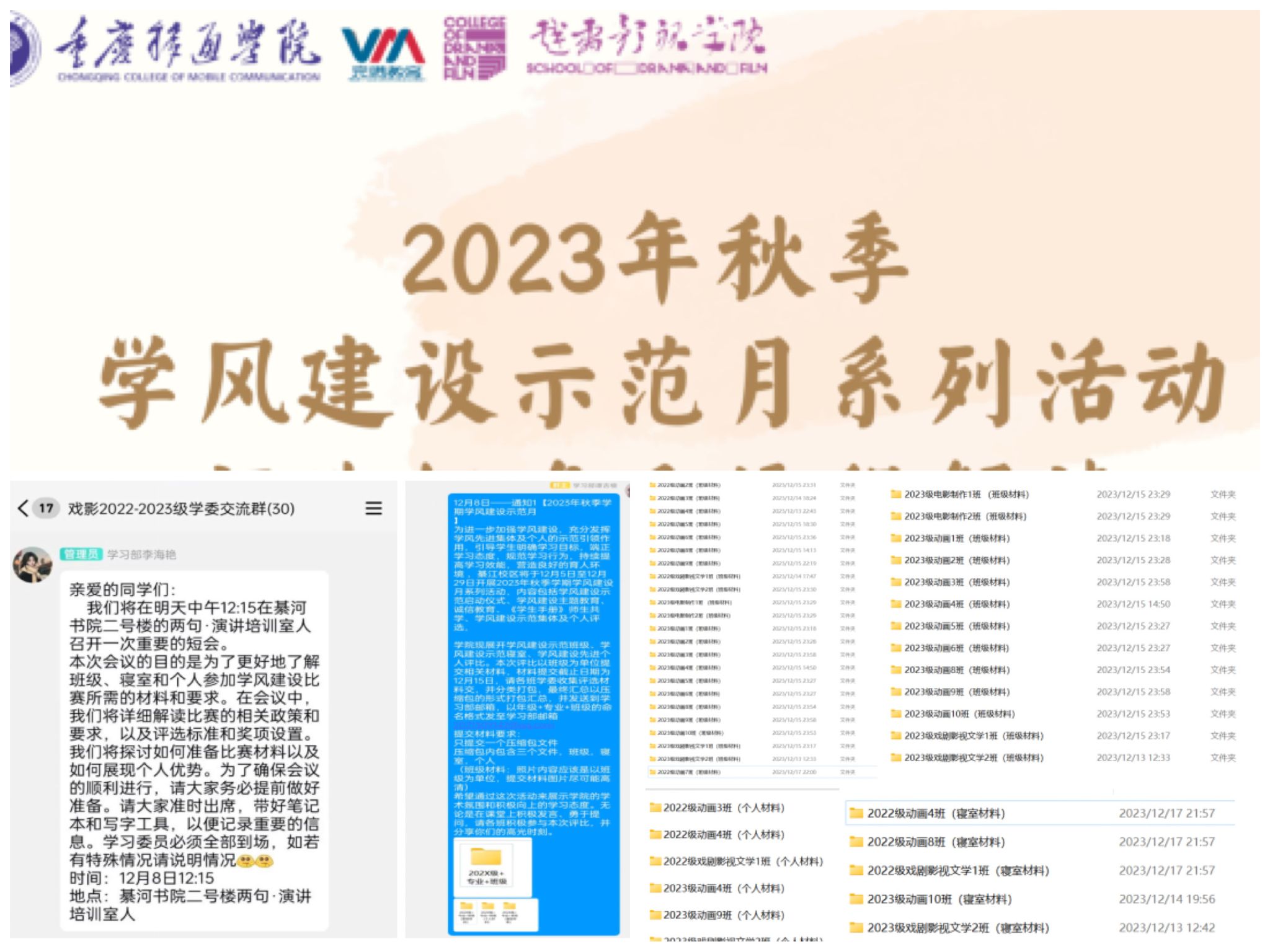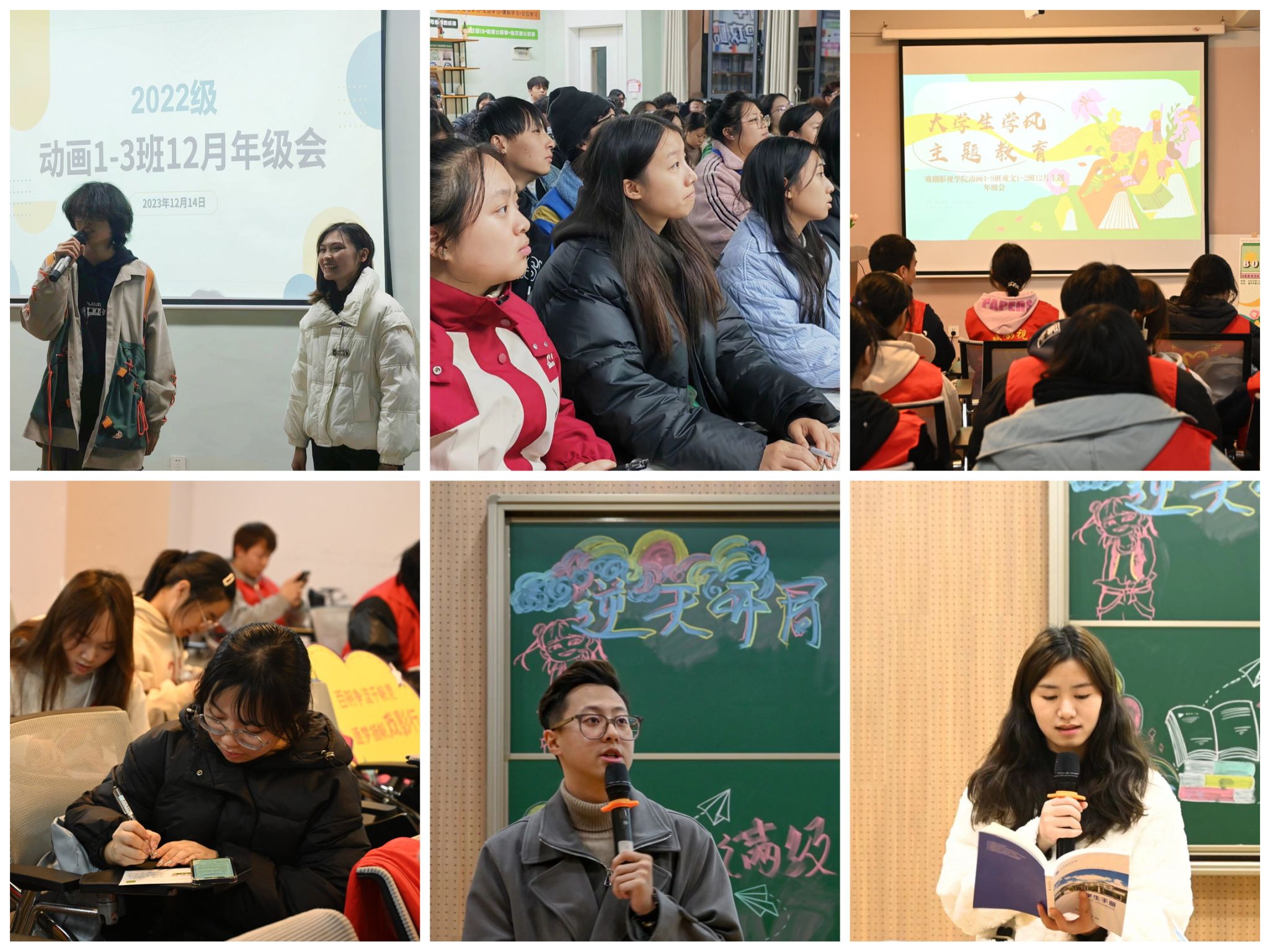 1、思想引领,知行合一,戏影学风有凝聚。12月,学院4名辅导员分别在横山书院、古剑书院、贤者楼报告厅开展“学风+主题教育”年级会,引导学生遵守课堂纪律,建立优良班风学风,加强期末复习,提高上课效率。