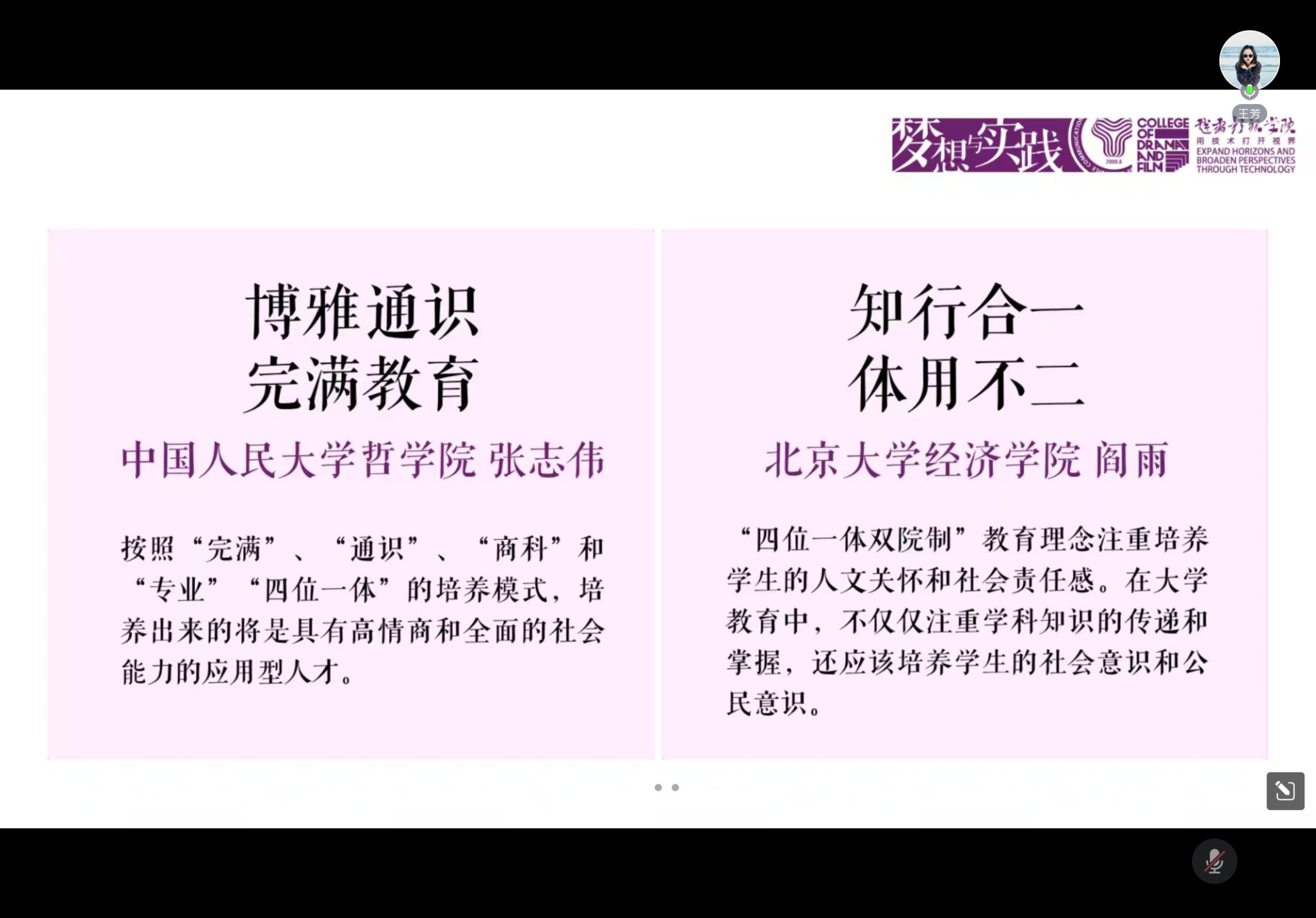 为切实学习彭董事长相关讲话,促进戏剧影视学院全体教师将个人发展与学校理念充分融合。同时,借此机会在本年度全面总结本学期各项重点工作,跟进期末工作落实情况,明确学期末各项工作职责与目标,保障学院期末各项工作顺利开展。戏剧影视学院于2023年12月29日上午,召开了《名家、名师评<梦想与实践>》主题交流学习会暨2023-2024学年第1学期期末工作线上会议。戏剧影视学院全体教工、学工成员参加了本次会议。