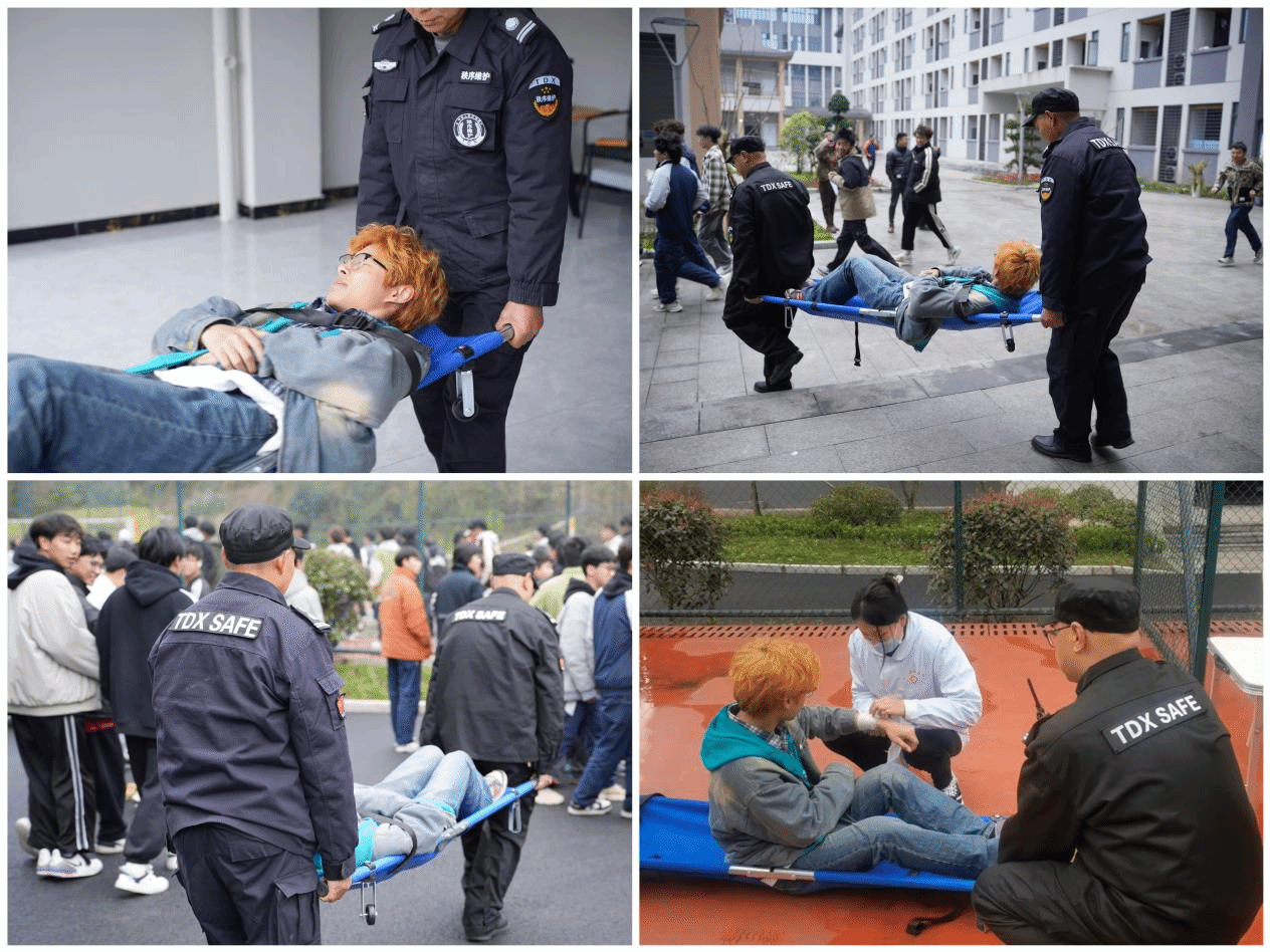 此次活动紧密结合军训工作与消防安全教育,将消防演练前置到校内学生宿舍楼进行,以古剑书院宿舍一楼电路故障起火为背景。3月7日下午14时,在排查现场无误后,消防应急疏散演练正式开始。现场模拟发现火情,消防控制室接到火警信息后及时通知巡逻人员进行跑点确认。确认发生火情后,巡逻人员立即通知消防控制室值班人员启动火警火灾应急预案,呼叫校园志愿消防队前往支援,启动消防联动控制系统并报警。疏散组及时对楼内师生进行有序疏散,志愿消防队迅速进入楼内火情核心区进行火灾扑灭,搜救受伤被困人员,转移伤员至安全区域。经大家协力配合,火灾被完全扑灭,受伤人员也全都被救出。演练中各部门人员密切配合、反应迅速、处理得当,检验了校区应急处置能力,历练了应急队伍,帮助师生积累了火灾疏散逃生的宝贵经验。