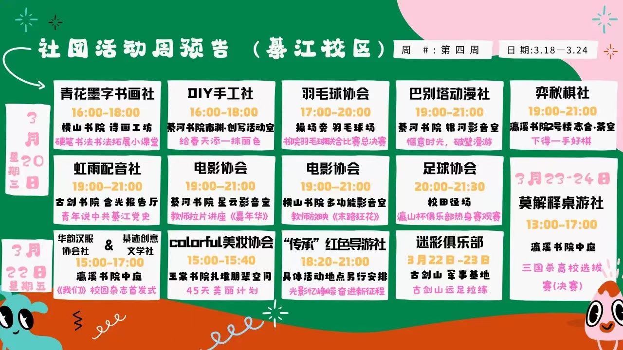 社团与你久违相见,所以显得格外珍重,平凡的生活总是需要调剂,意想不到的社团“惊喜”,是同学们一定不愿错过点燃激情的机会。宇宙山河浪漫,生活点滴温暖,每一刻都值得你我铭记与探索,这周的每一份浪漫,都由社团提供,快来康康这些活动,哪一个戳中了你的心巴!