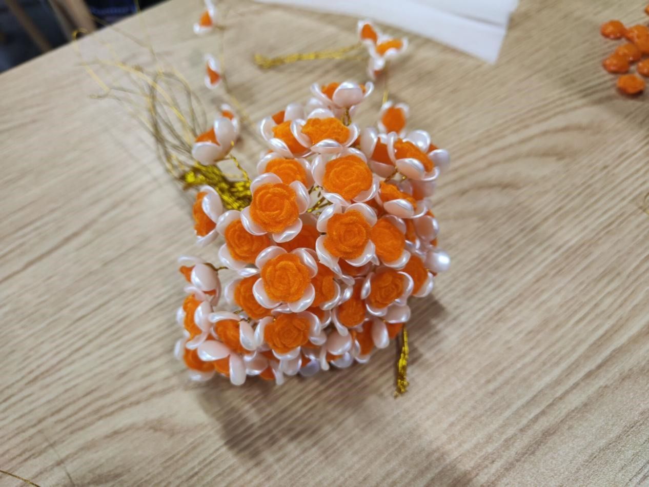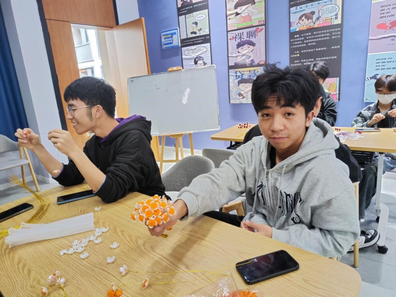 同学们自由组队一起合作完成作品,看着桌上摆放的工具,他们都已迫不及待的想自己动手制作。有人熟练的按照步骤制作,有人还在研究每一步的要求,每个人能力不同,进度也大相径庭,但是最后每个参与者都做出了属于自己的花束。过程中手工社成员们还现场进行了手工艺制作的教学和互动。他们耐心地讲解着每一个步骤,让参与者亲手体验手工艺制作的乐趣。这种教学方式不仅让同学们更加深入地了解了手工艺的魅力,同时也激发了他们对手工制作的热爱和尊重。看着原本杂乱的原料经过自己的双手焕然一新变成了美丽的花束,同学们心中的自豪和骄傲油然而生,这种成就感是独一无二的。