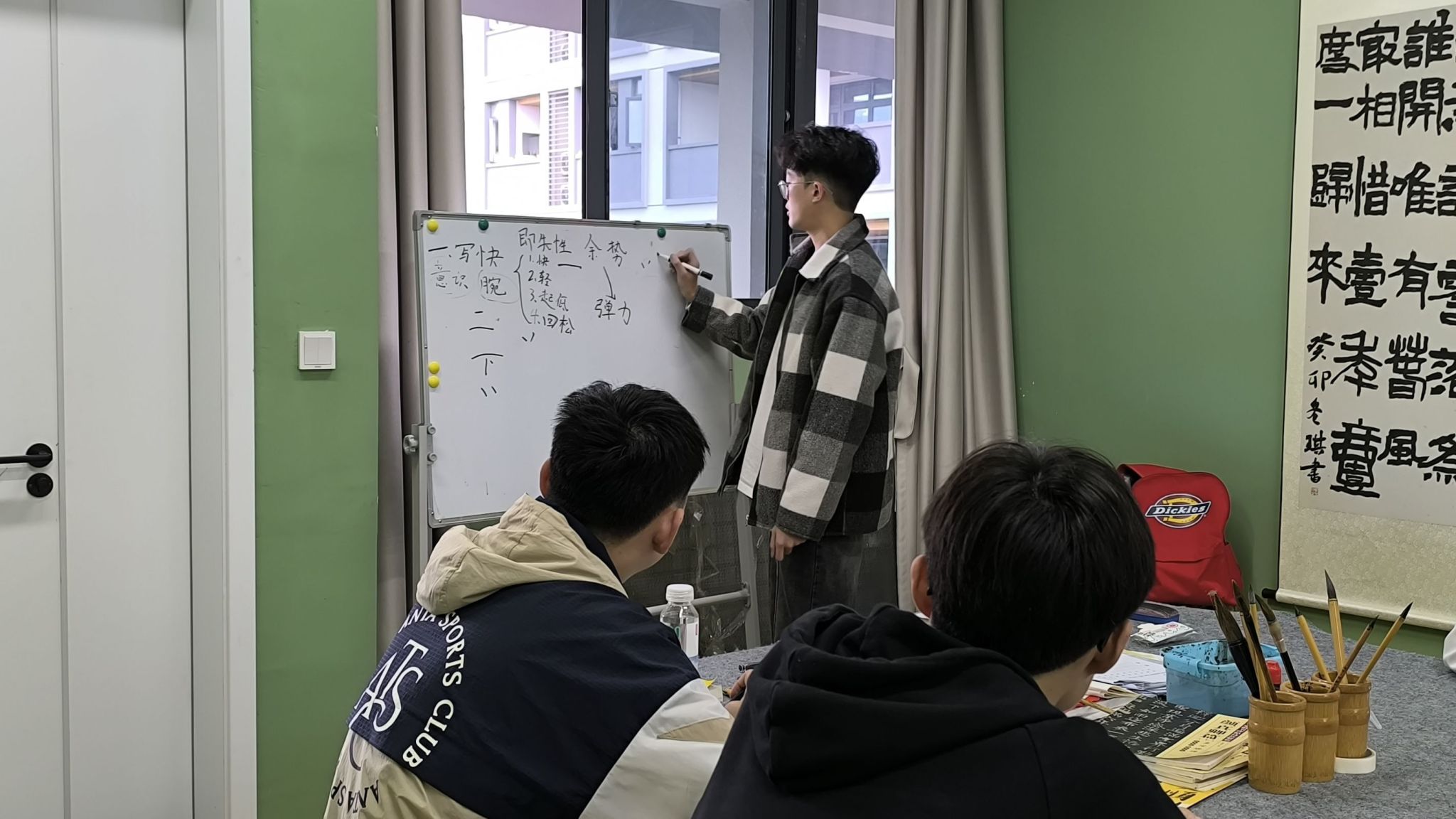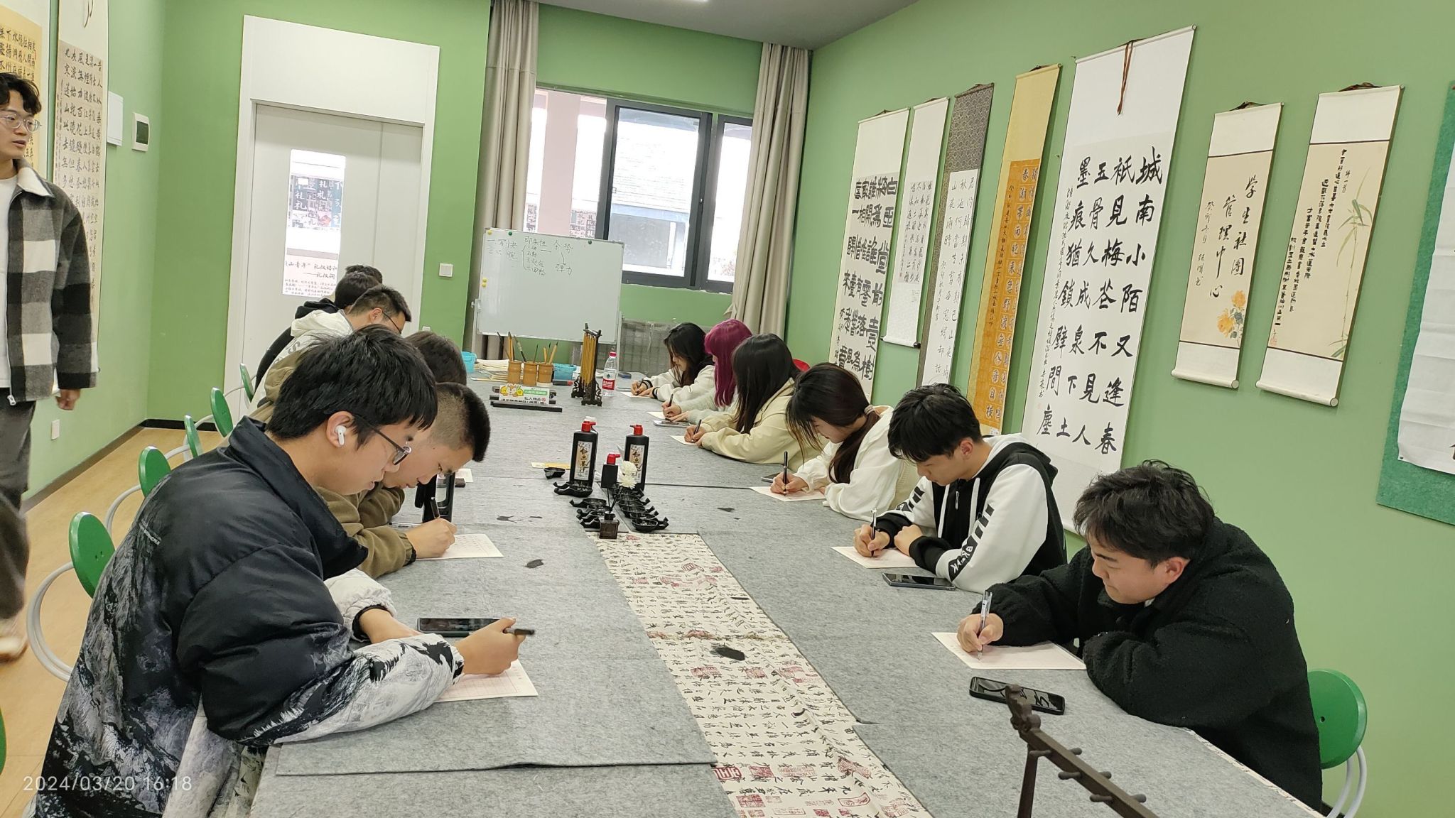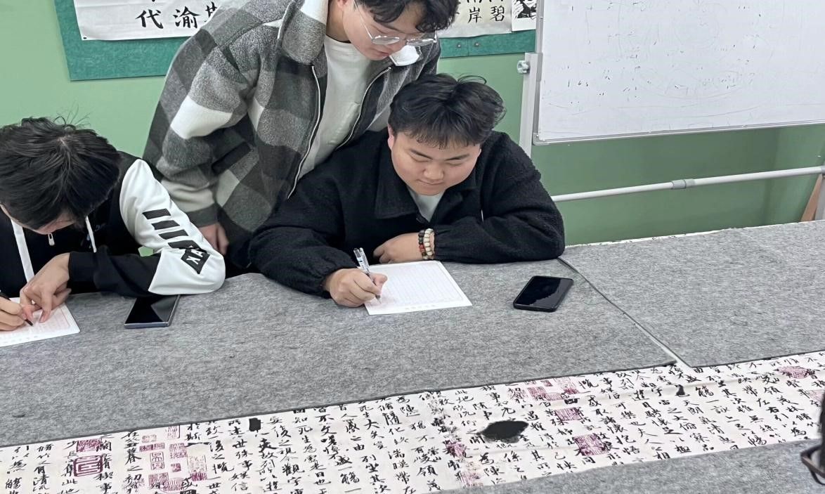 活动以现场书写指导的形式让同学们亲自领略中国千年的国文化。“春蚕到死丝方尽,蜡炬成灰泪始干”墙壁上挂着的书法作品与蒙绕满室的悠韵墨香让活动现场的书法文化氛围愈加浓厚。同学们好像都已深陷入了汉字的墨涌中,逐墨浪入晴空,引诗情到碧霄。书画社社长樊源杰多次强调,练字要先练习的是正楷。欧体的楷书,被冠以“天下第一楷书”之称,不要去盲目效仿“江湖字,即网络上那些深受部分年轻人青睐的“花体”“明星体”,正如启功先生所言:“学习书法,重要的是先学好楷书,不可先学草书,《辞海》一书中同样解释说它“形体方正,笔画平直,可作楷模。在活动现场,同学们秀丽疏朗、倚侧秀逸的书法作品以及潇洒俊逸、挺拔刚劲的作品被一一呈现,无一不展示着汉字的深厚底蕴。同时,也透露出同学们对书法文化的热情与热爱。
