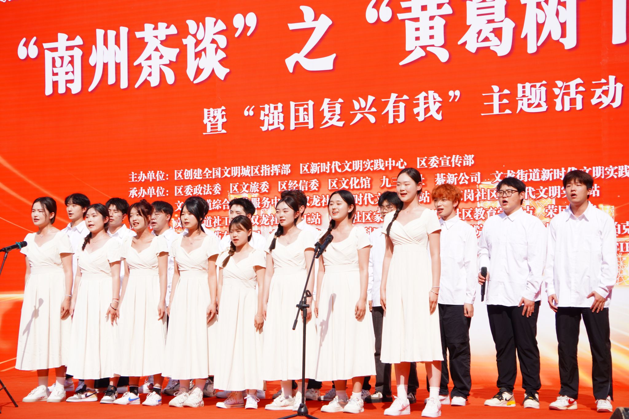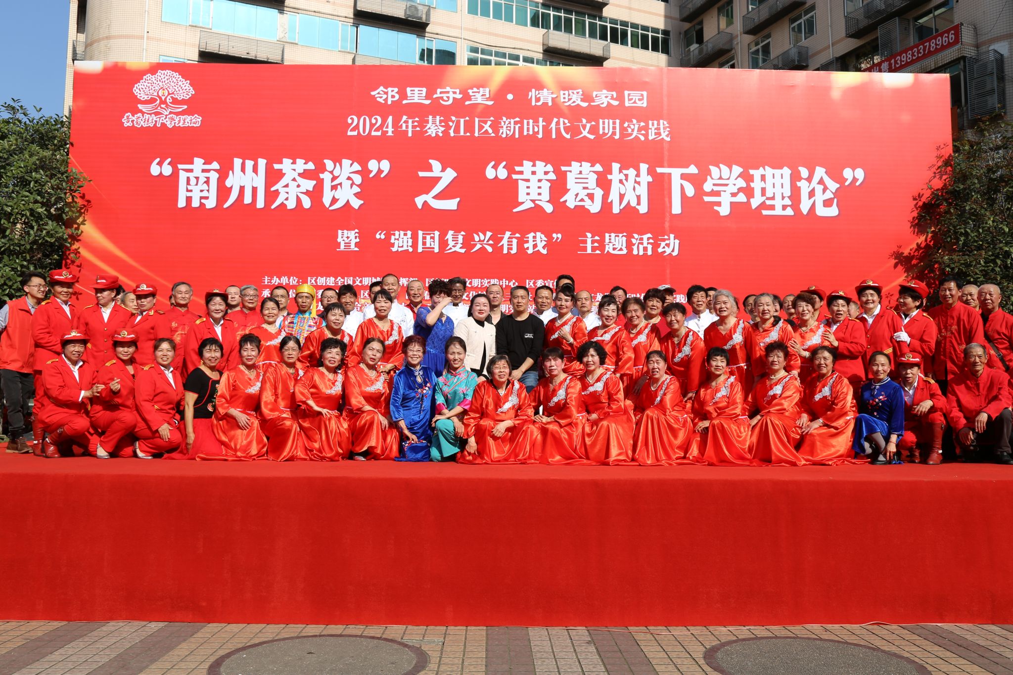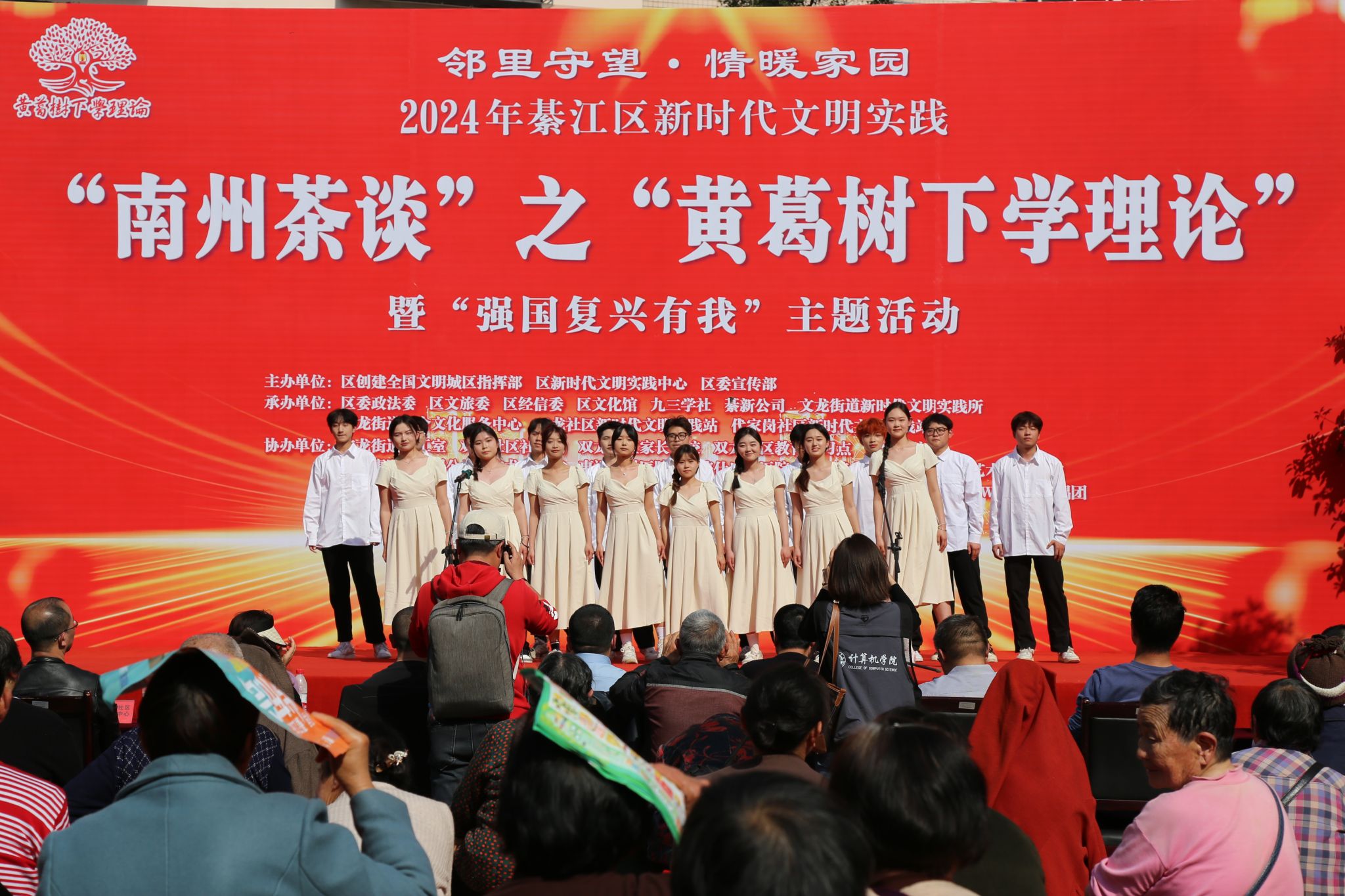 为深入学习贯彻习近平新时代中国特色社会主义思想,积极培育和践行社会主义核心价值观,大力弘扬中华优秀传统文化,并营造全国文明城区创建的浓厚氛围,增进民生福祉,计算机学院青年志愿者协会联合学院Fireworks合唱团参加綦江区志愿服务项目“南州茶谈”之“黄葛树下学理论”邻里守望、情暖家园活动,于2024年3月21日在綦江区文龙街道巨龙广场精彩呈现。本次活动主题围绕“强国复兴有我”,充分展示綦江区在新时代文明实践中的新风貌和成果。