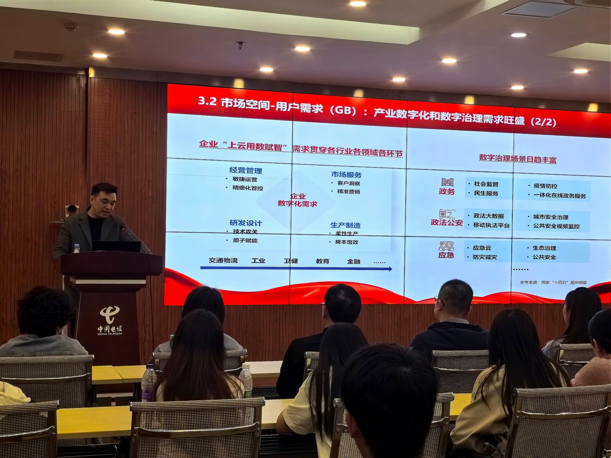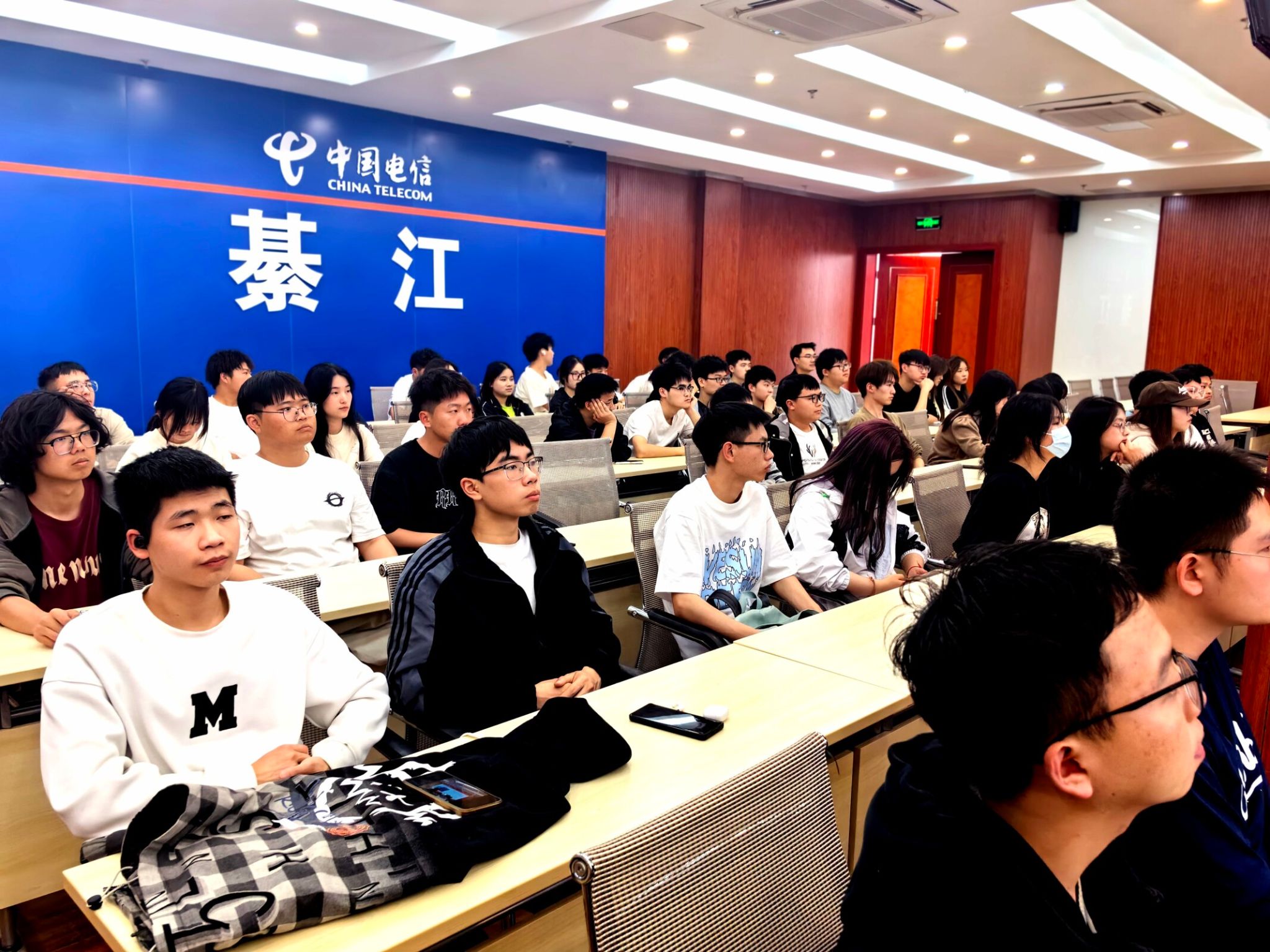 一踏入企业,学生们便被公司的现代化气息所吸引。云中台李俊颉副经理首先向学生们介绍了公司的发展历程、规模现状、主要客户、企业资质以及硬件产品等基本情况。领导强调,作为国内领先的电信运营商,中国电信始终坚持创新驱动,致力于提供优质的通信服务,推动数字化转型。