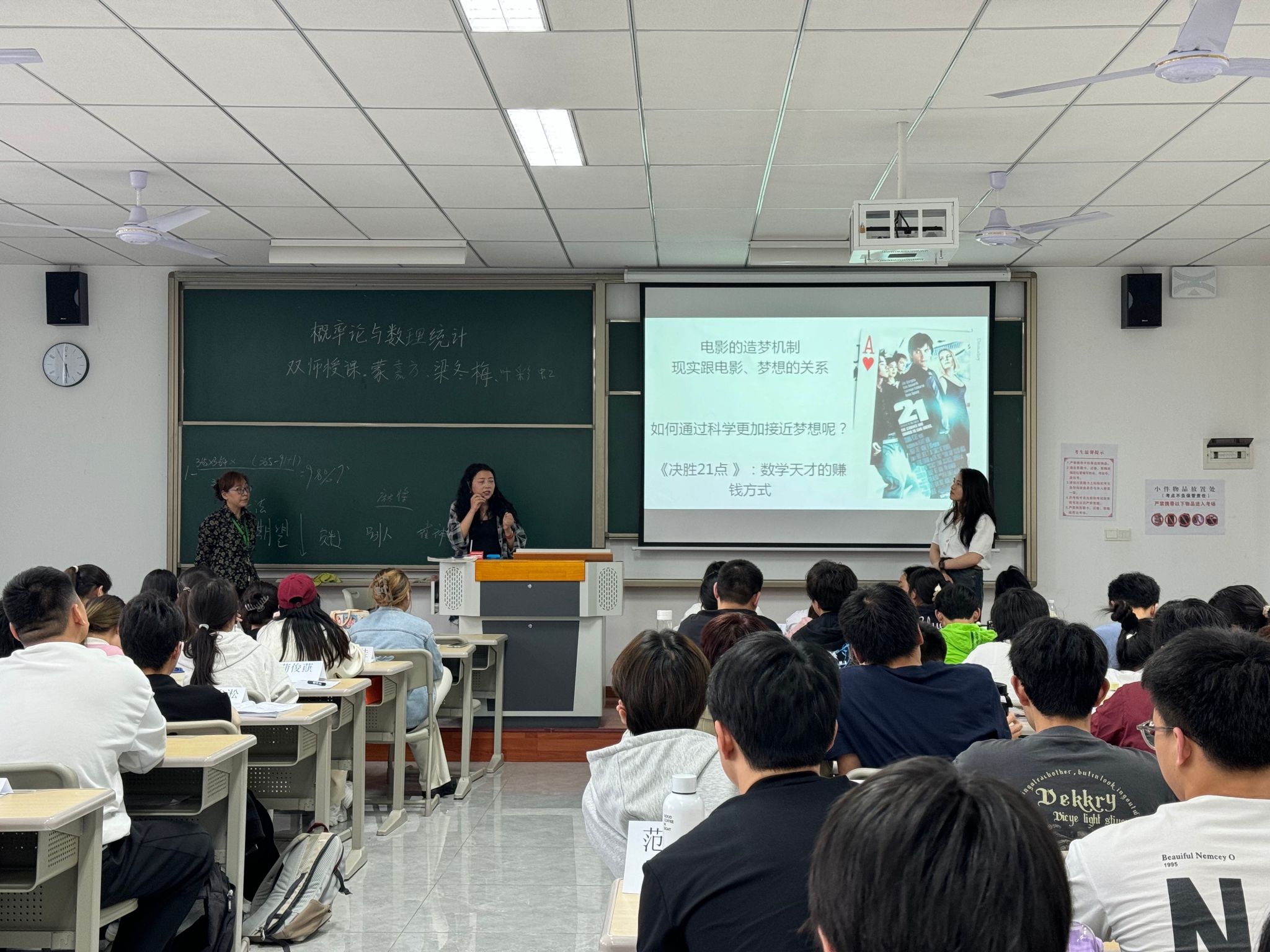 深入实践概率论,使数学理论融入生活,揭示背后的不可思议现象与理论的奇妙共生。这是公共基础教学部蒙嘉方老师贯彻的教学理念。4月2日下午,蒙嘉方老师邀请叶彩虹老师与电影评论中心梁冬梅老师,在2022级虚拟现实技术123班的《概率论与数理统计》课程上共同呈现了一次别具匠心的跨学科课程融合。