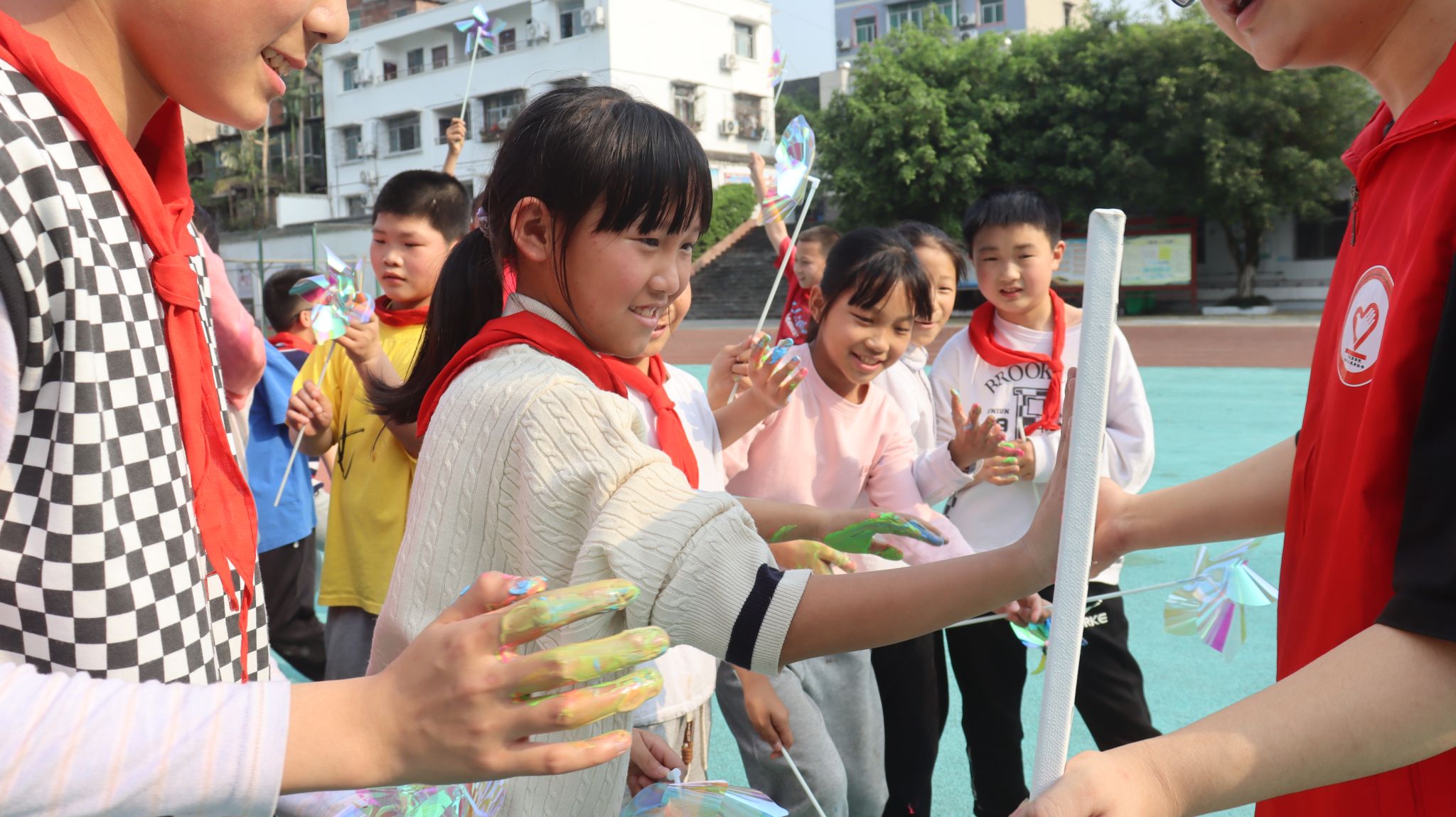 从教室奔向操场,孩子们脸上洋溢着灿烂的笑容。风吹动风筝,哗哗作响,本次课程也迎来了尾声。大家争先恐后在纯白画板上印下五颜六色的掌印,稚嫩的手掌与年少的自己签订了一个流光溢彩的约定。电影美育摄影团队将这一幕完整的记录下来,这是孩子们自己的电影。