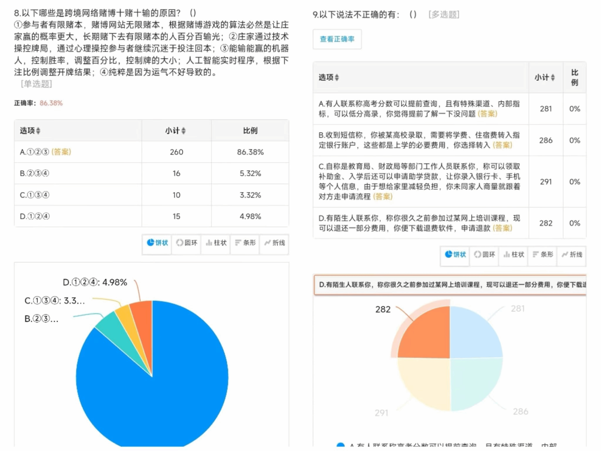 此次反诈咖啡体验日活动共计收到有效问卷301份,通过对问卷分析发现,绝大多数在校大学生对于诈骗信息都有较强的识别能力,对于分辨网络诈骗、“杀猪盘”、网络兼职、网购退款等诈骗信息都有较高的防诈意识。